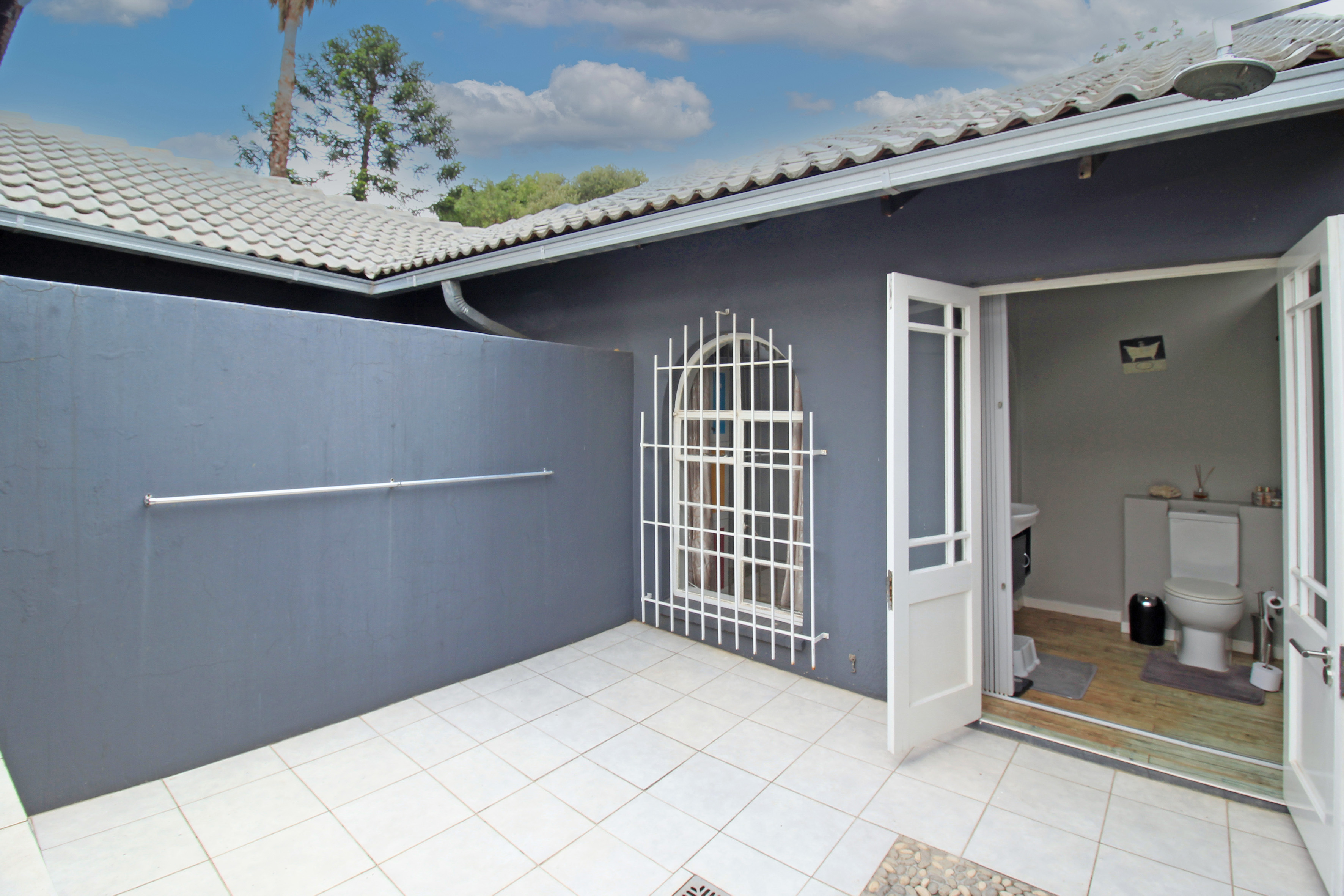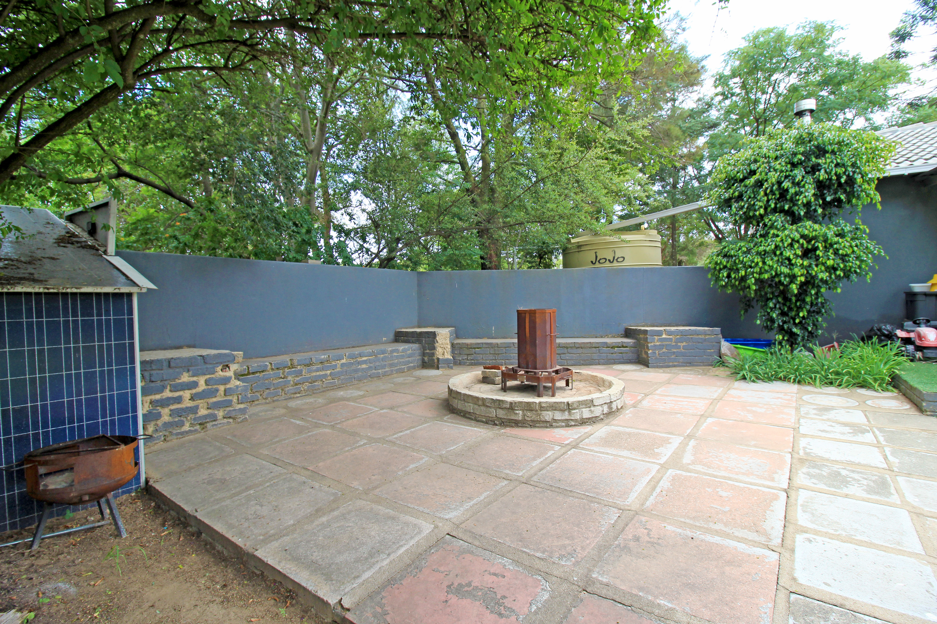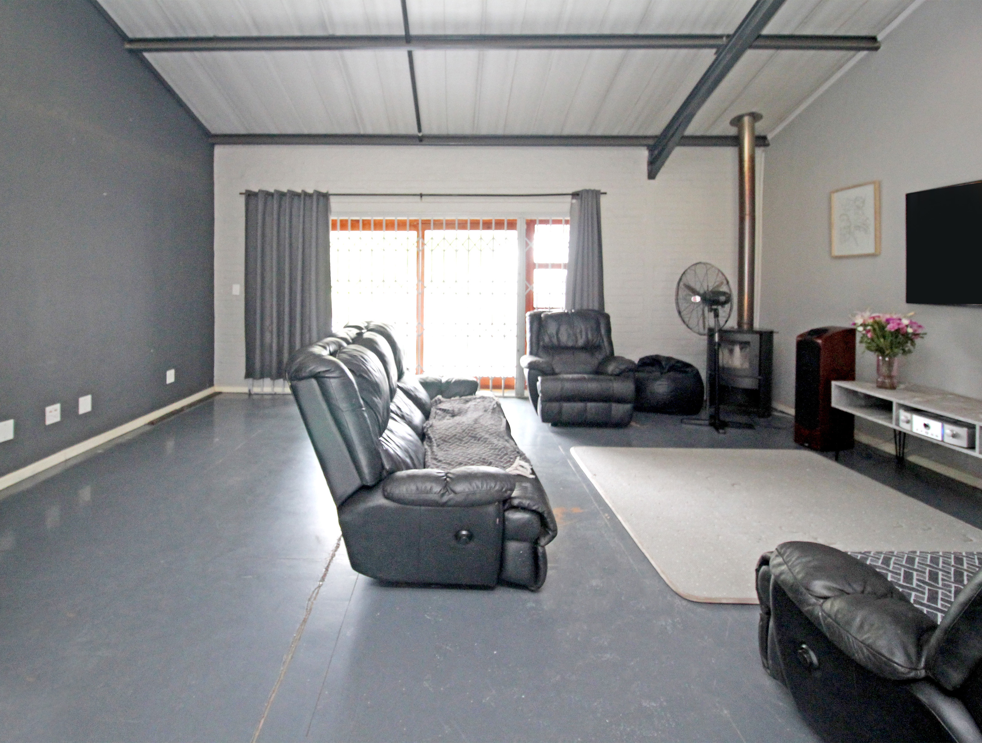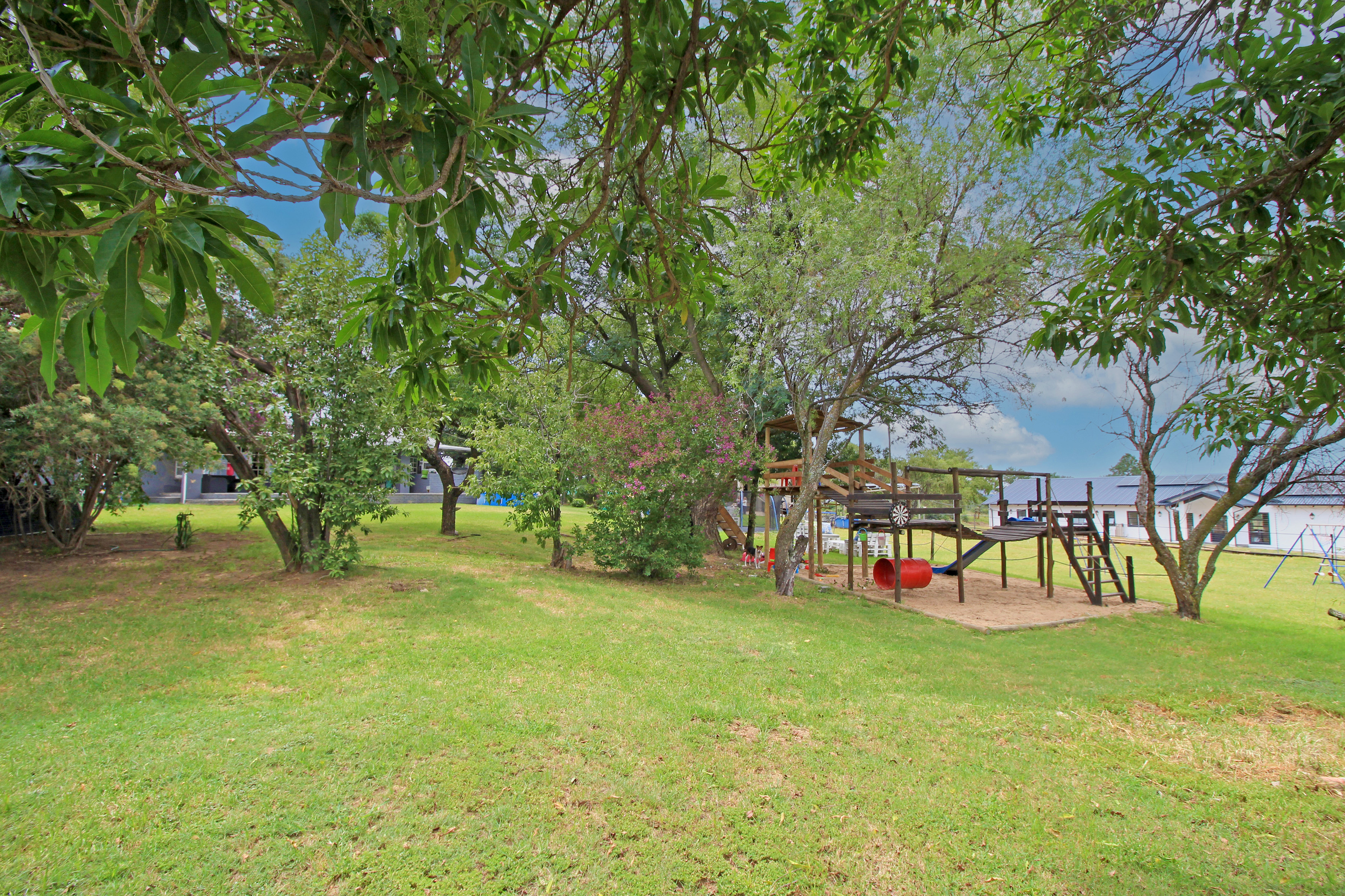 The TV room, dining area, and kitchen all feature doors that open onto a spacious, covered patio, thoughtfully divided into zones. The first zone is a dedicated play area for children, while the dining area and outdoor kitchen—complete with a gas braai, pizza oven, outside sink and food preparation area—offer the perfect space for entertaining.