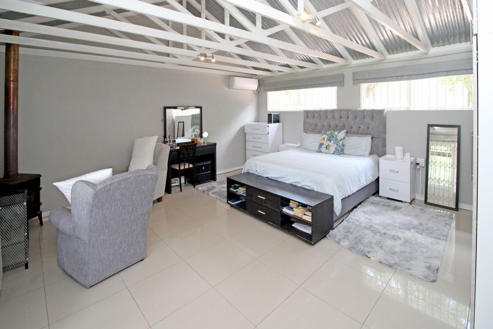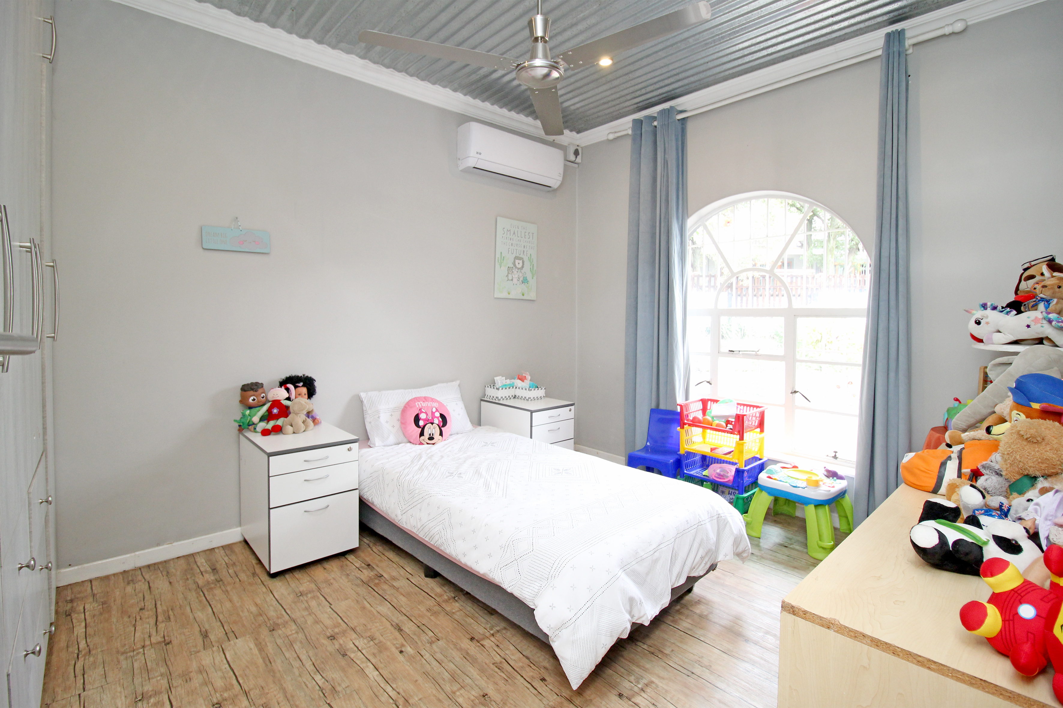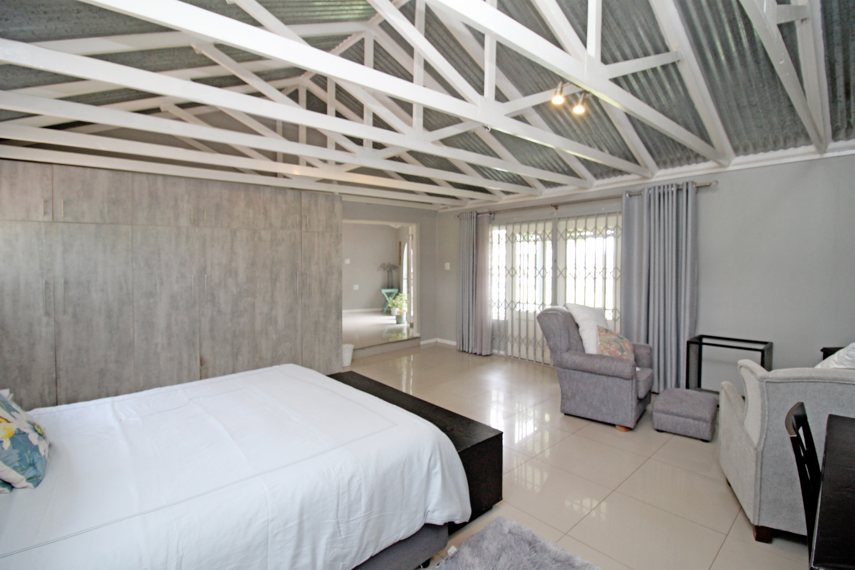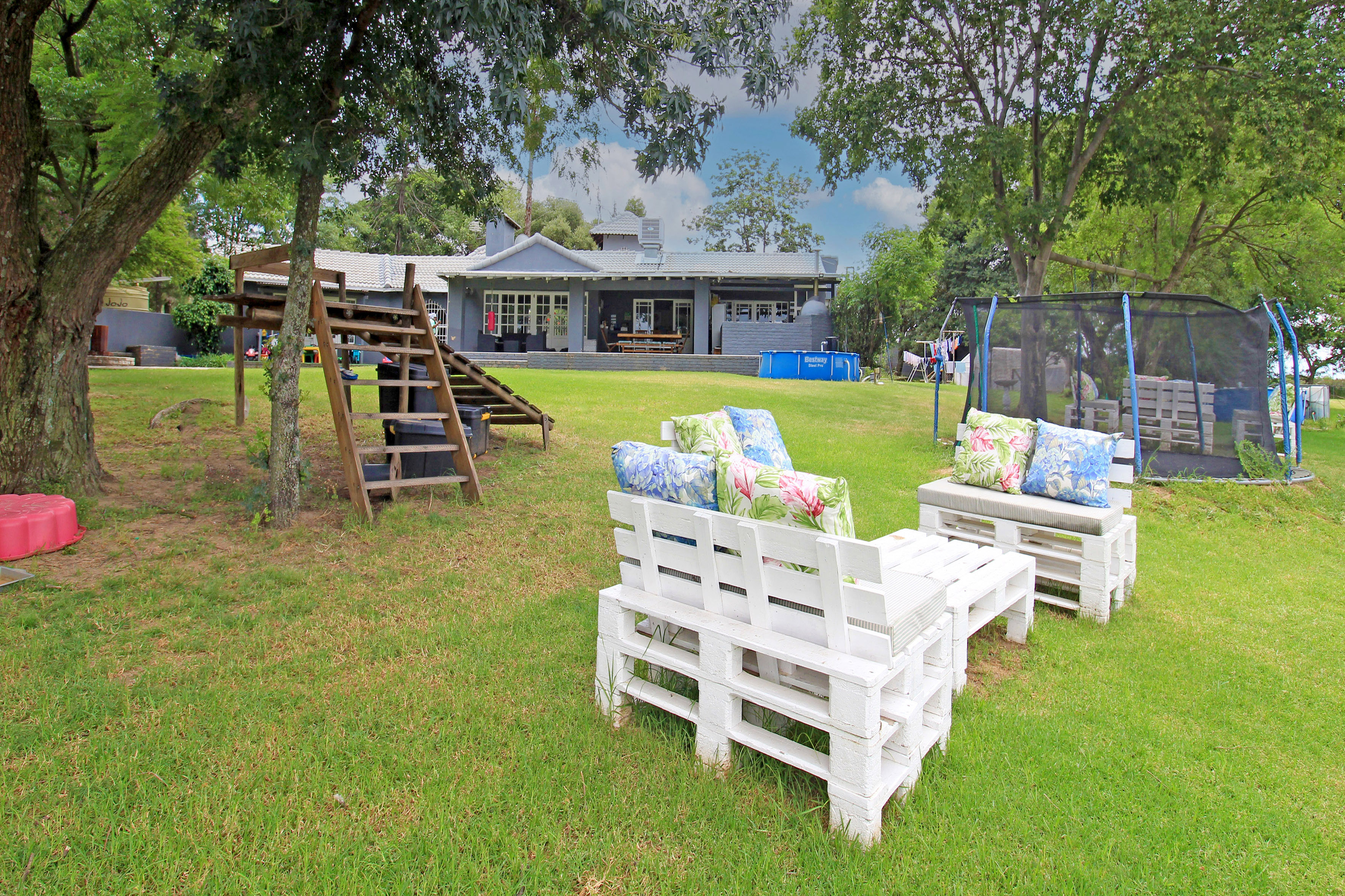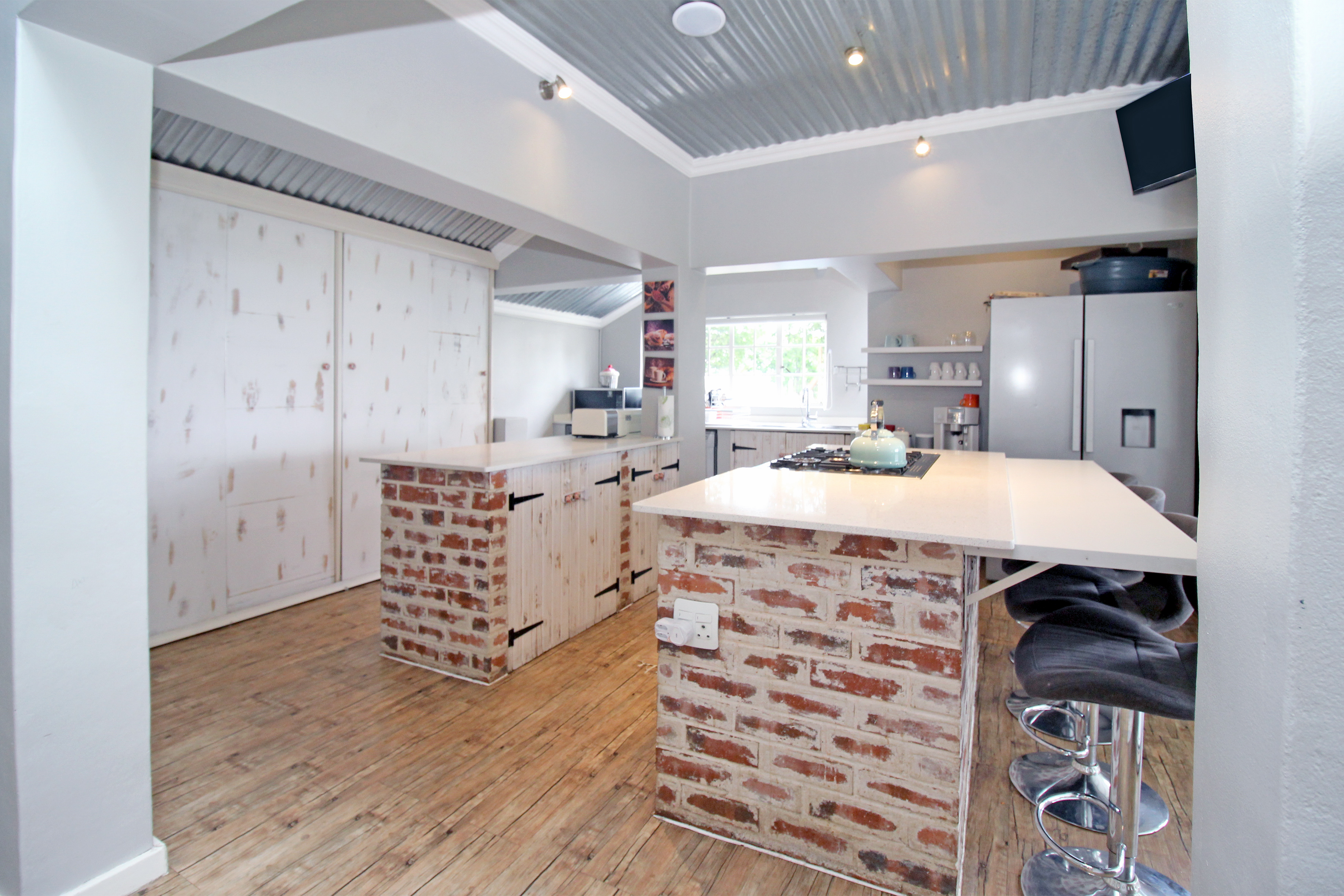 The TV room, dining area, and kitchen all feature doors that open onto a spacious, covered patio, thoughtfully divided into zones. The first zone is a dedicated play area for children, while the dining area and outdoor kitchen—complete with a gas braai, pizza oven, outside sink and food preparation area—offer the perfect space for entertaining.