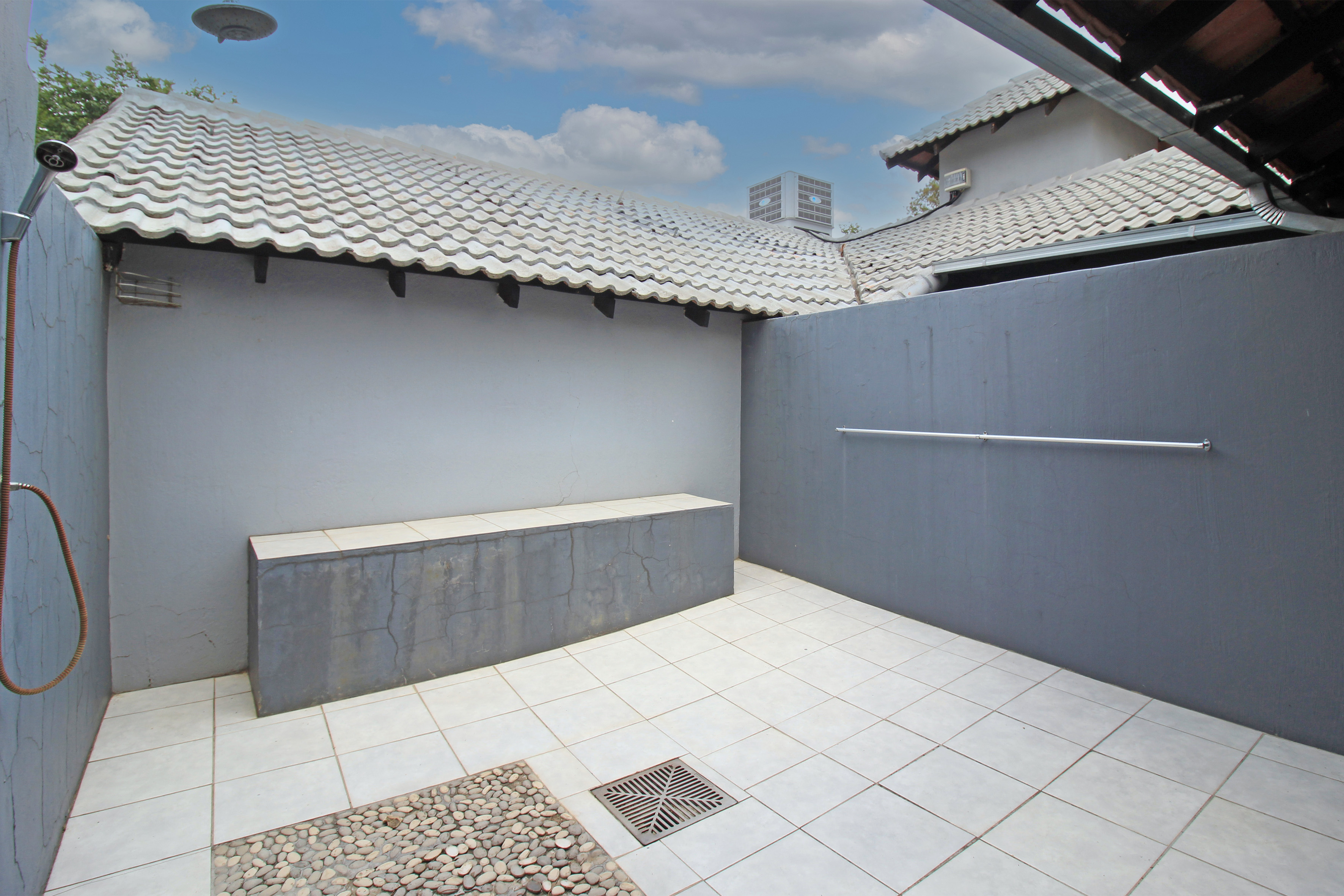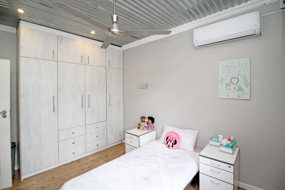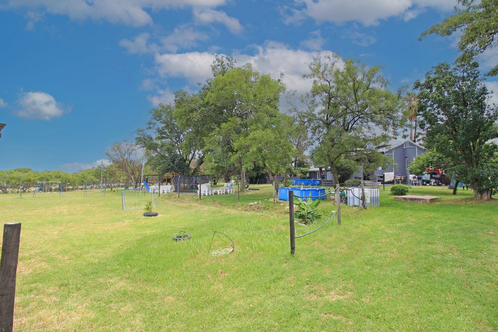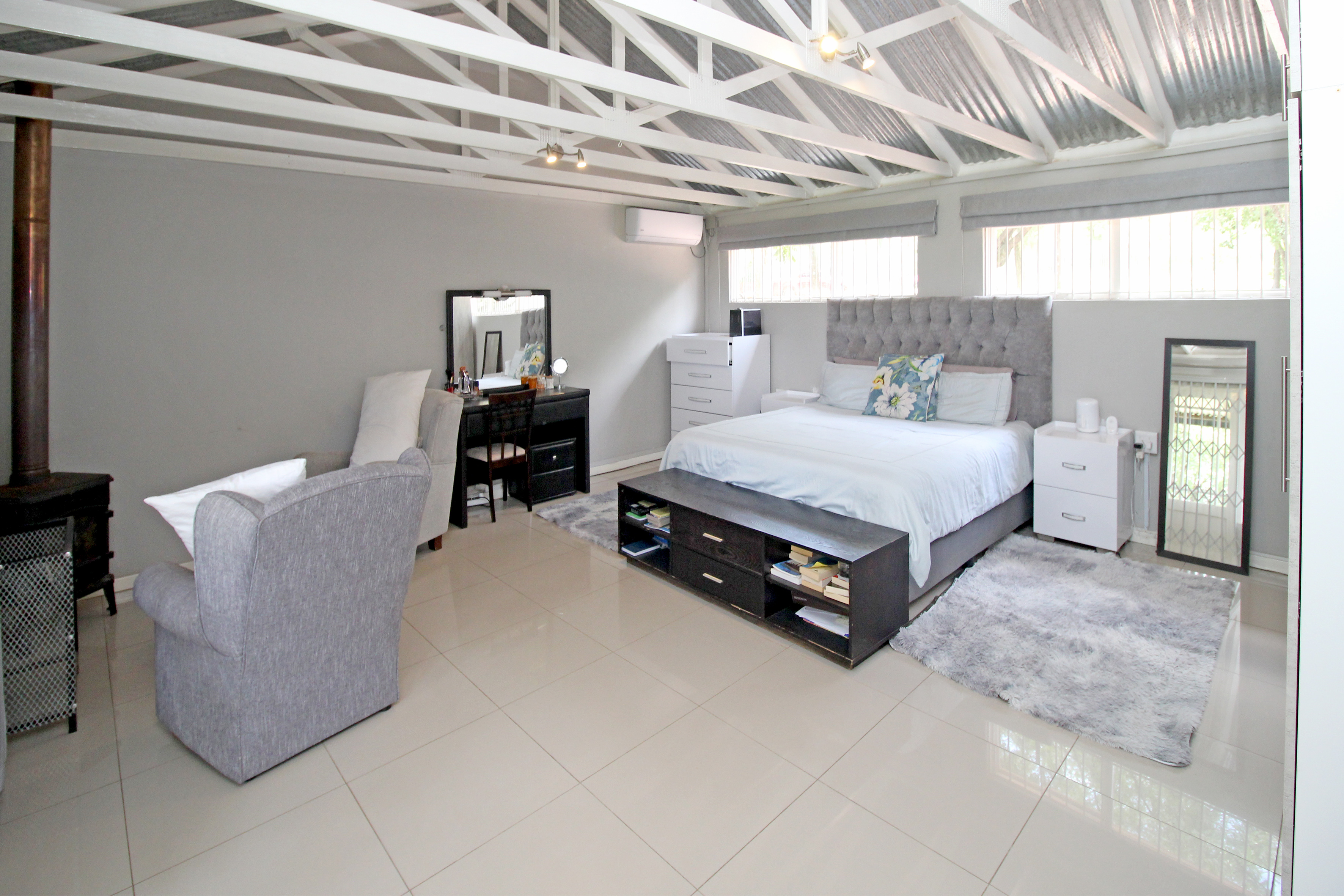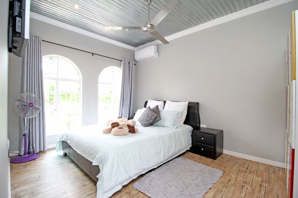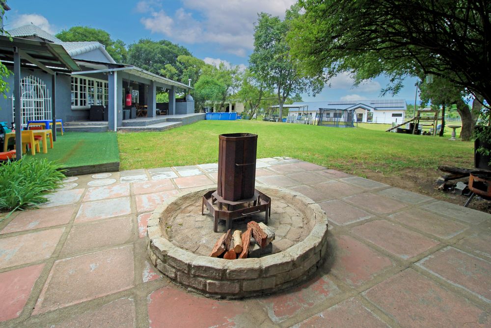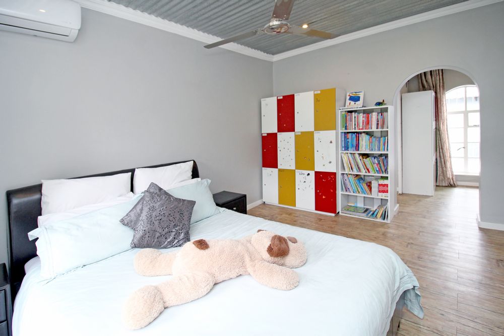 The TV room, dining area, and kitchen all feature doors that open onto a spacious, covered patio, thoughtfully divided into zones. The first zone is a dedicated play area for children, while the dining area and outdoor kitchen—complete with a gas braai, pizza oven, outside sink and food preparation area—offer the perfect space for entertaining.