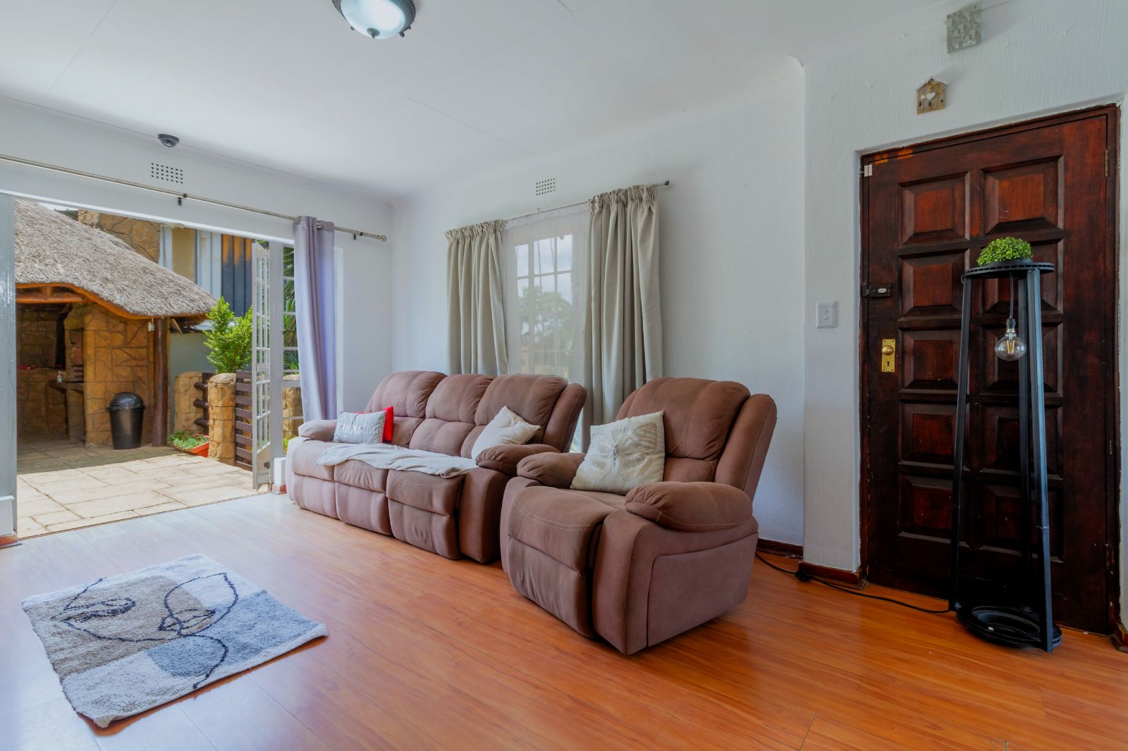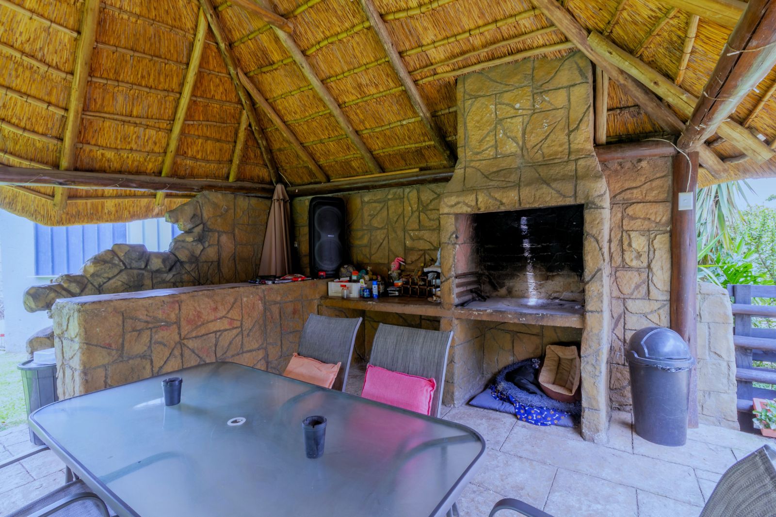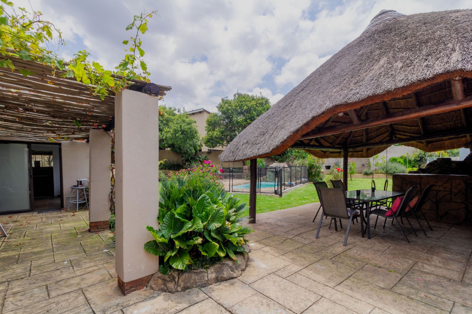 Main House: Tiled lounge leading out to the entertainment area with thatched lapa, braai and heated fenced pool. Separate dining room, kitchen with gas hob and plenty of cupboards, space for washing machine and dishwasher. 3 spacious bedrooms with BICs, 2 bathrooms the family bathroom with shower and main bathroom with a bath.