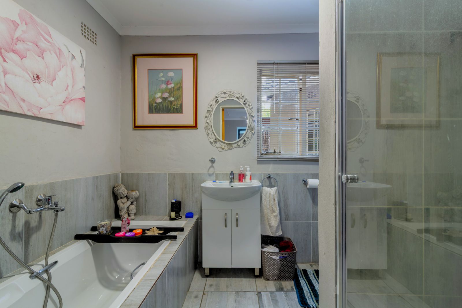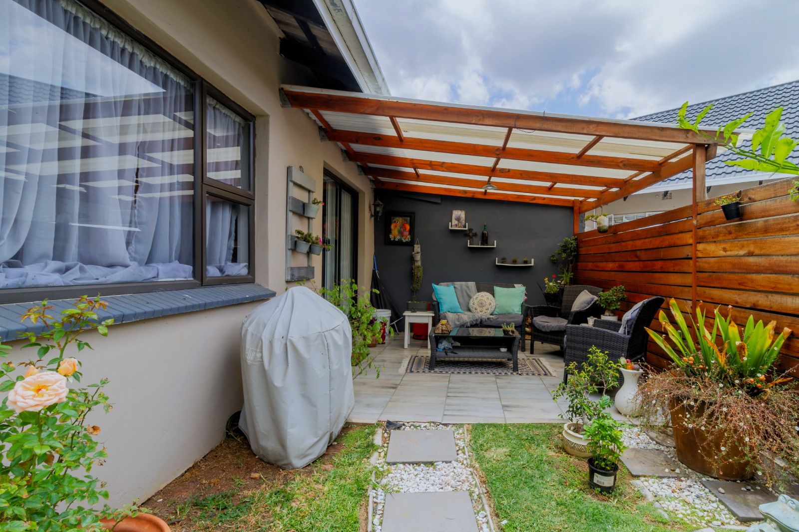The Cottage: A separate 1-bedroom garden cottage with own fenced in garden. Lovely, covered patio leading into spacious tiled lounge/dining room with jet master fireplace. Spacious kitchen with BICs and space for 2 water appliances. Tiled bedroom with walk in cupboard and en-suite bathroom with bath and shower. There is an additional guest toilet. Perfect for Gran and Gramps! Or good rental potential.