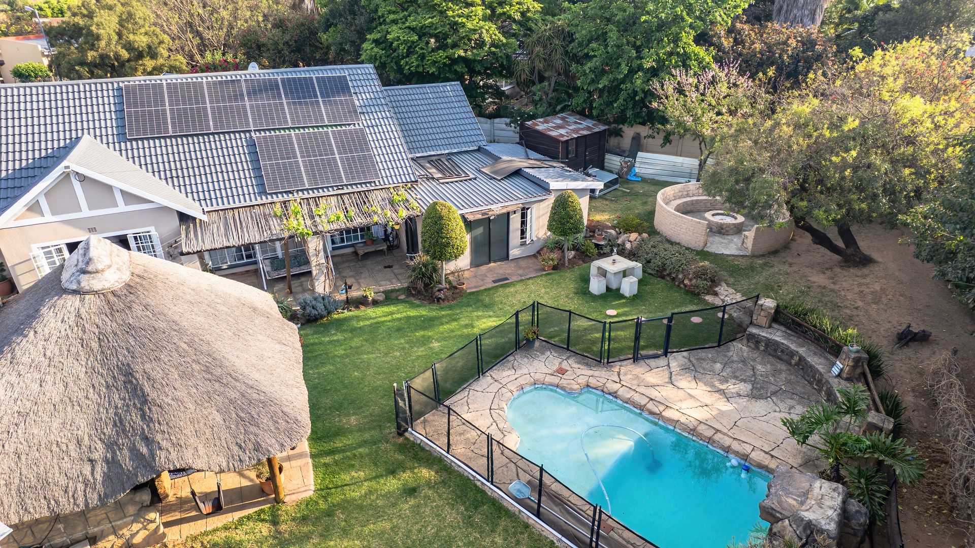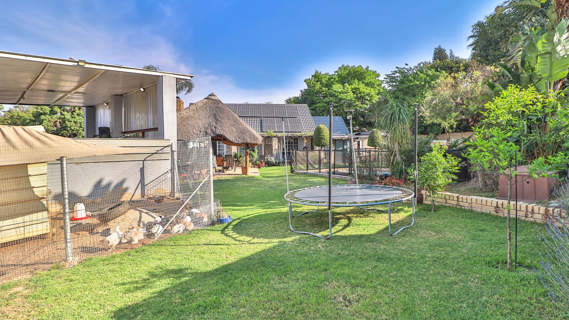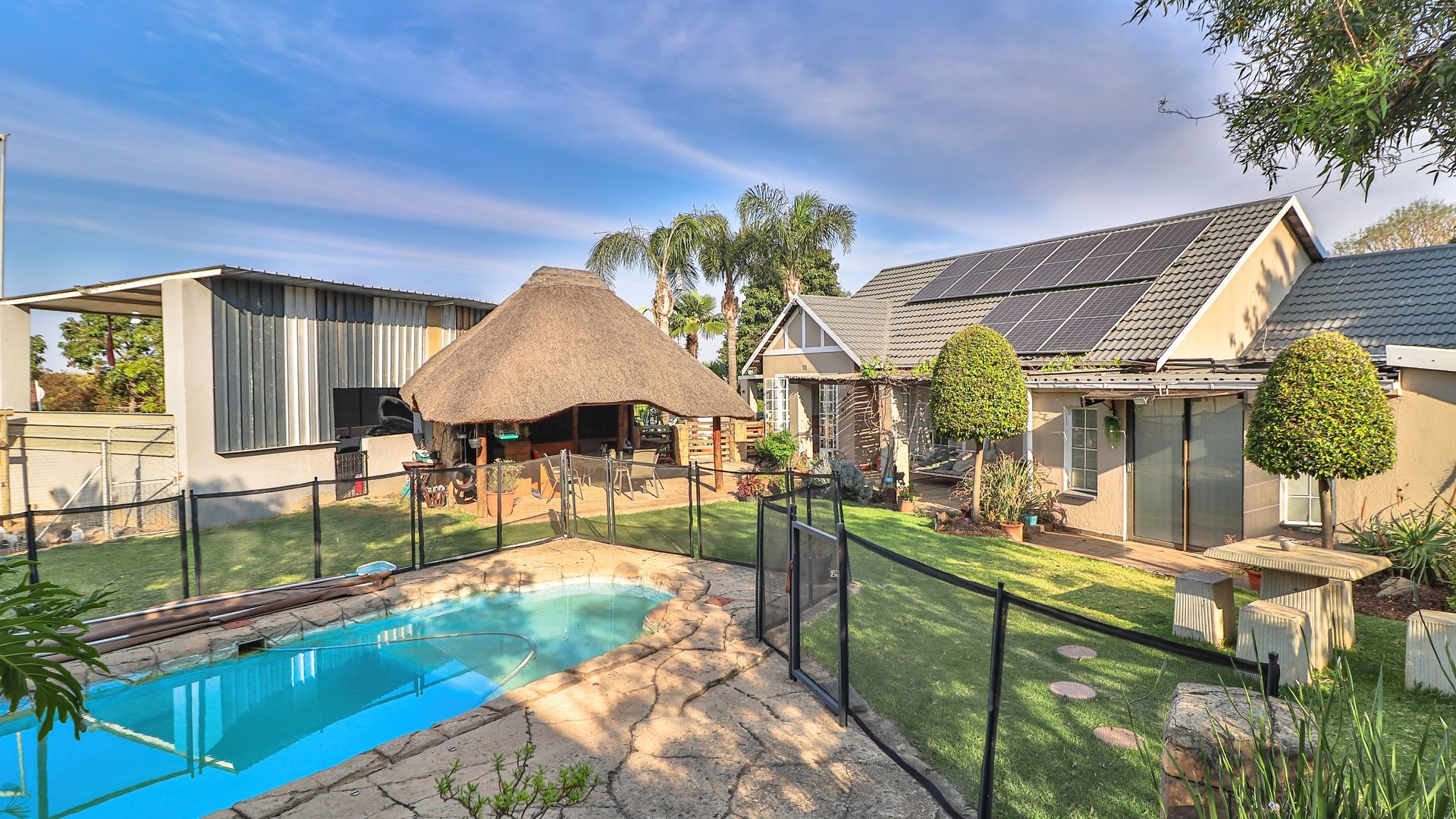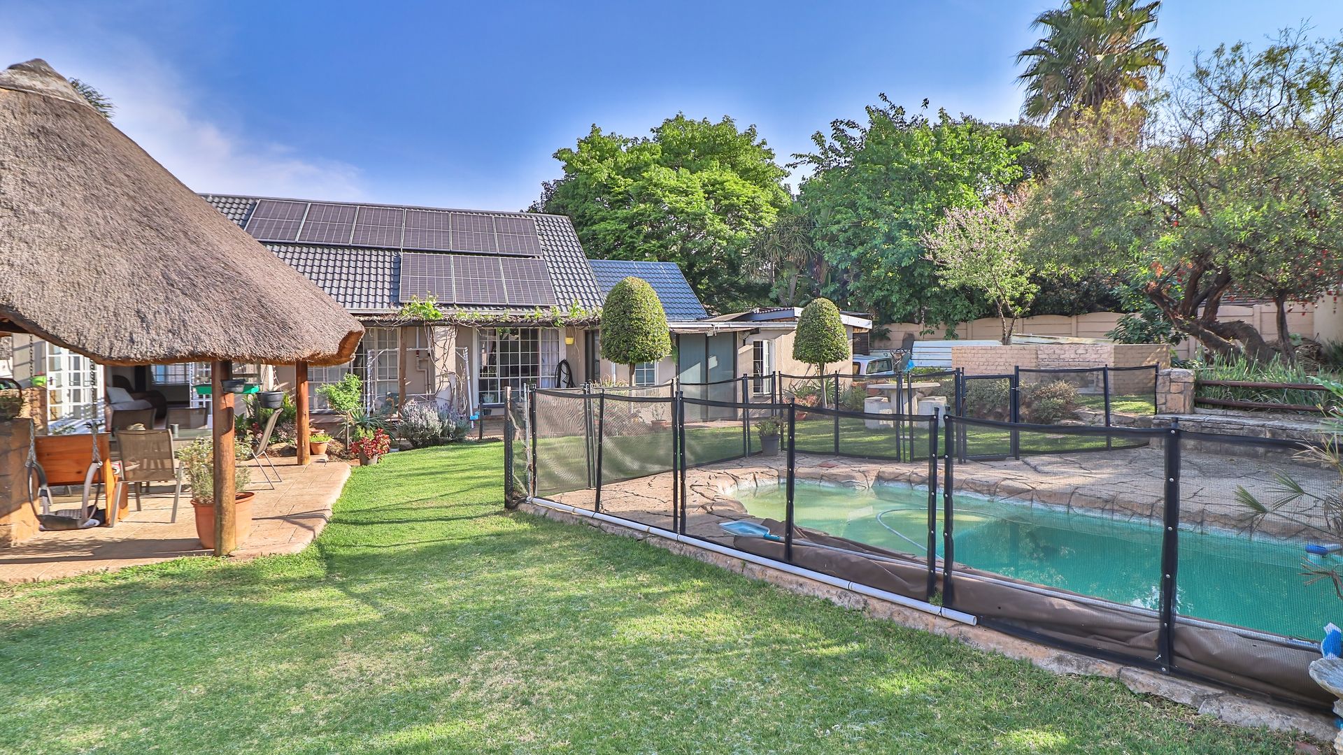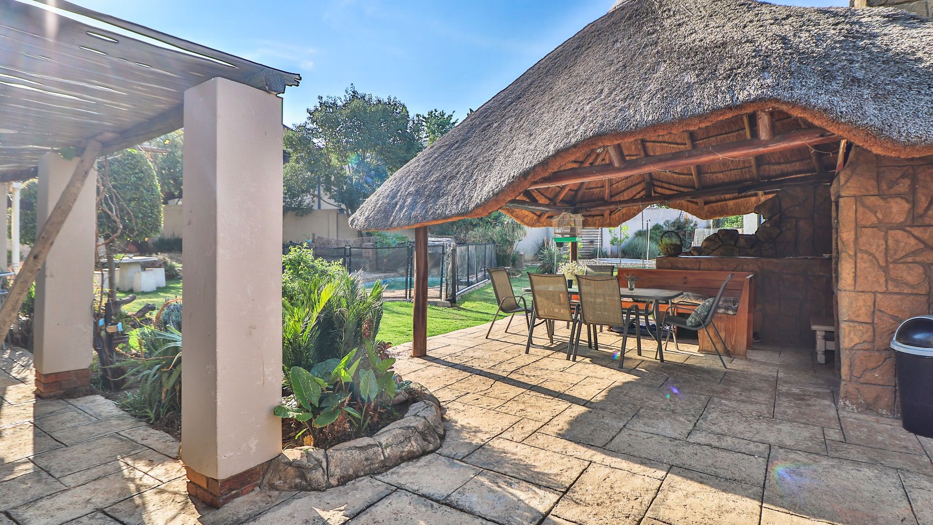 Great flow with cozy living space, plus a bachelor at the back of the home that can be staff or income generation. Perfect for an active family, with generous garden and outdoor living area offering Lapa, heated pool, boma with firepit, outstanding facilities for fun with the family. Pool is fenced for peace of mind.
