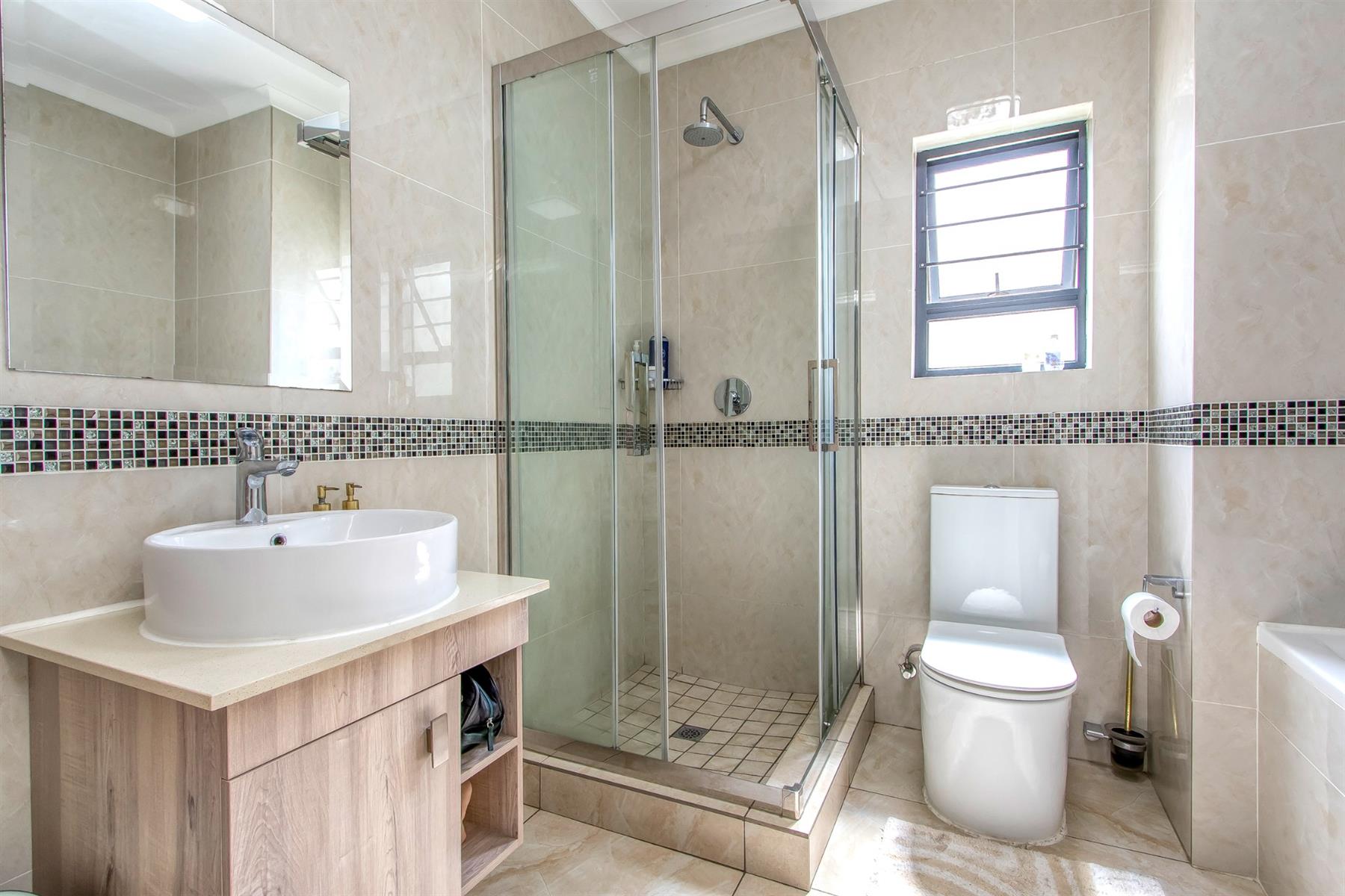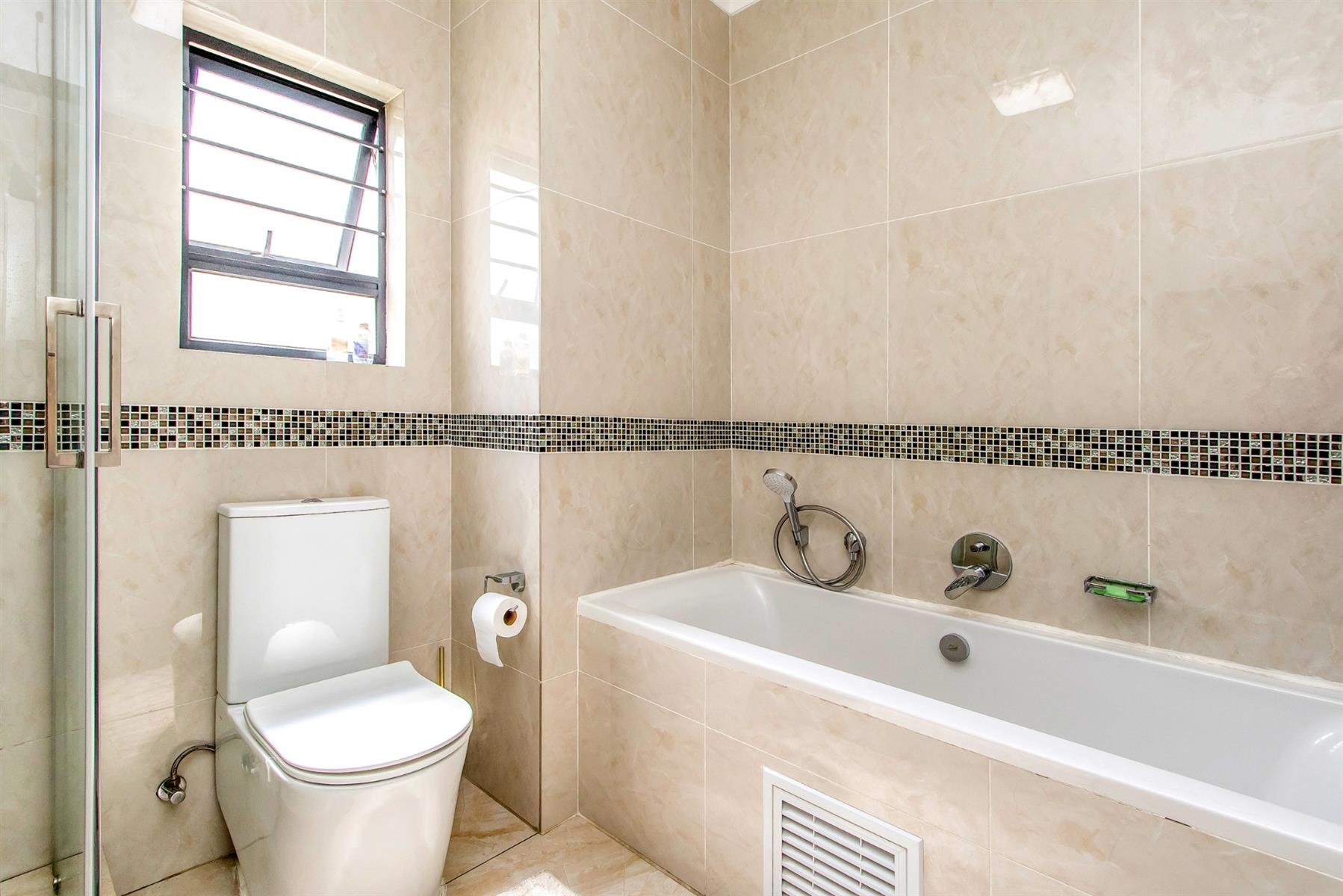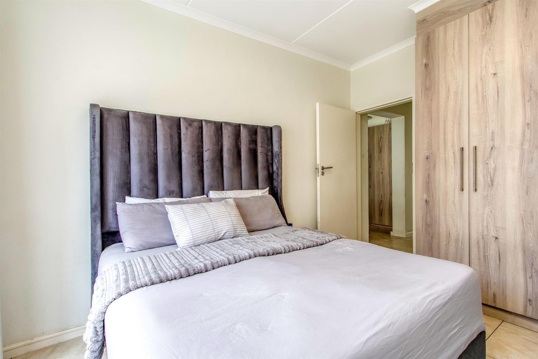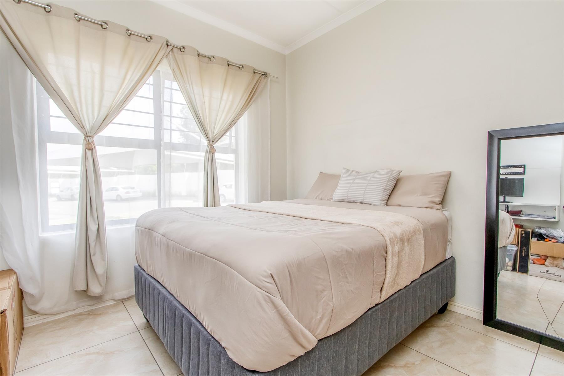 The main bedroom is well-sized and comfortably accommodates a queen bed, with built-in cupboards and modern curtain rails. The second bedroom is also generously sized, tiled, and fitted with built-in cupboards. The bathroom is beautifully finished with modern tiling, a single basin with a vanity cupboard, a large shower, and a bath—offering both convenience and comfort.