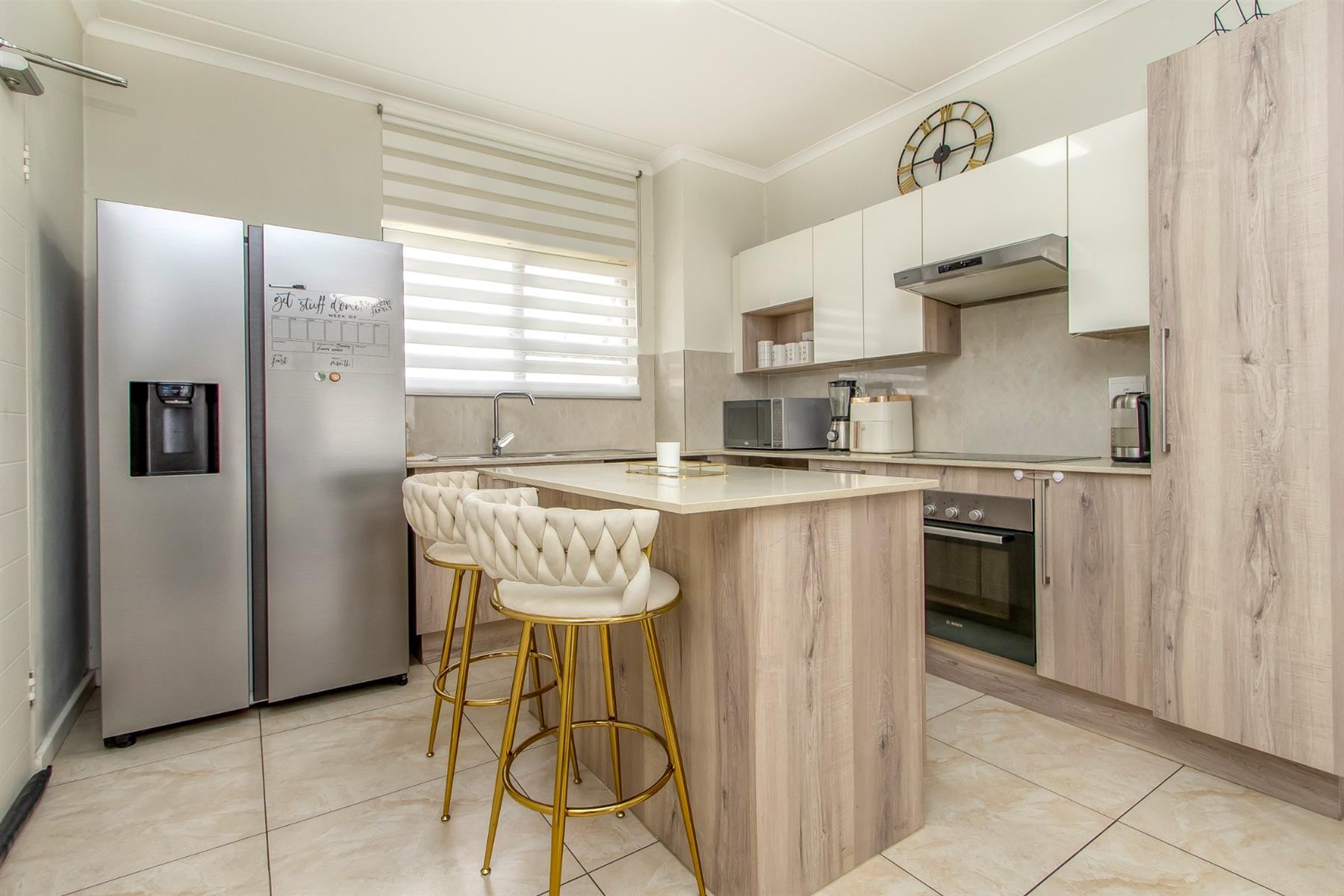 The open-plan kitchen is both practical and attractive, featuring ample cupboard space, a centre island with a breakfast nook, and space for two appliances—perfect for easy everyday living and relaxed entertaining. The lounge flows seamlessly onto a covered, tiled patio through sliding doors, leading into a neat private corner garden, ideal for enjoying quiet mornings or winding down in the evenings.