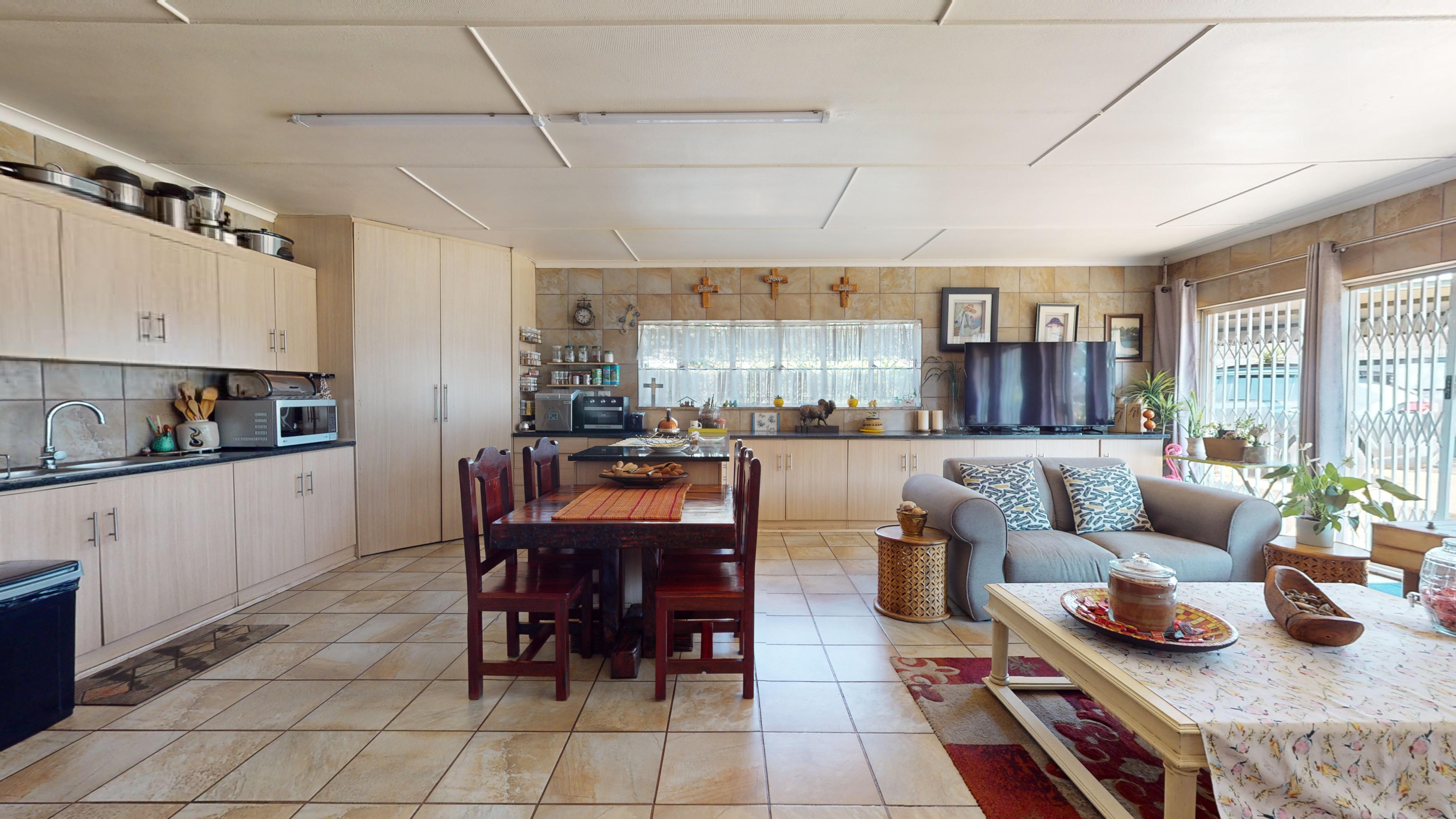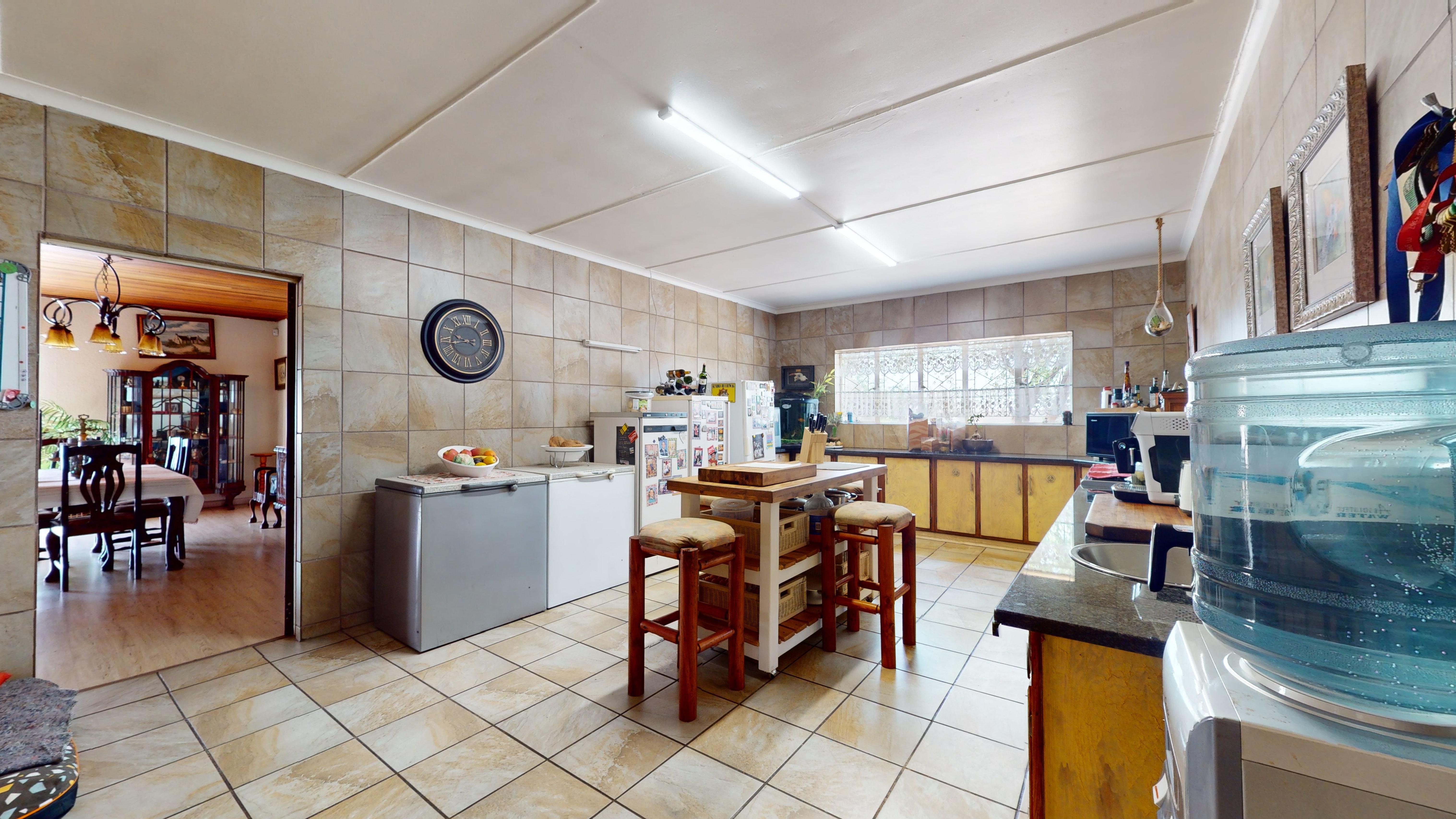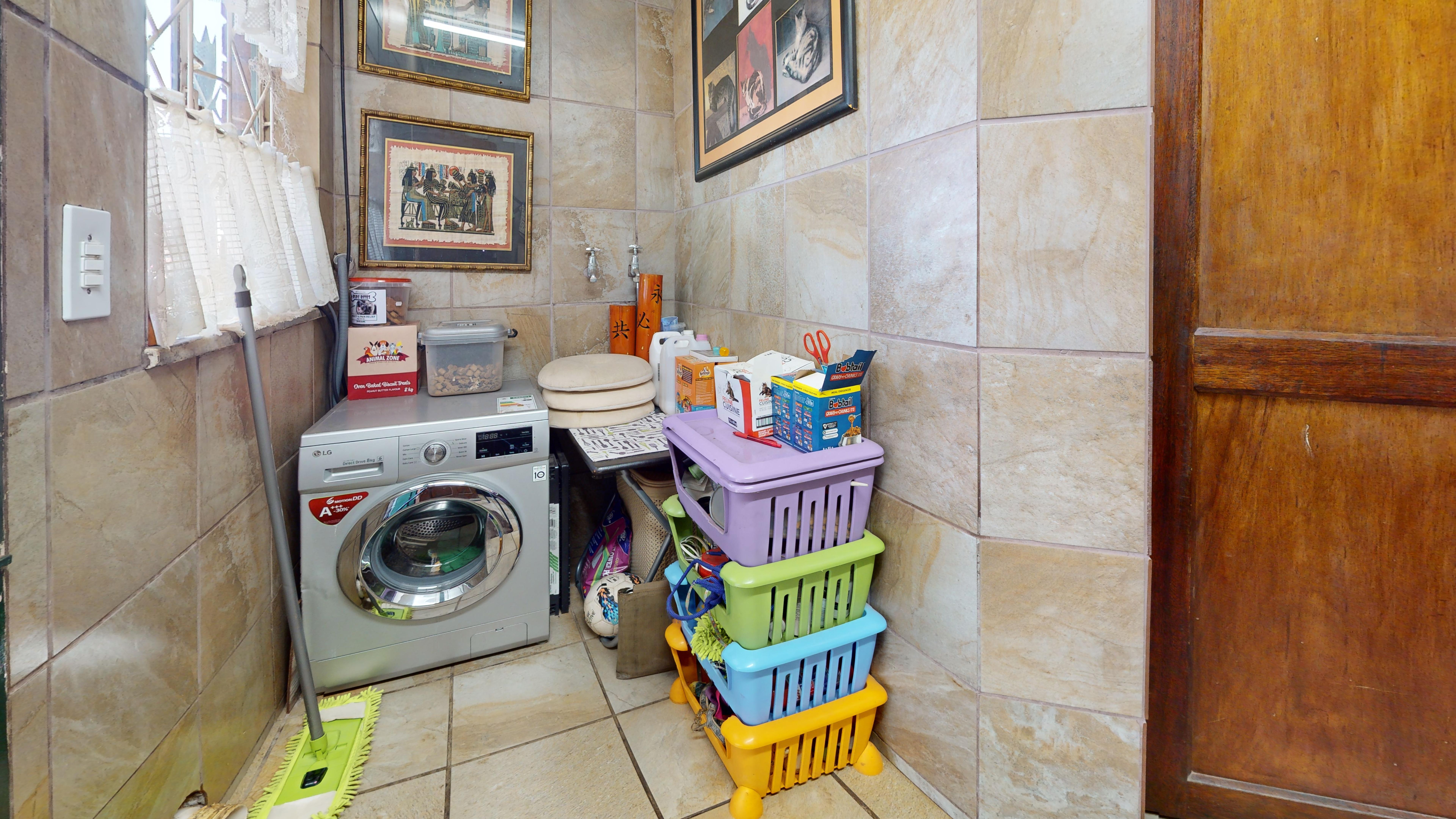 The house boasts generous storage spaces, including a scullery/laundry and a pantry area equipped with cupboards. This space has an alarm sensor and stores the cameras, batteries, and inverters. The property is well-secured with zoned alarm areas, additional sensors, security gates, and burglar bars. The 20kVA batteries are stored discreetly in the hallway cupboard.