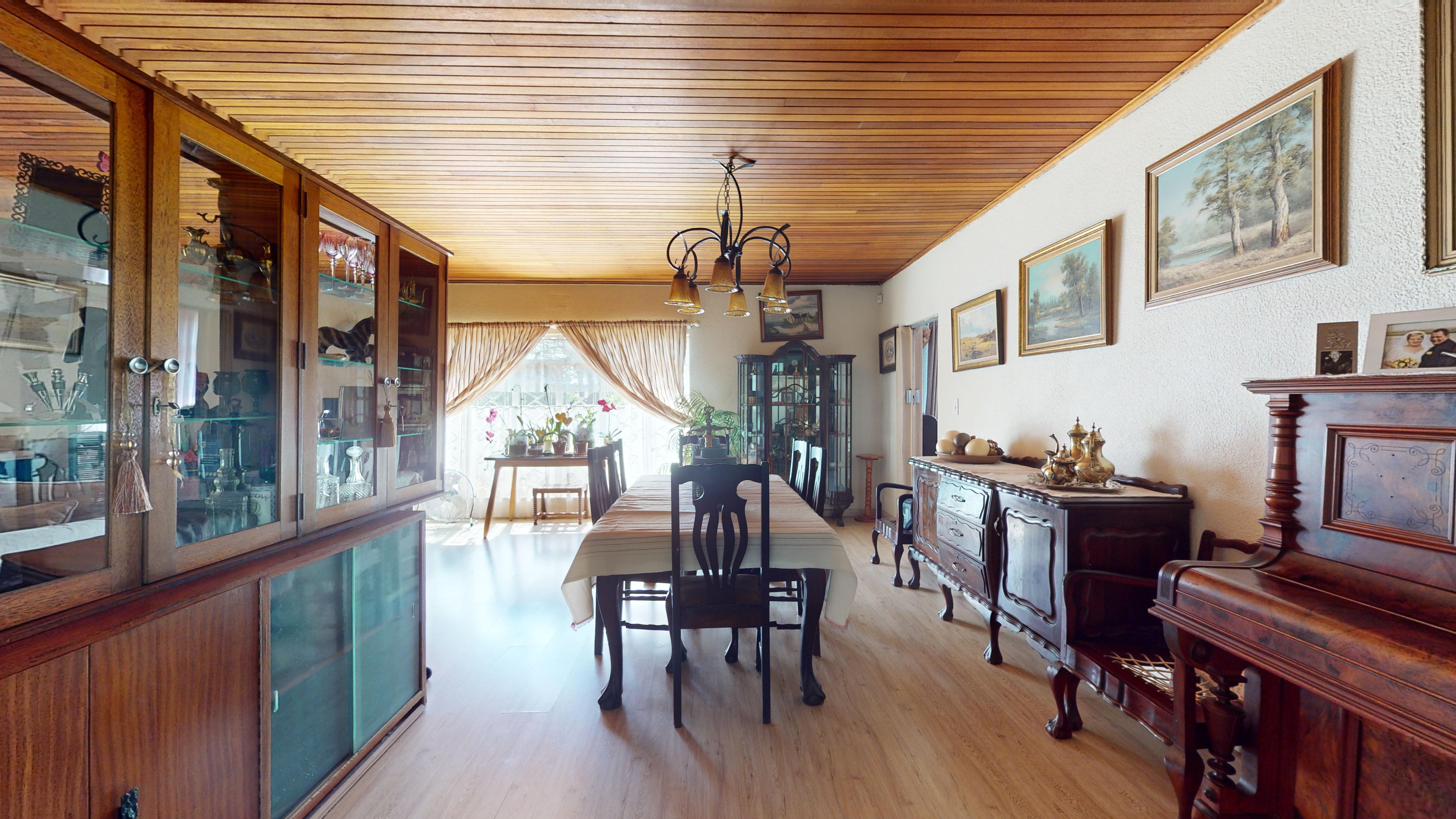 Strolling down the corridor, one enters the open-plan dining room and lounge, bathed in sunlight that reveals the splendid wooden ceilings and spacious living area with laminated floors and exquisite chandeliers.