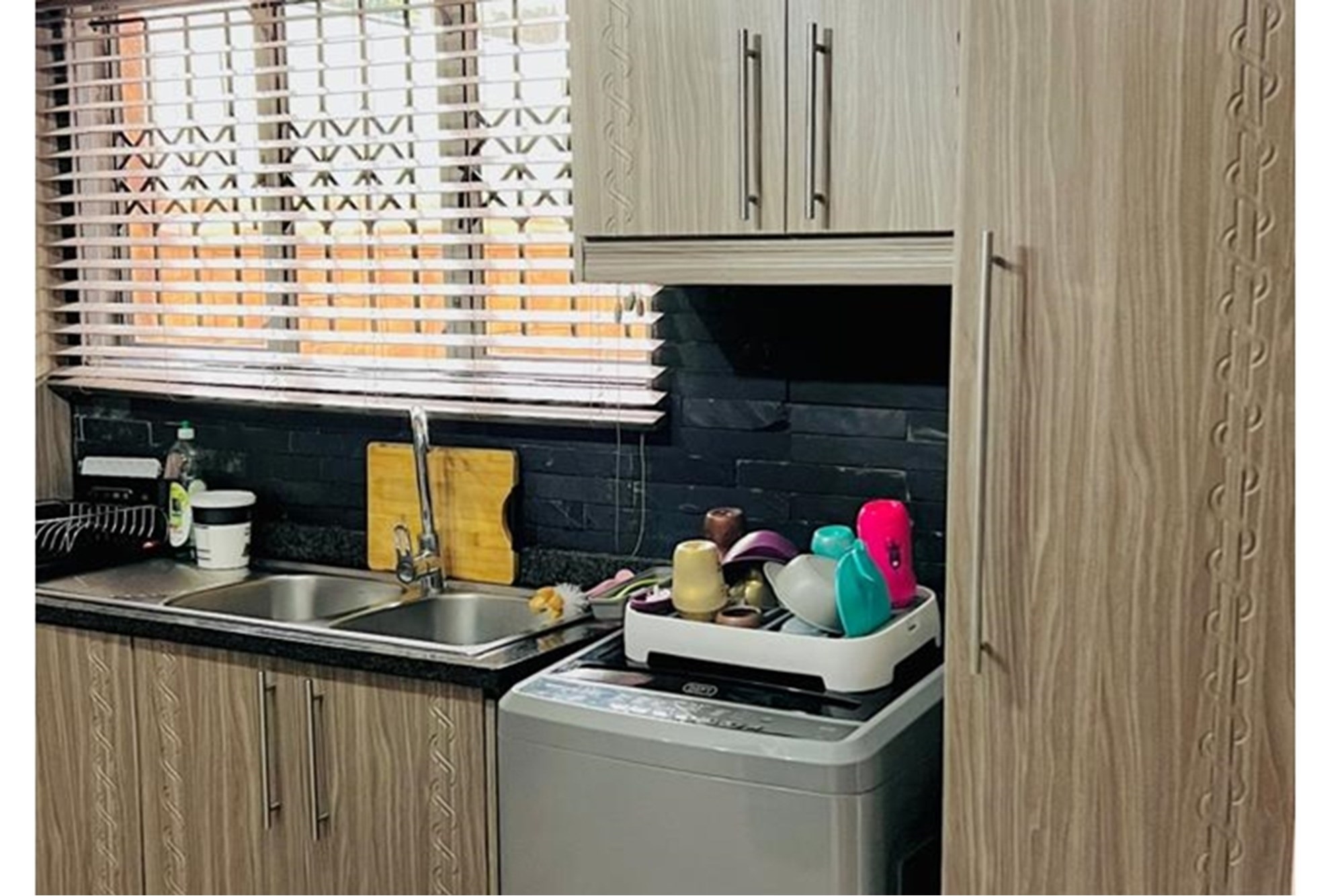 Modern Kitchen– Equipped with built-in appliances, a gas stove, oven, extractor fan, and elegant granite countertops.