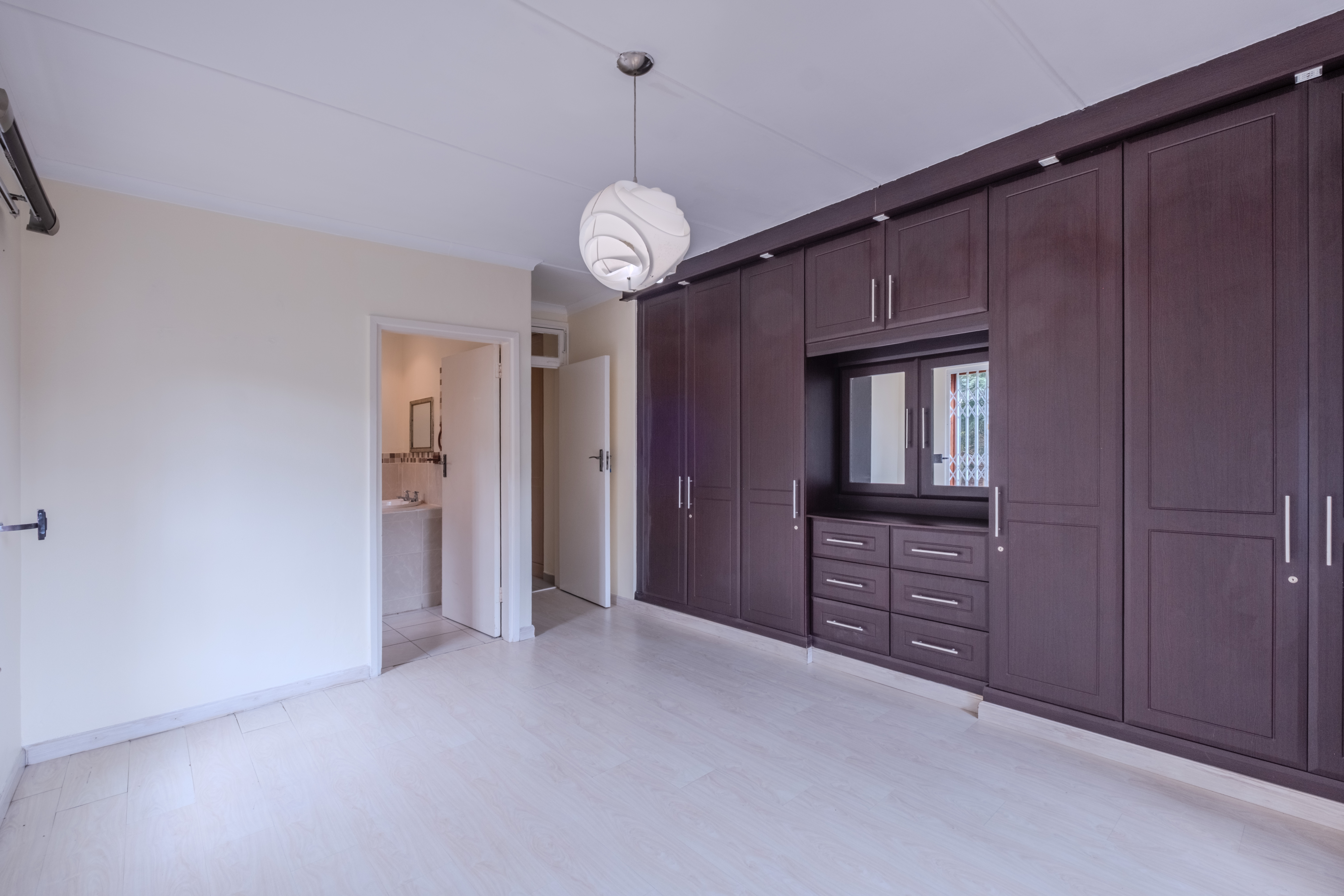 The home features two well-sized bedrooms with built-in cupboards and laminated flooring. The main bedroom includes an en-suite bathroom and air conditioning for year-round comfort.