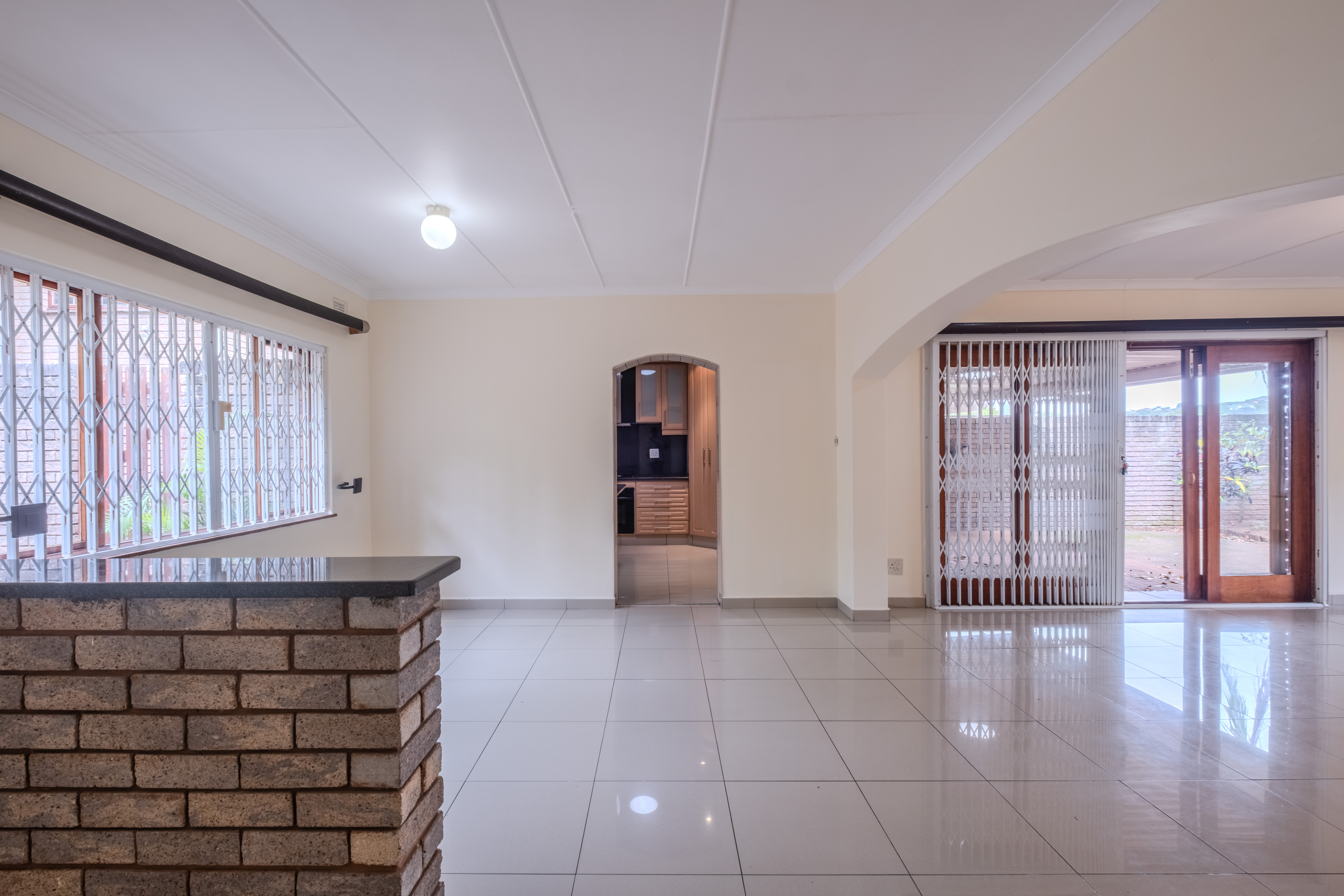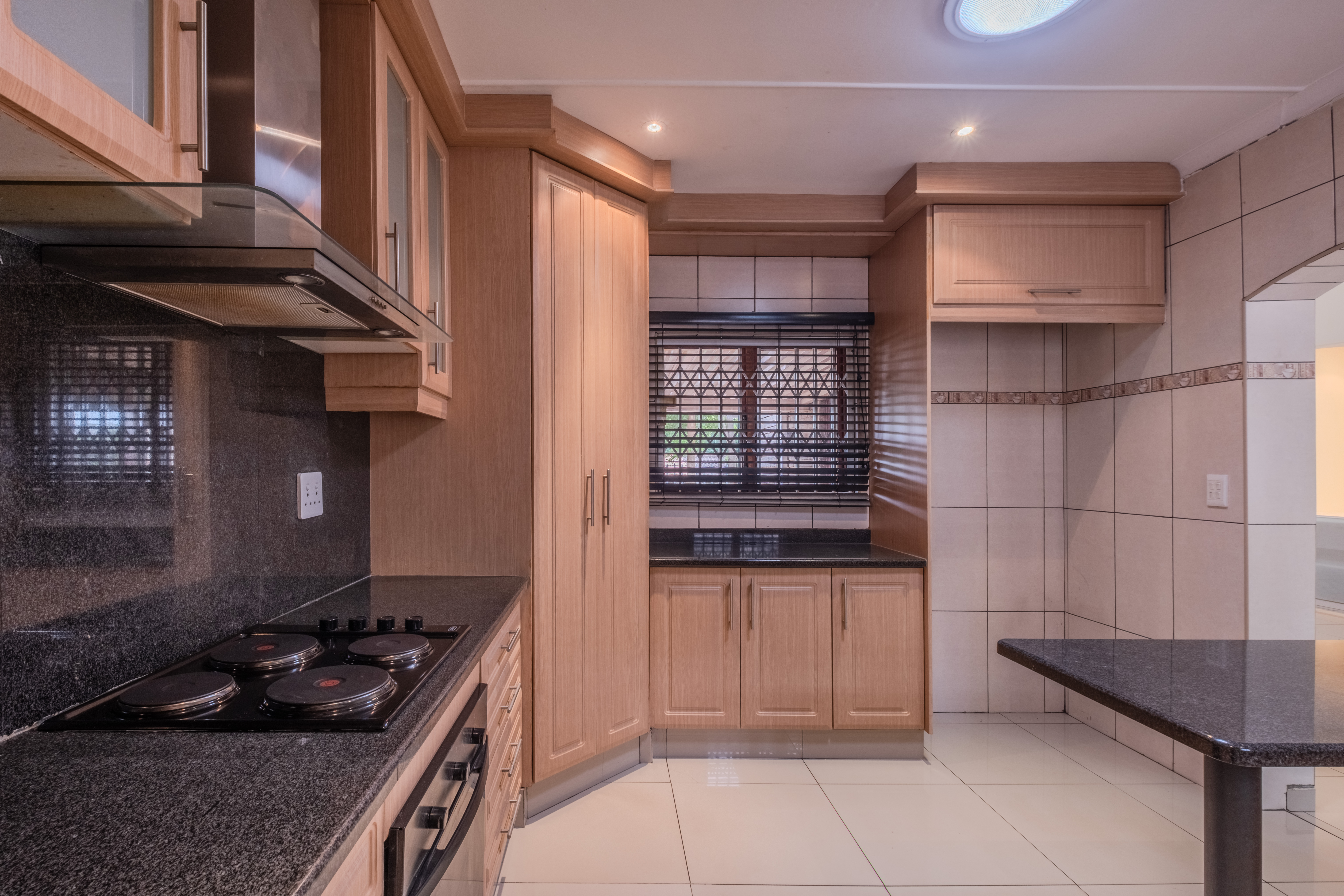The open-plan design creates an immediate sense of space as you step into the bright and airy lounge and dining area. Double doors open to a private courtyard fitted with an awning, making it the perfect spot for casual gatherings. The kitchen is both functional and inviting, offering granite countertops, ample cupboard space, and modern electric appliances.