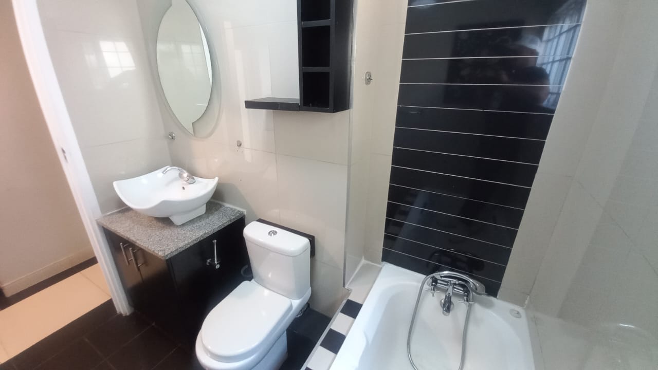 The master bedroom features an ensuite bathroom with a shower, extractor fan, vanity basin, and toilet. The other two bedrooms come with built-in cupboards and share the main bathroom, which includes a bathtub with a hand mixer, vanity basin, and toilet.