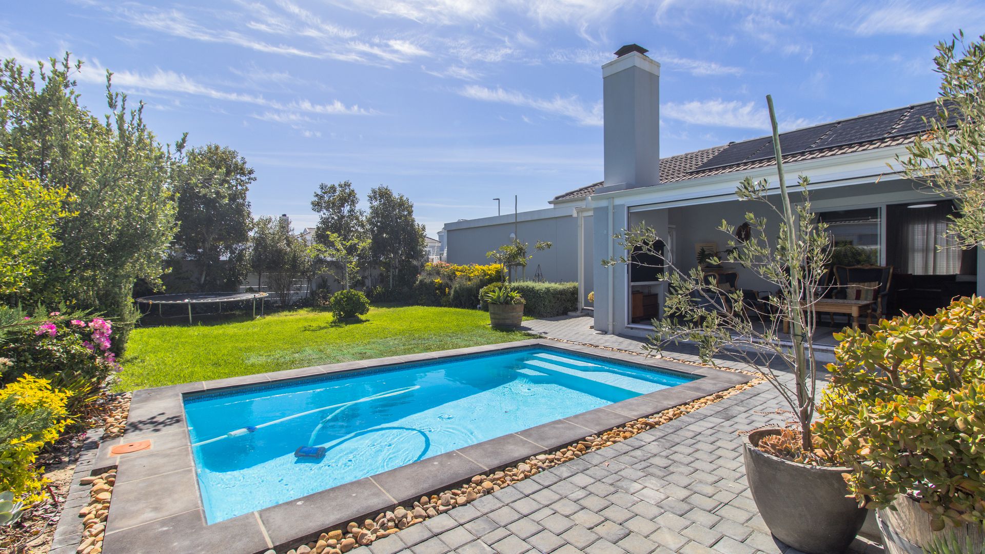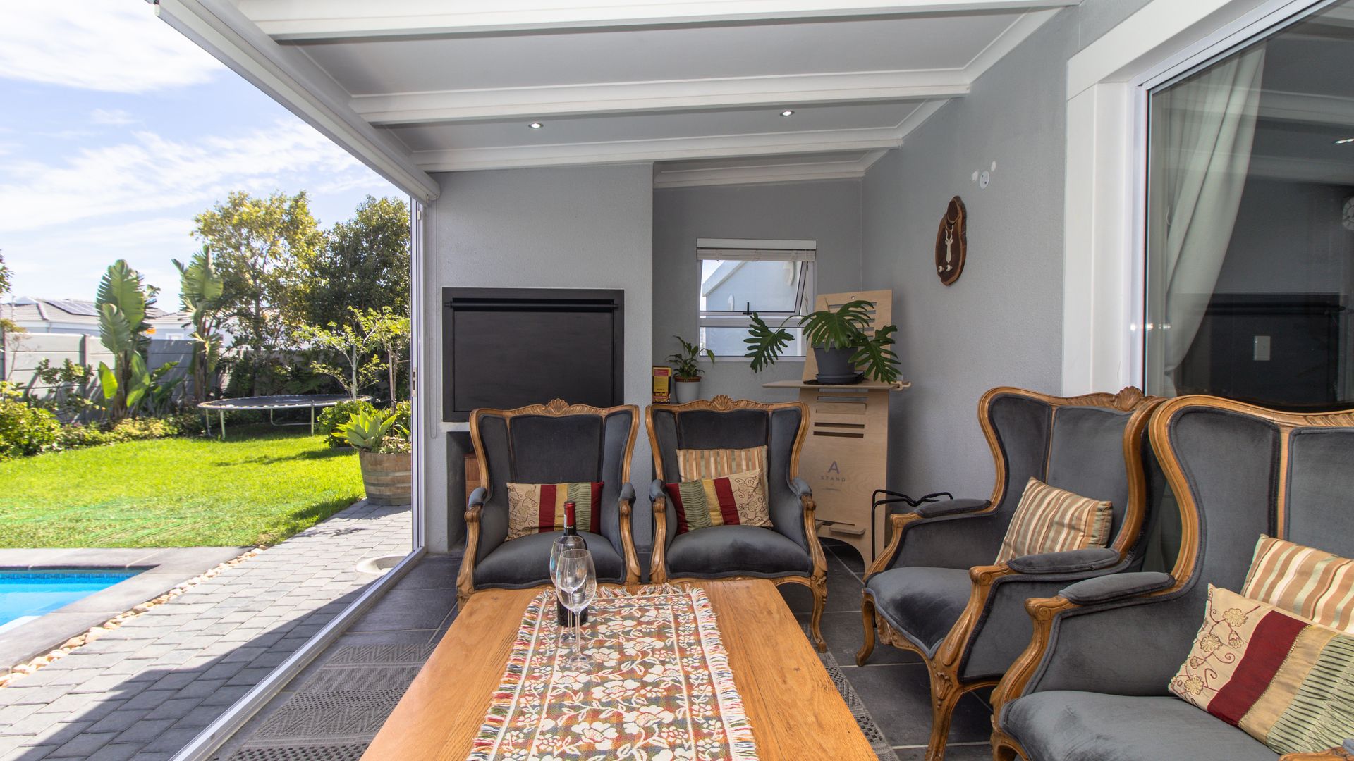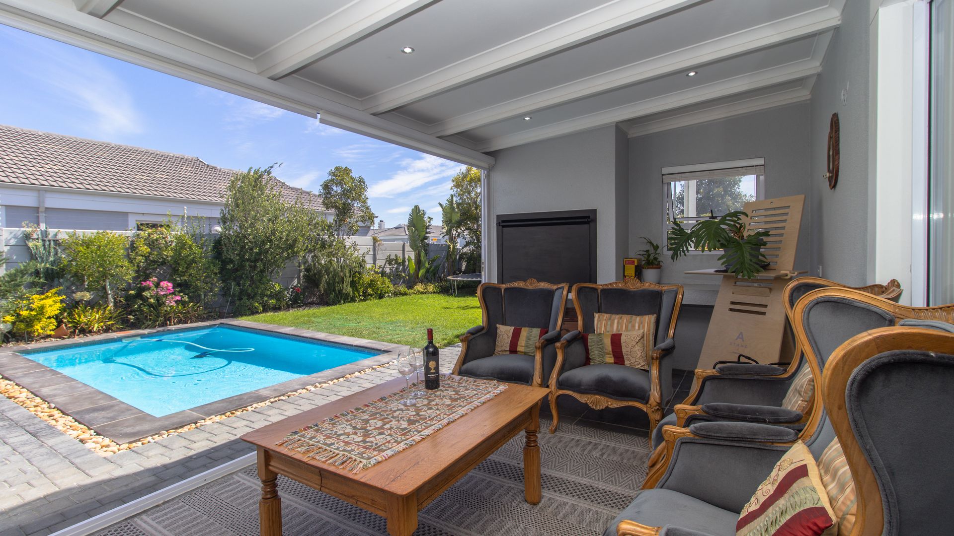 - A beautifully enclosed patio with a built-in braai and stacker doors offering seamless indoor-outdoor living with views over the sparkling pool and lush, established garden. Entertain year-round in this perfect setting for family/social gatherings.