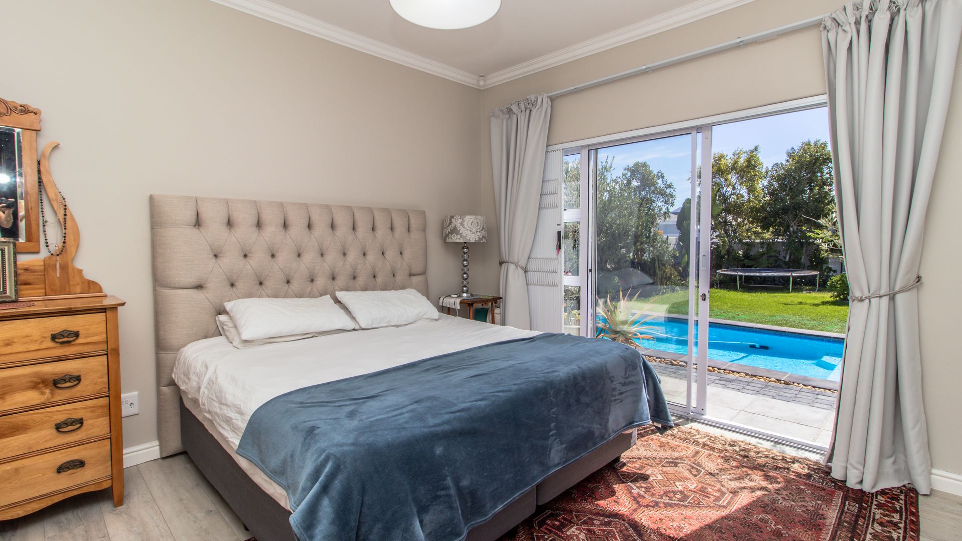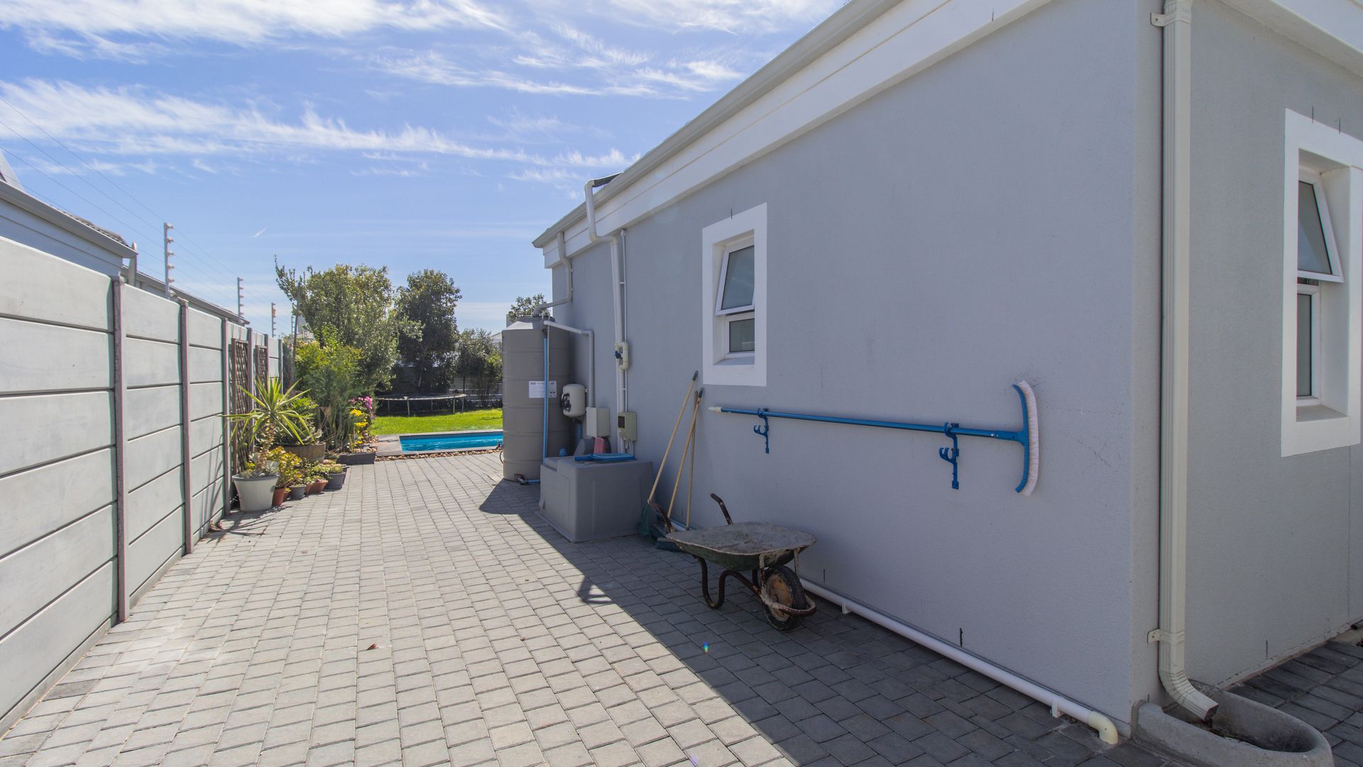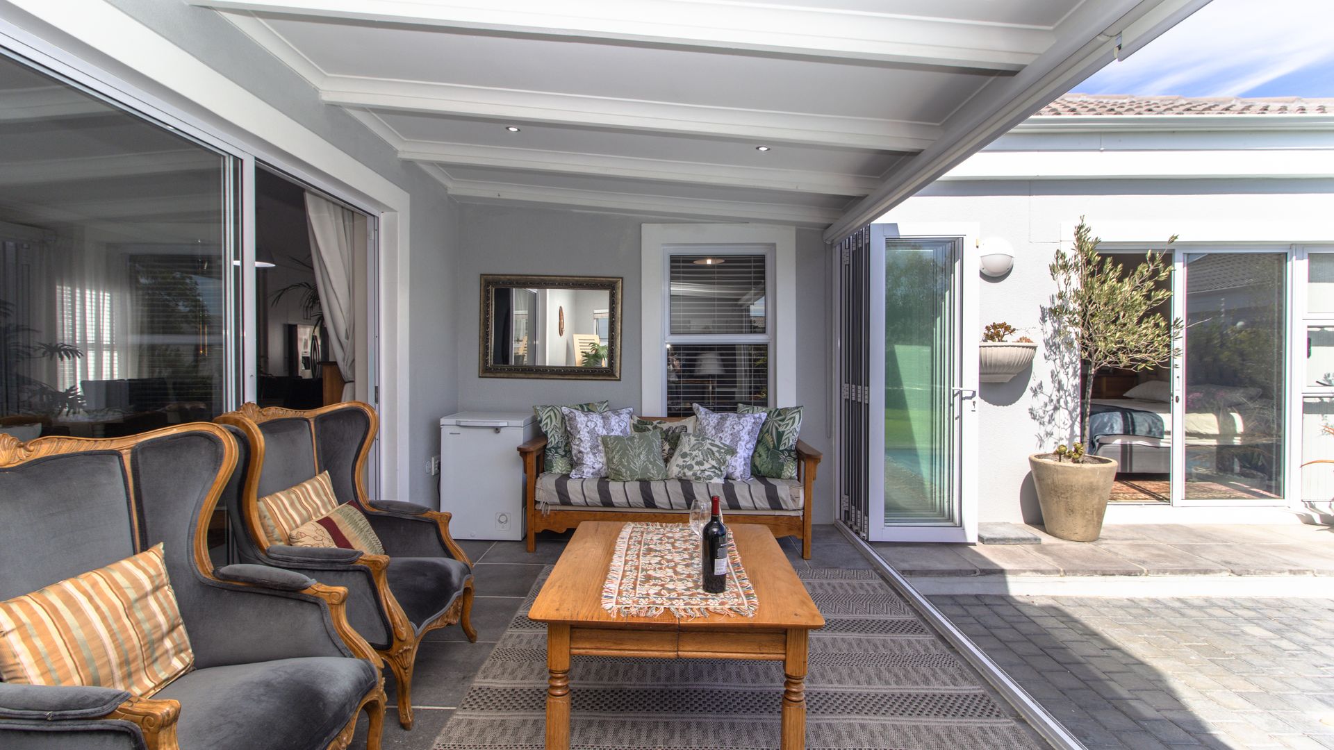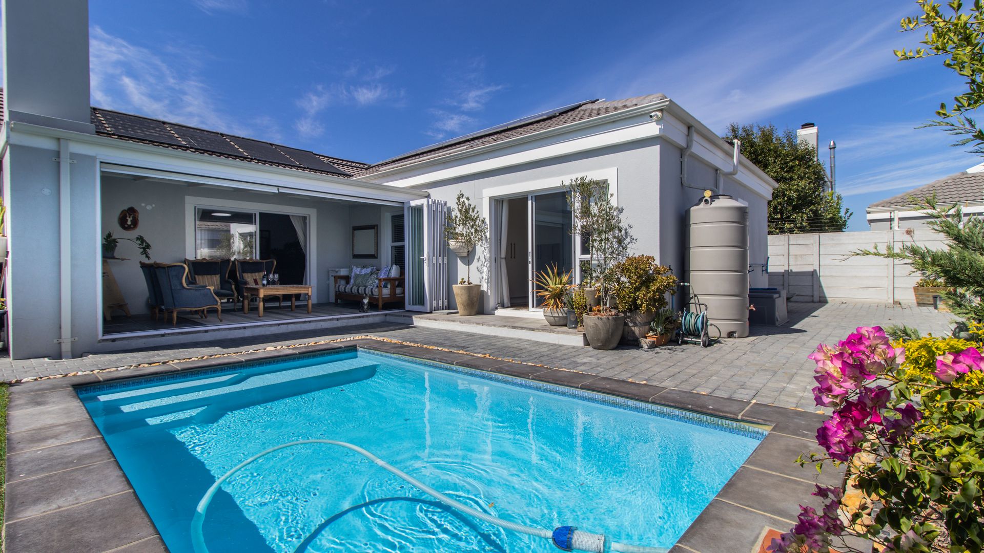 - A beautifully enclosed patio with a built-in braai and stacker doors offering seamless indoor-outdoor living with views over the sparkling pool and lush, established garden. Entertain year-round in this perfect setting for family/social gatherings.