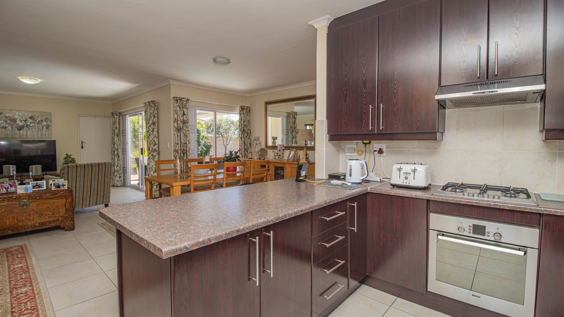 The kitchen includes a breakfast counter, gas hob, and a separate scullery accommodating two appliances.
