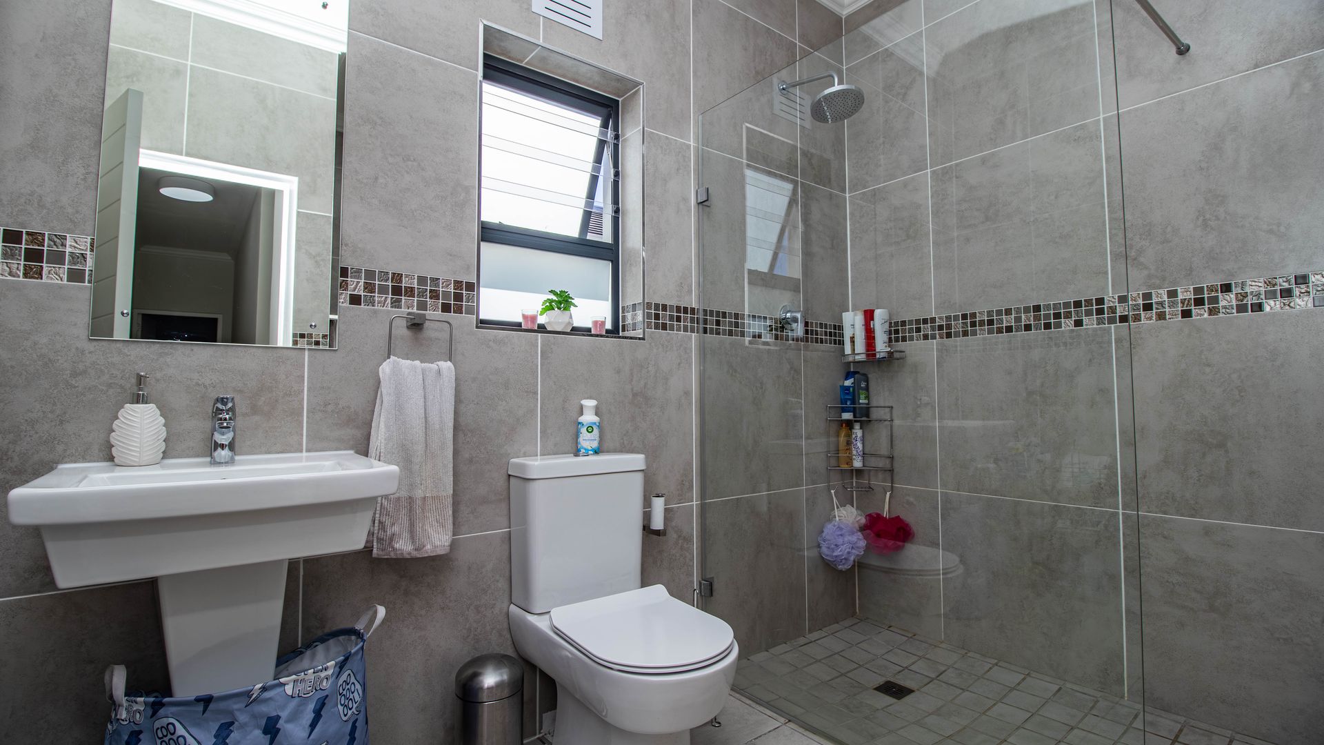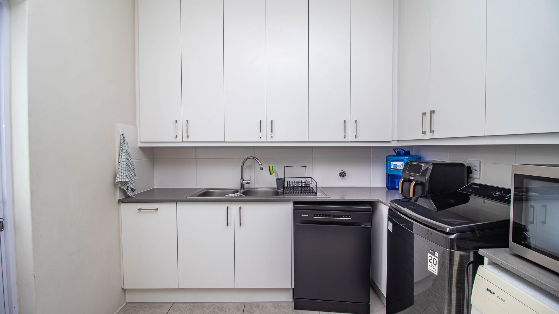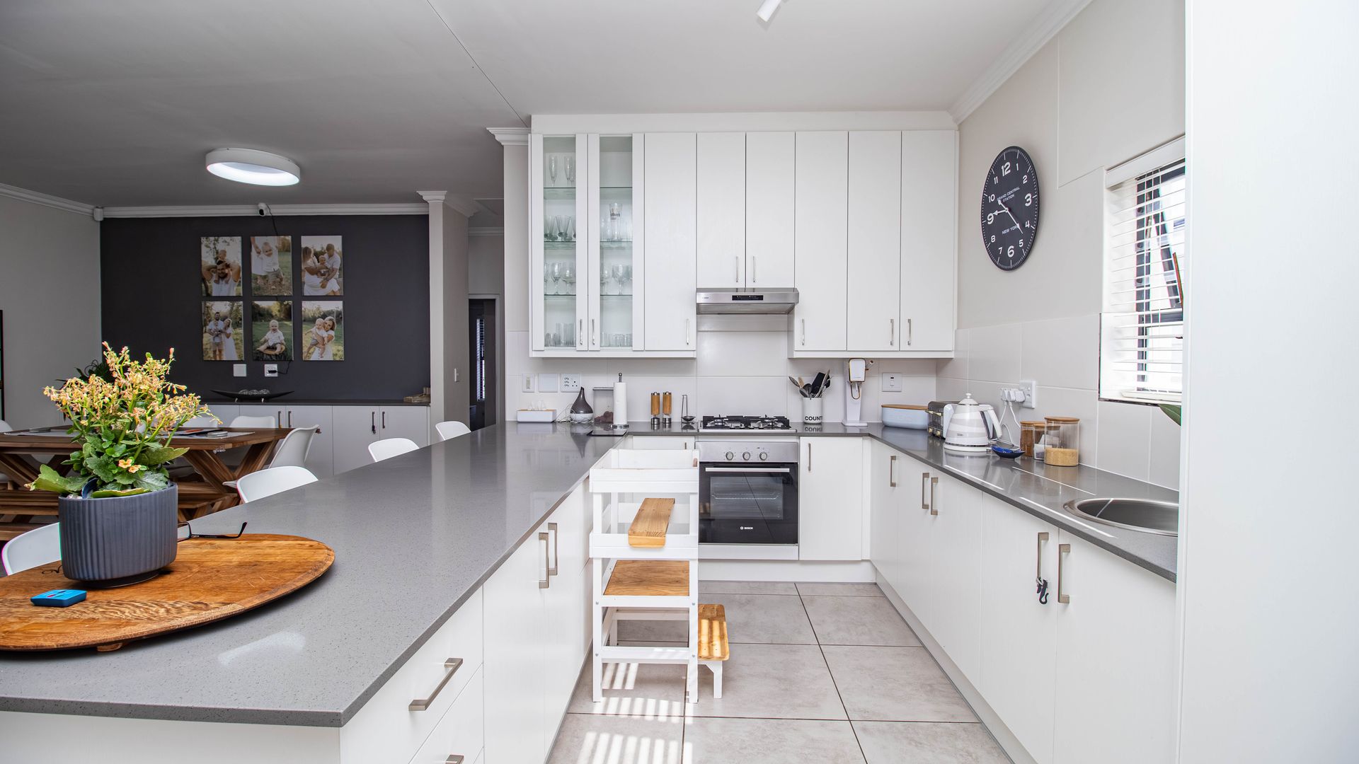The light, bright kitchen forms the centre of the home and features elegant Caesarstone countertops, a gas hob, and a large breakfast counter ideal for family chit chat and gatherings. A separate scullery offers additional built-in cupboards and plumbing for three appliances.