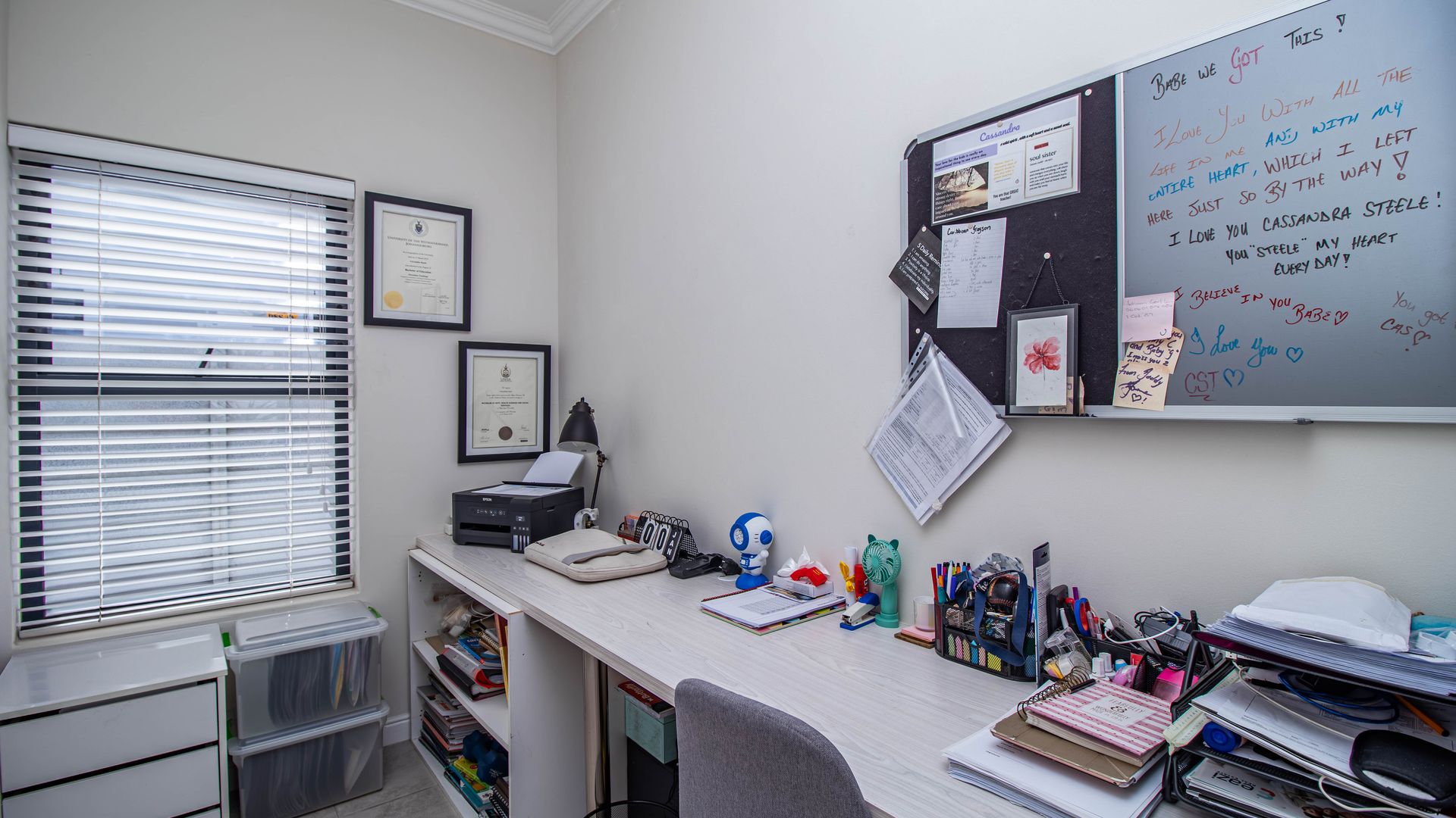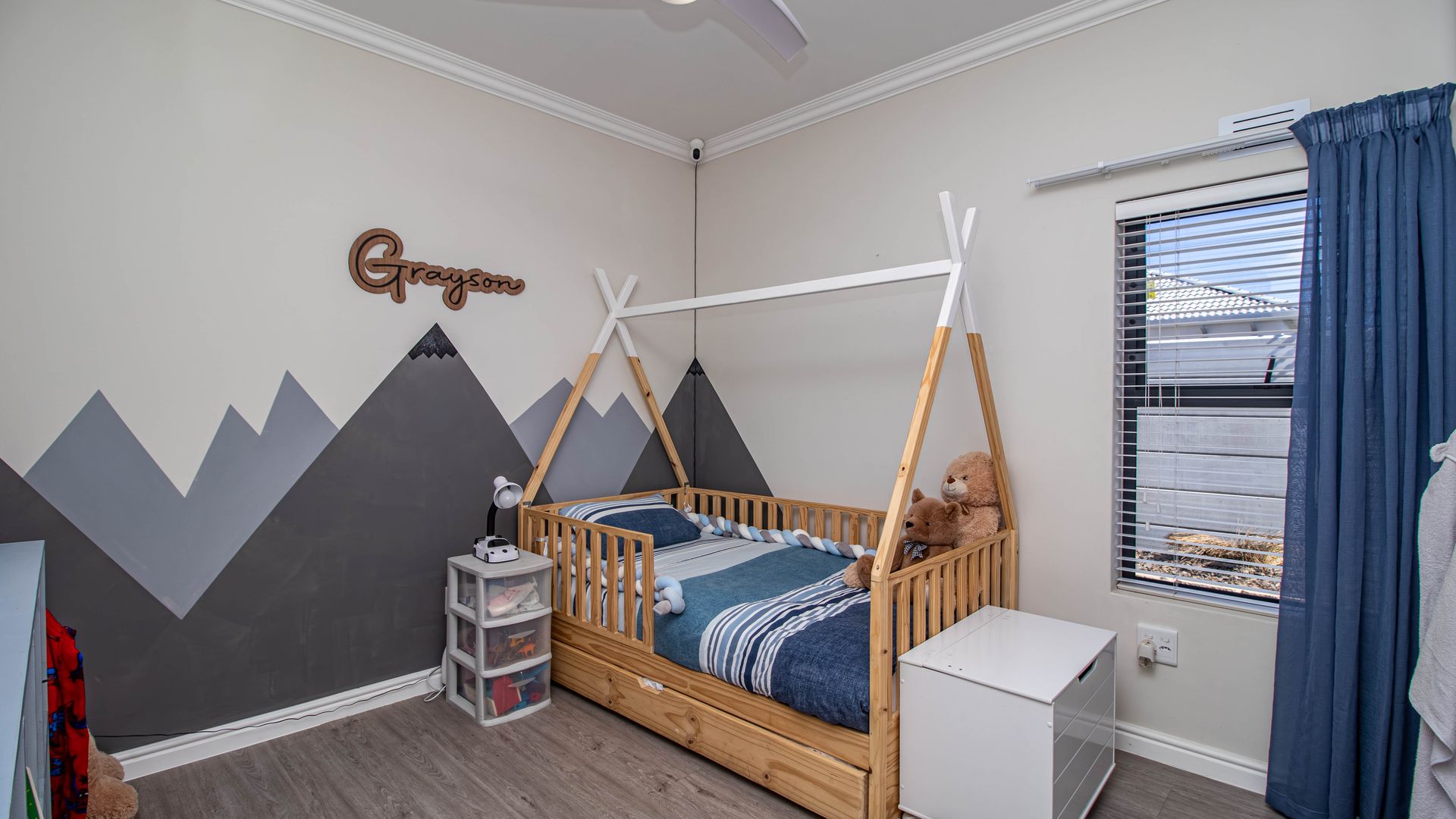 The home offers three spacious bedrooms plus a study nook. Each bedroom is finished with stylish vinyl flooring and ceiling fans for comfort. The main suite includes a modern en-suite bathroom and a walk-in closet.