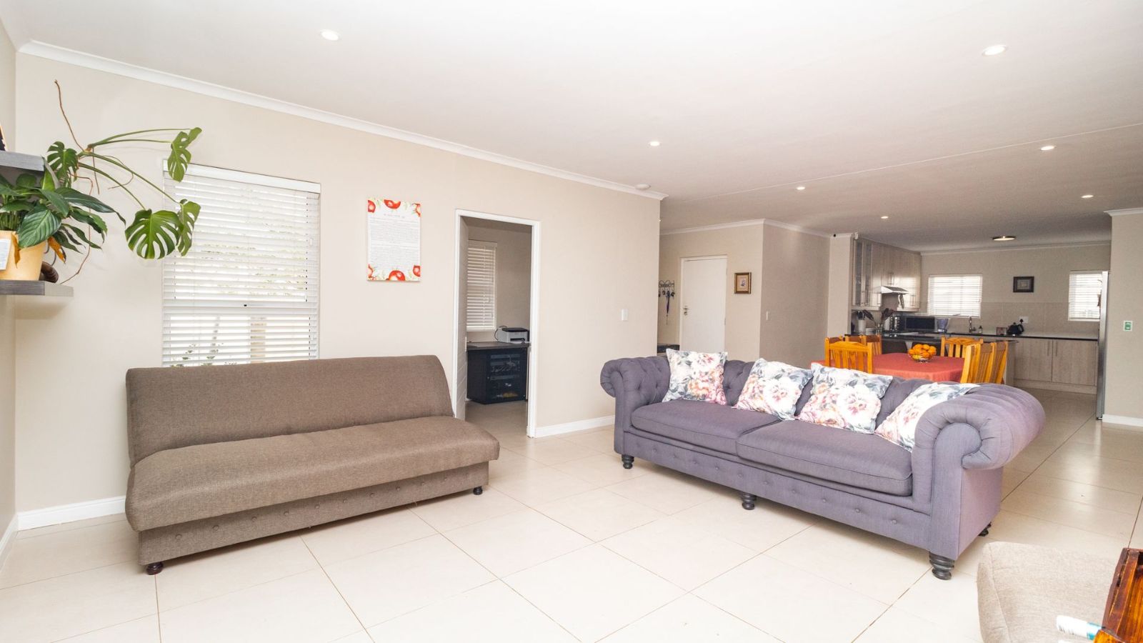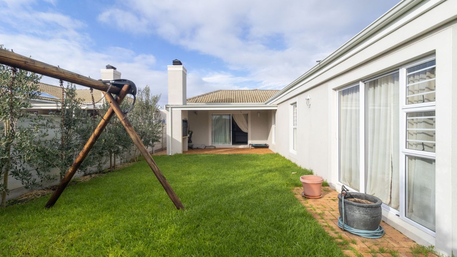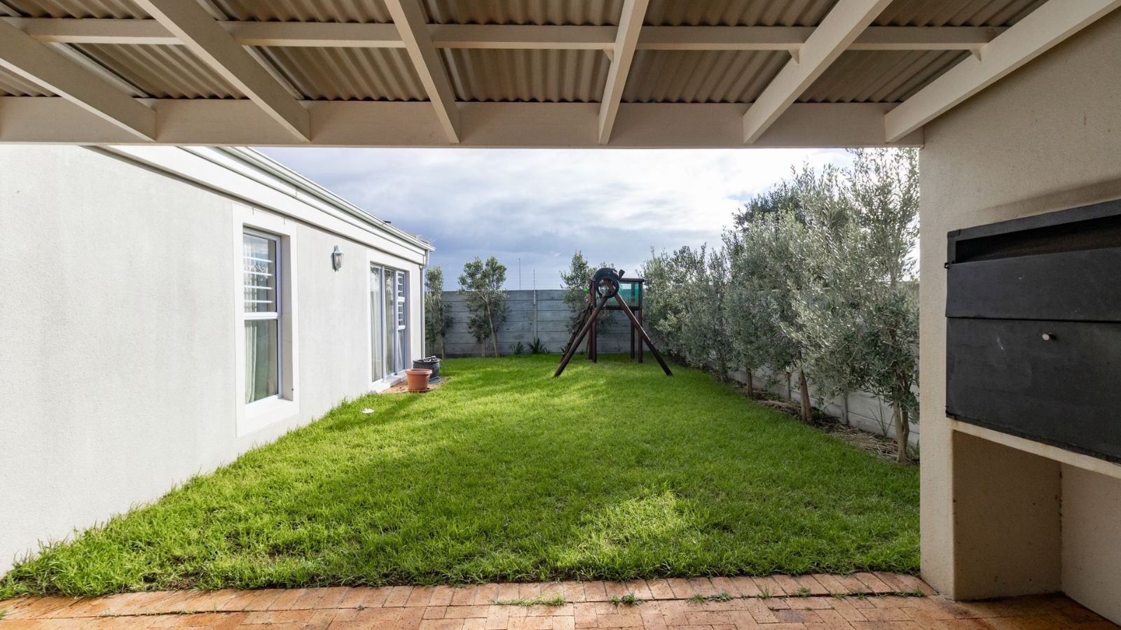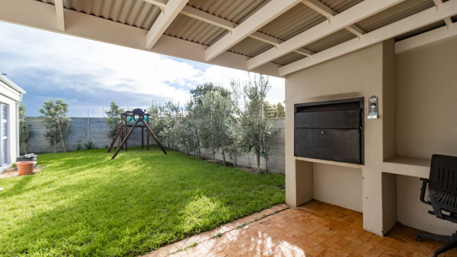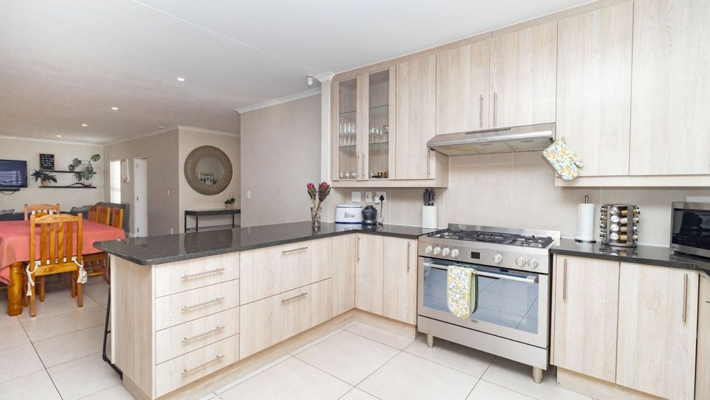 The heart of the home is the generously sized kitchen, complete with a scullery, perfect for the avid cook. The open-plan lounge and dining area create a warm and welcoming space, seamlessly flowing out to a covered patio, with a built-in braai– ideal for indoor-outdoor entertaining.