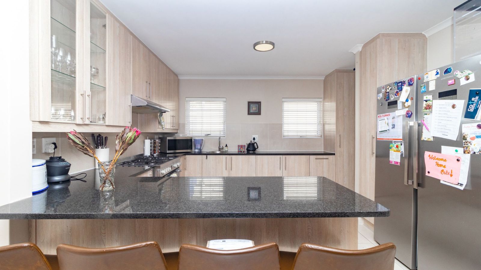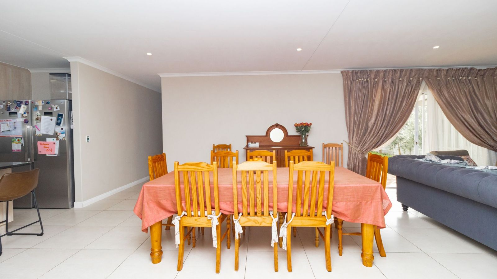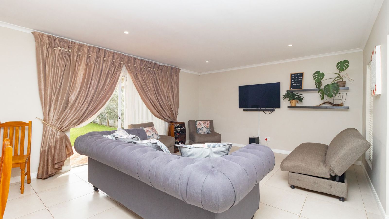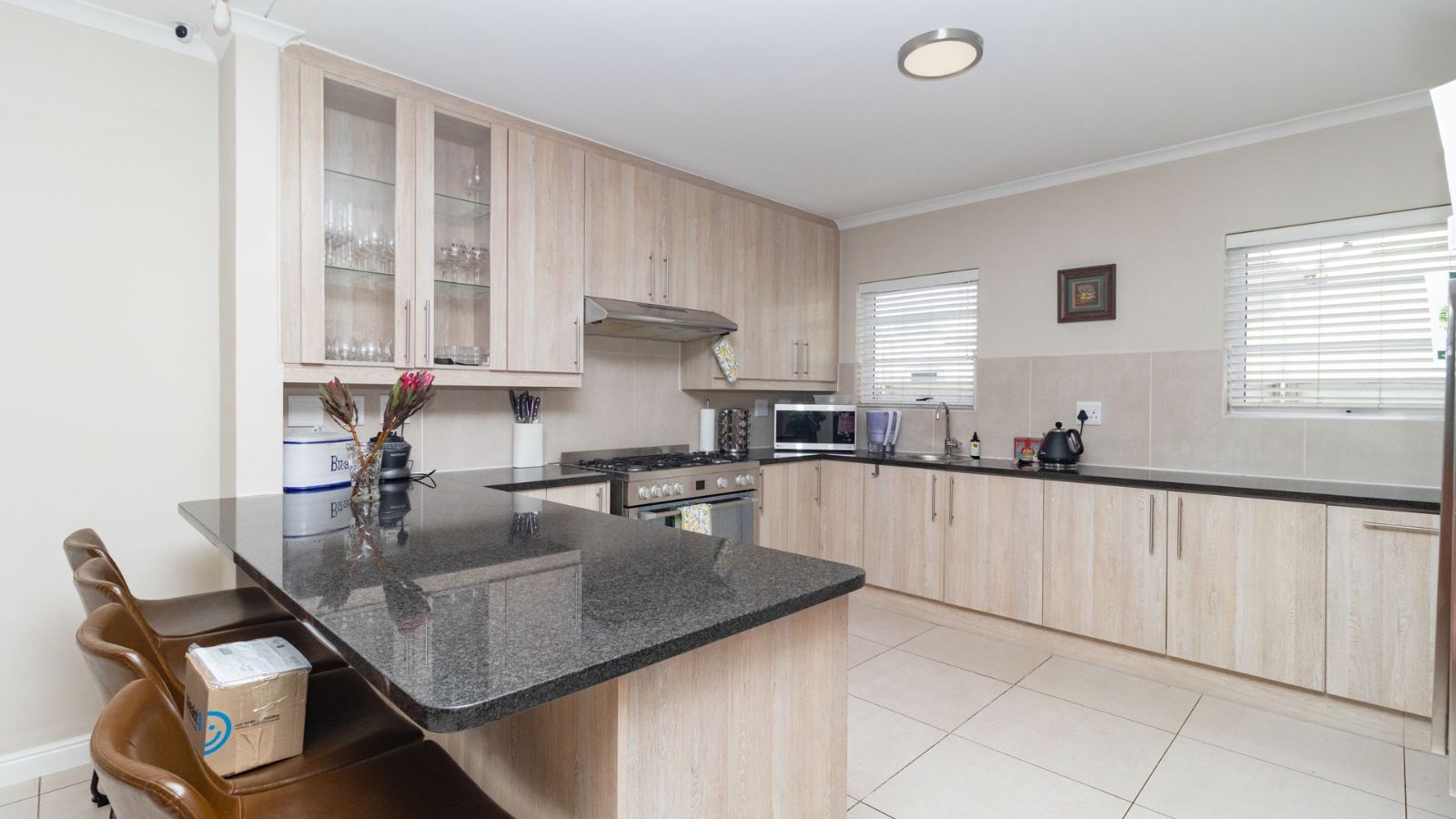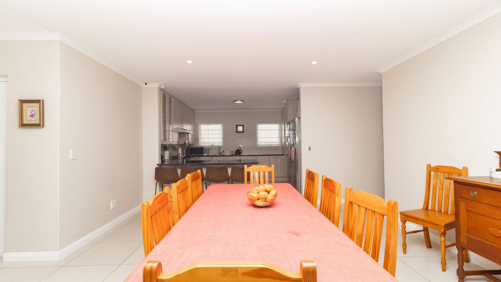 The heart of the home is the generously sized kitchen, complete with a scullery, perfect for the avid cook. The open-plan lounge and dining area create a warm and welcoming space, seamlessly flowing out to a covered patio, with a built-in braai– ideal for indoor-outdoor entertaining.