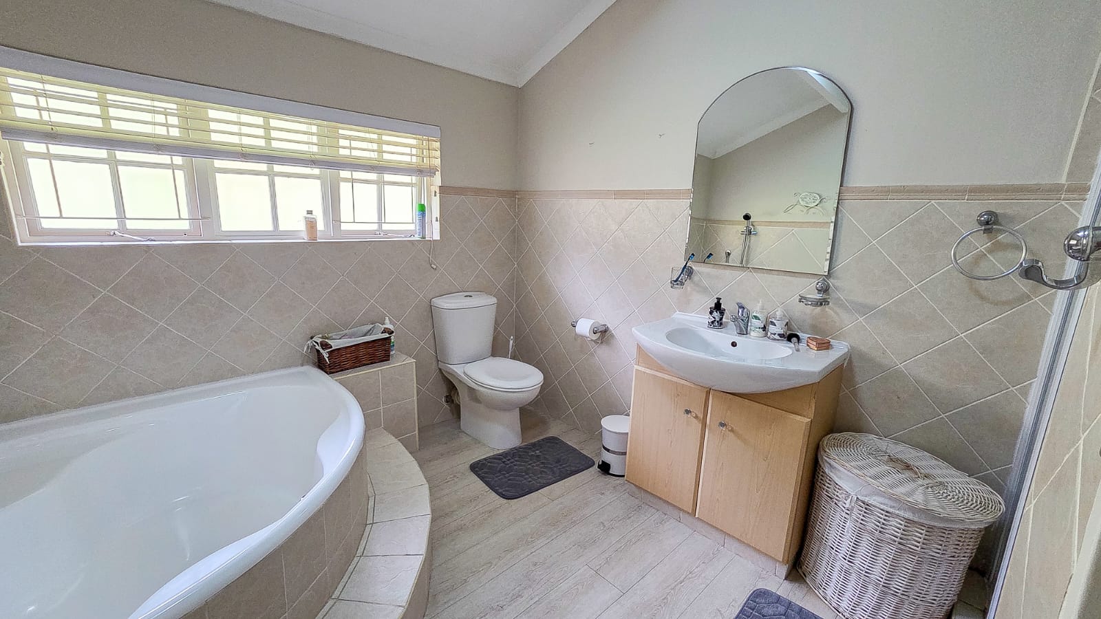 The main bedroom boasts a walk-in closet and a stylish ensuite bathroom complete with a bath, basin, and toilet. The second bathroom is a full family bathroom, with both bathrooms finished in laminated flooring for a contemporary, cohesive look.