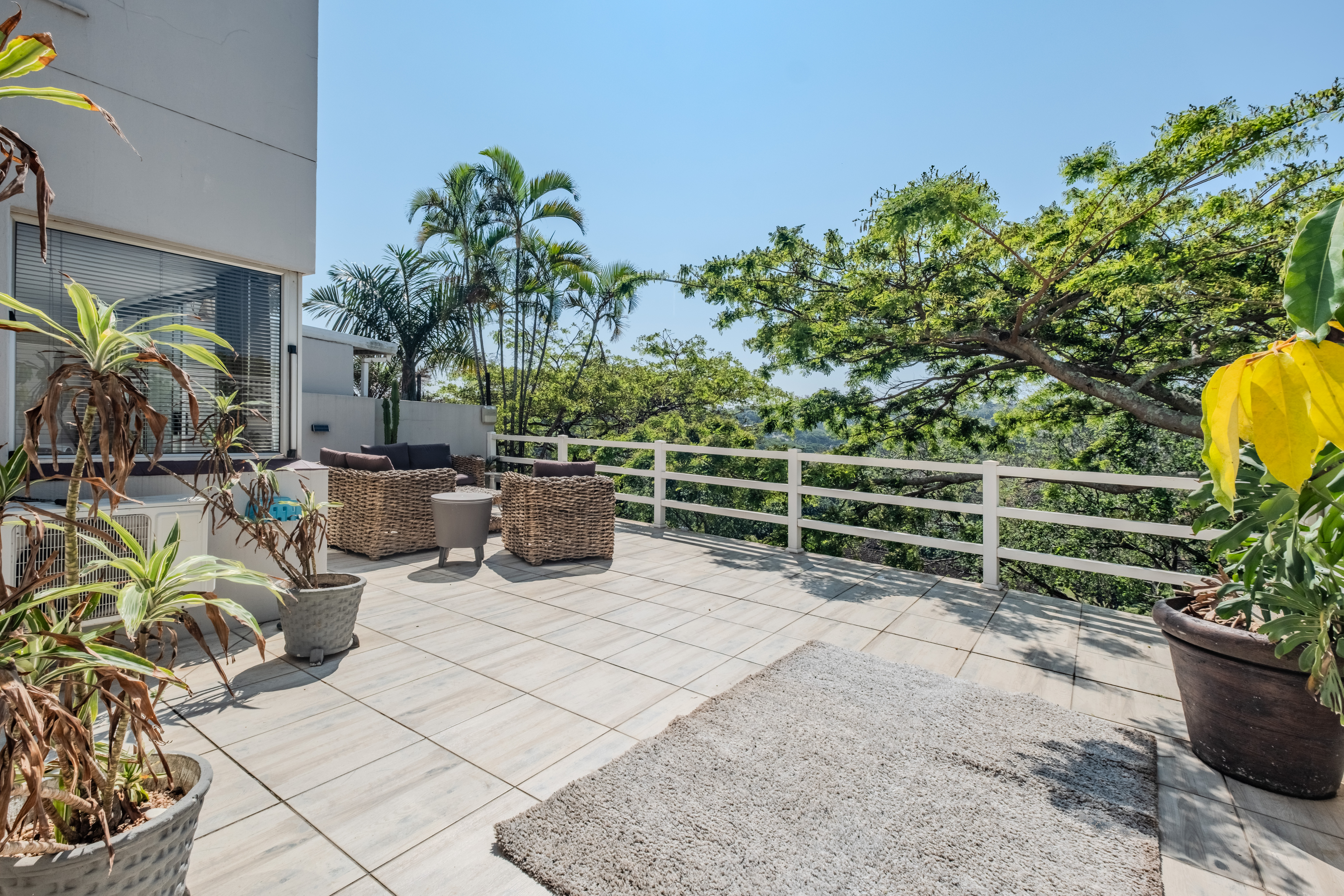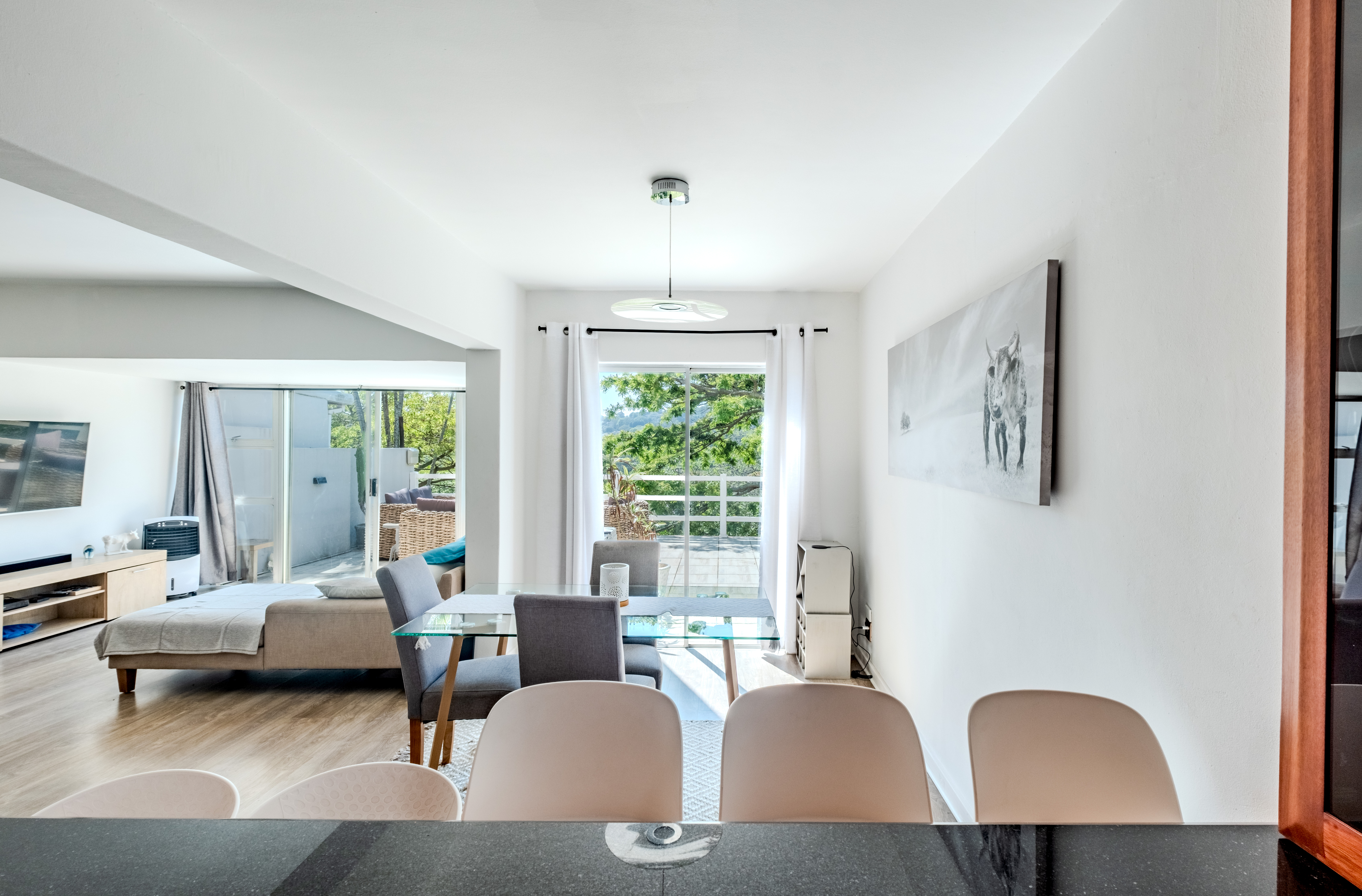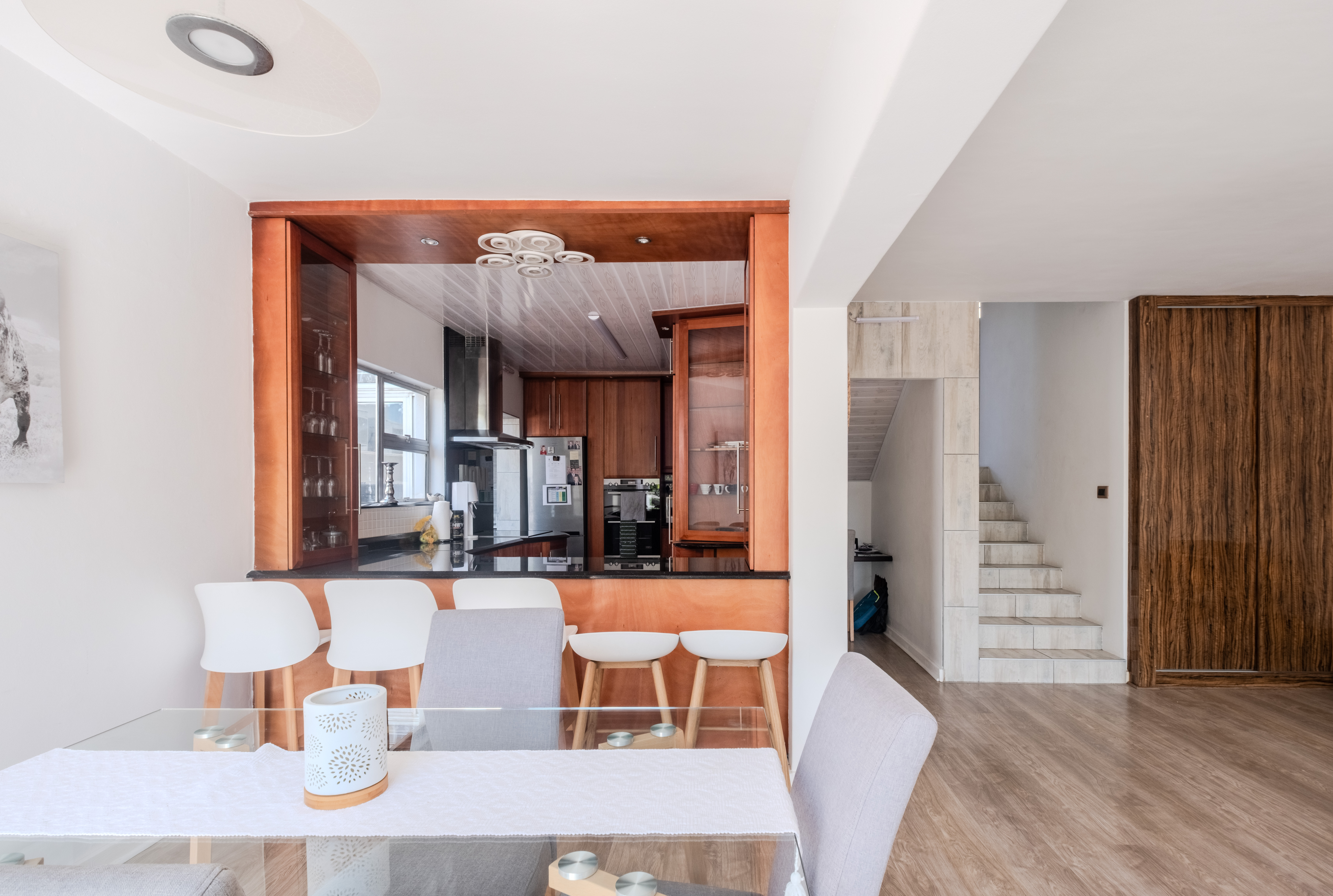 This light-filled duplex offers spacious open-plan living, flowing seamlessly onto an exceptionally large tiled patio with gorgeous views over Sunningdale Park and the leafy surrounds. The generously sized kitchen is fitted with granite countertops, ample cupboard space, and a separate scullery. It includes an electric hob with extractor, a double eye-level oven, and plumbing for both a washing machine and dishwasher.