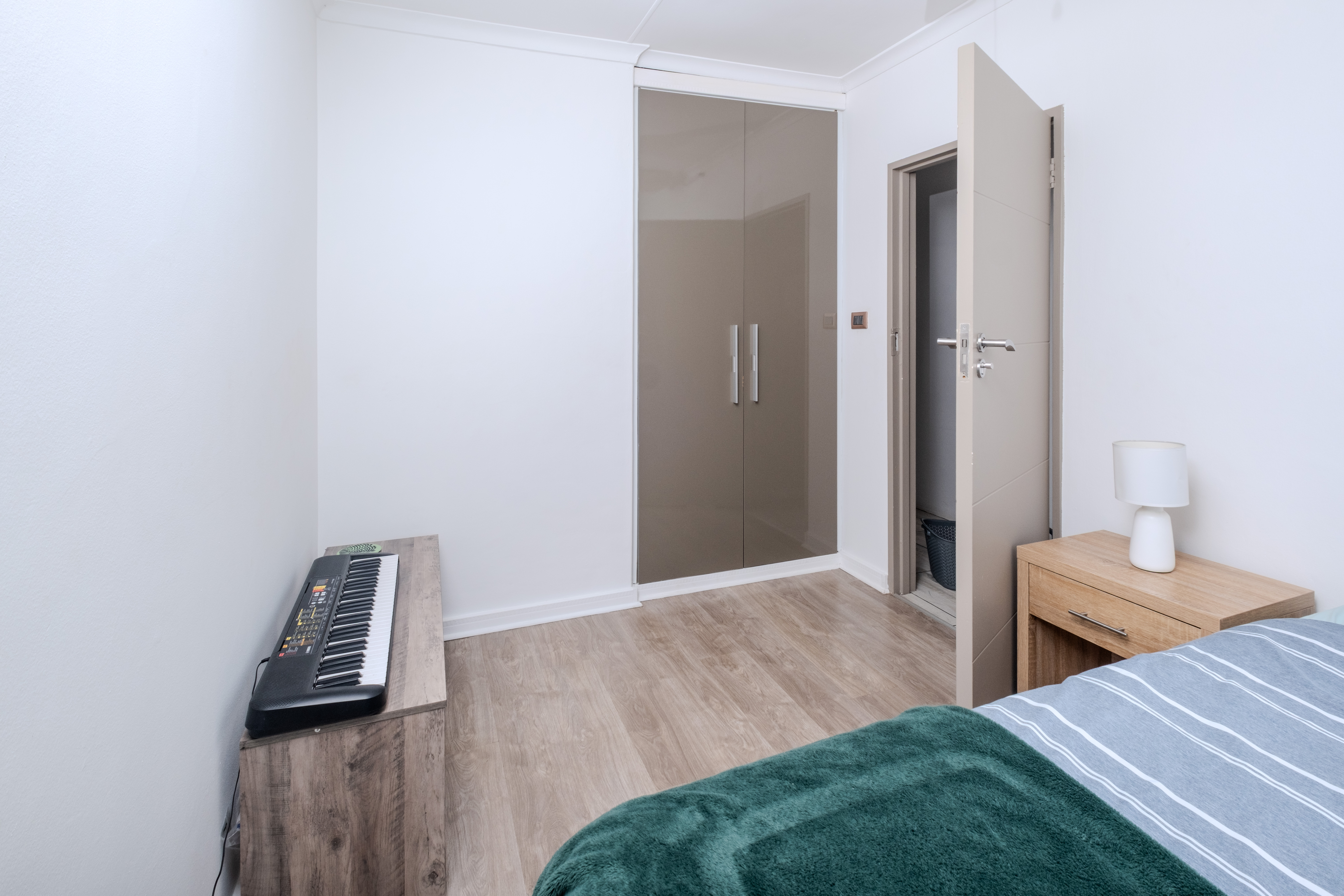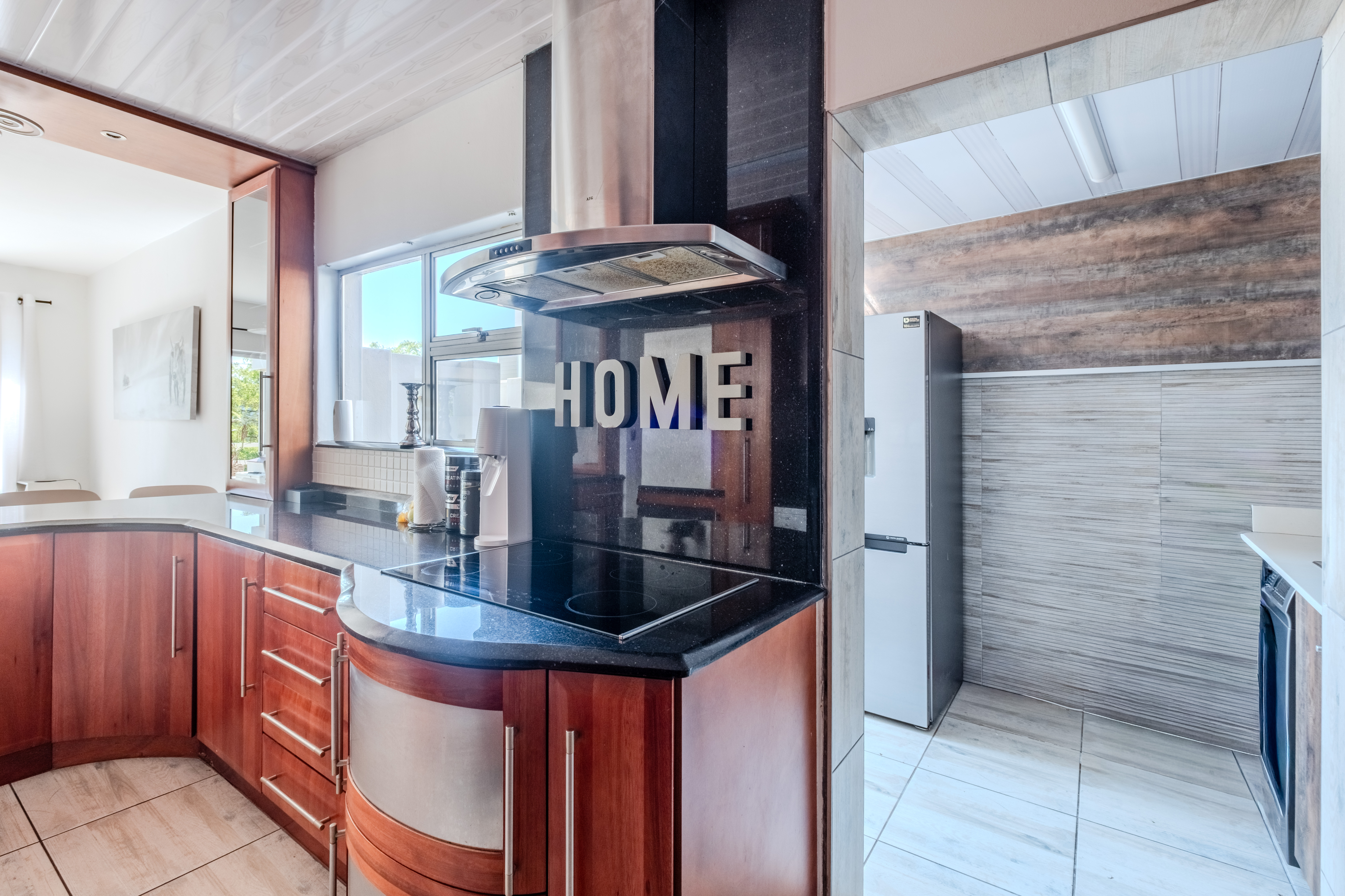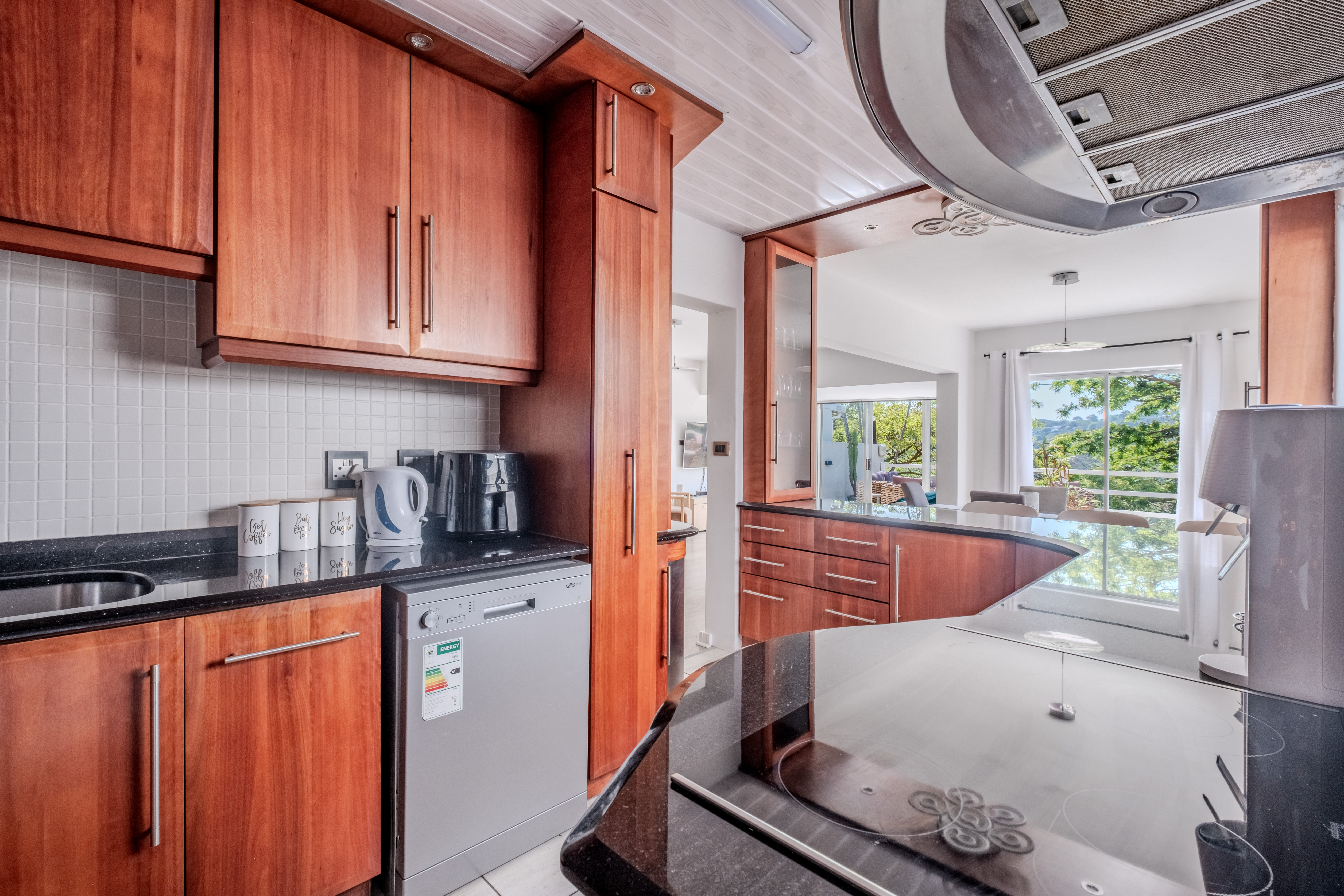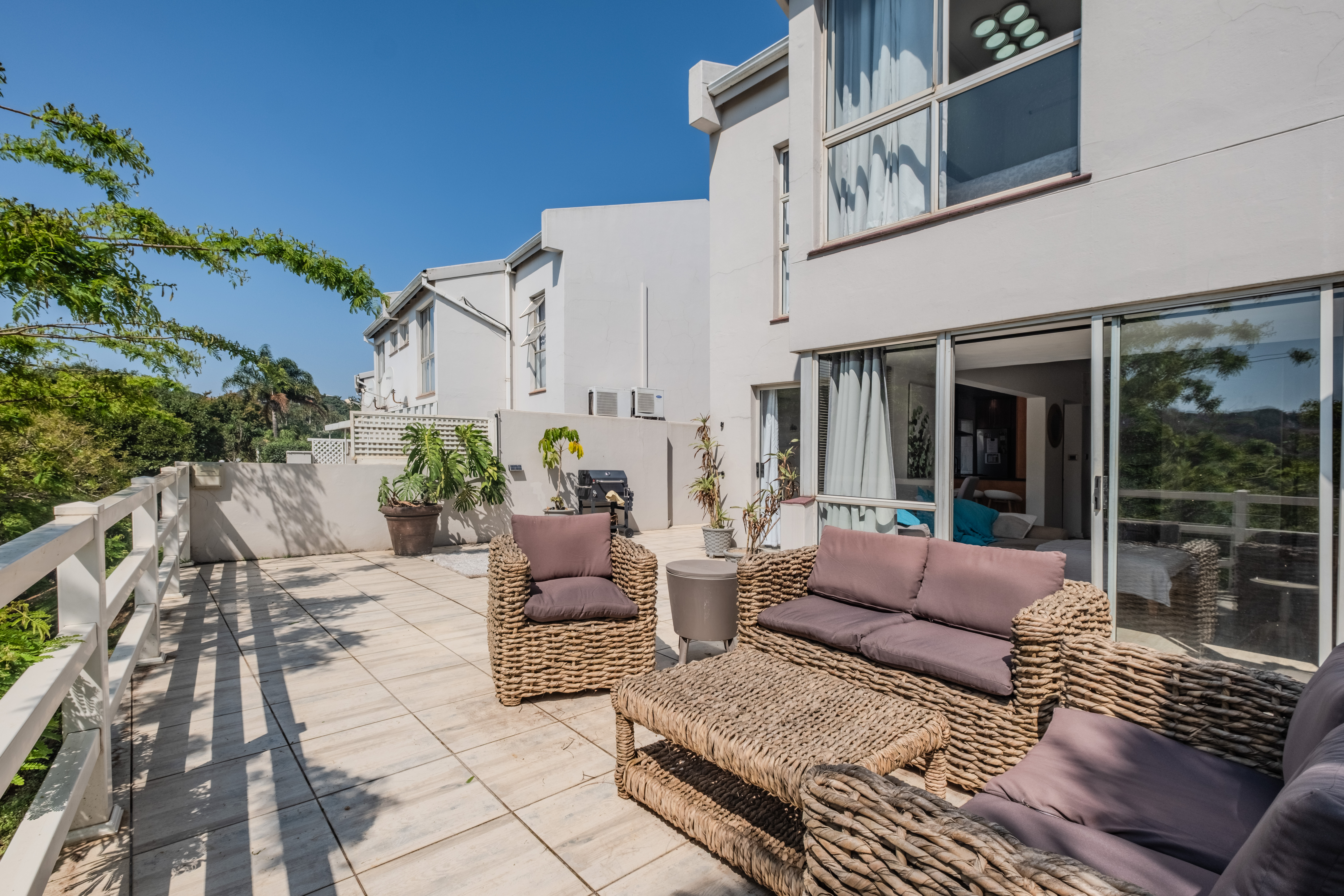 This light-filled duplex offers spacious open-plan living, flowing seamlessly onto an exceptionally large tiled patio with gorgeous views over Sunningdale Park and the leafy surrounds. The generously sized kitchen is fitted with granite countertops, ample cupboard space, and a separate scullery. It includes an electric hob with extractor, a double eye-level oven, and plumbing for both a washing machine and dishwasher.