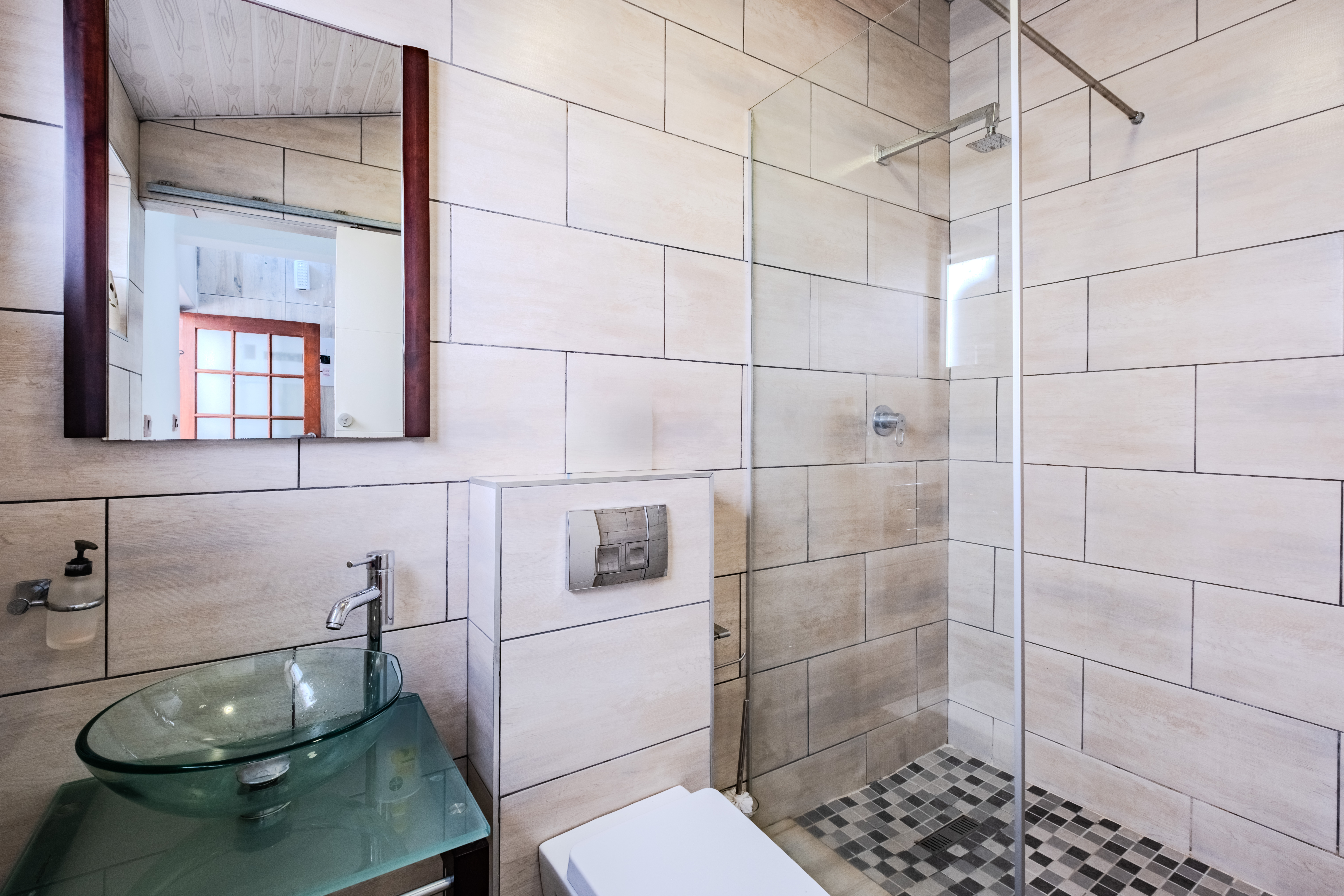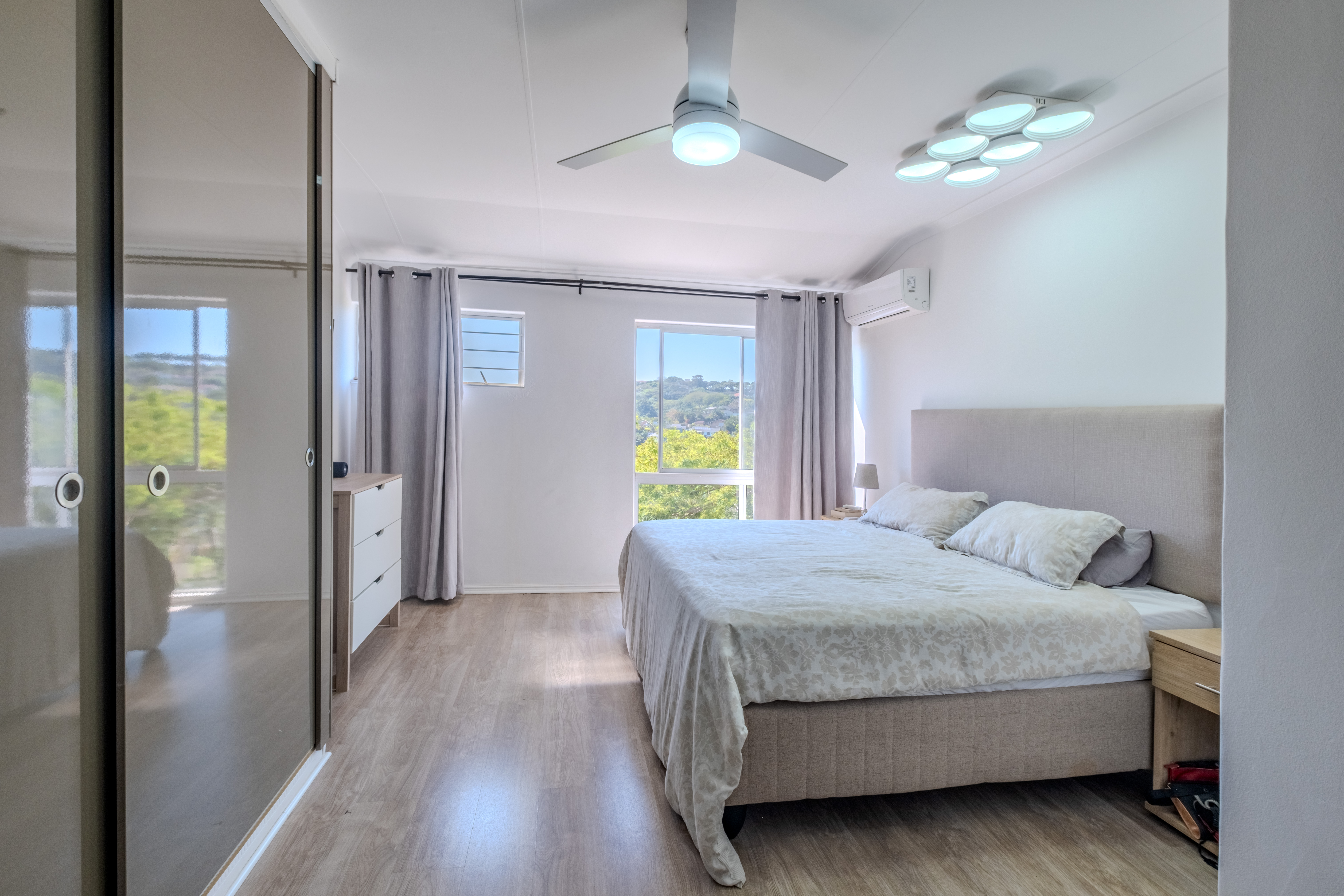 Upstairs, the primary suite features an air-conditioner, sliding door wardrobes, and a full en-suite bathroom with a bathtub, loo, and basin. Large sliding windows frame the tranquil views. Two additional bedrooms, each with built-in cupboards and ceiling fans, share a bathroom with a shower, loo, and basin.
