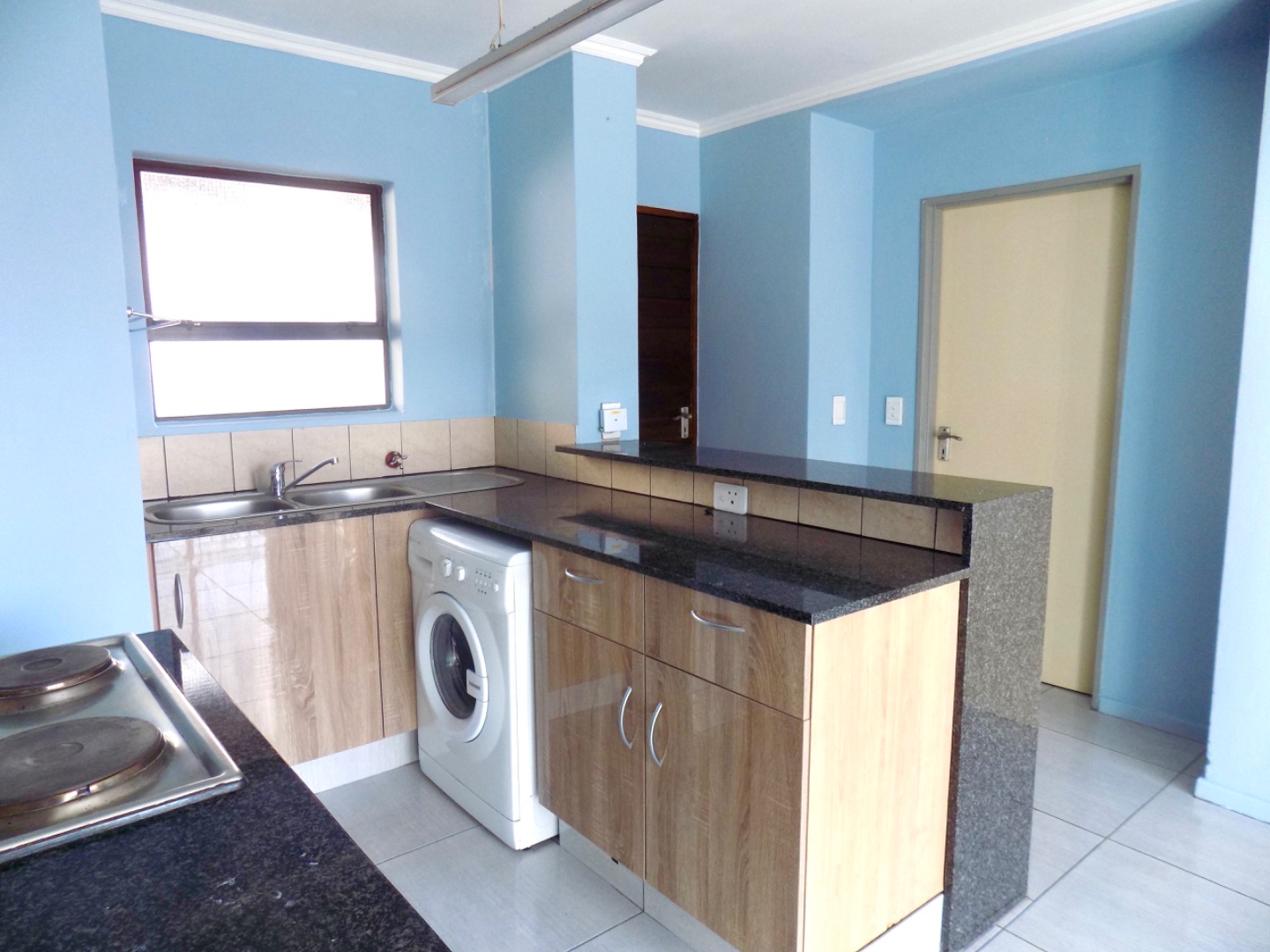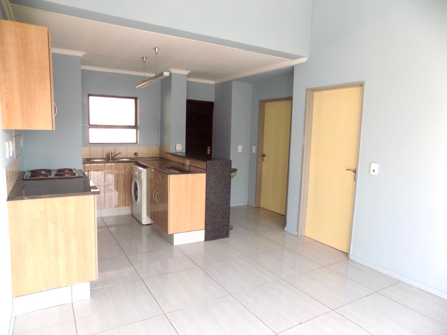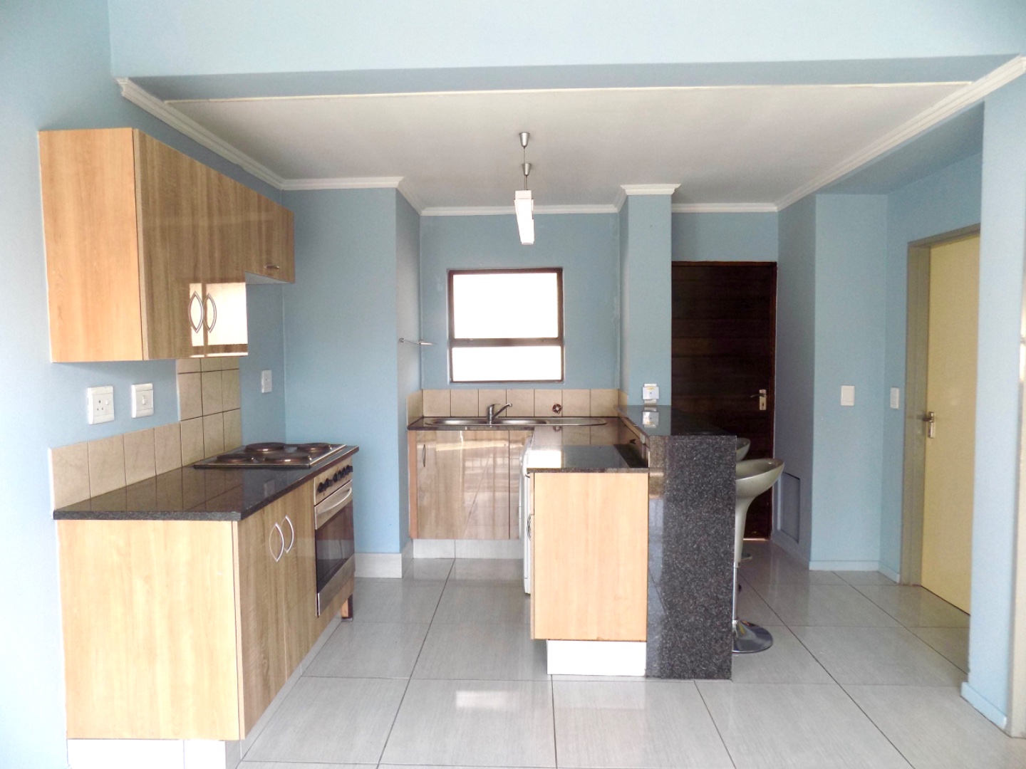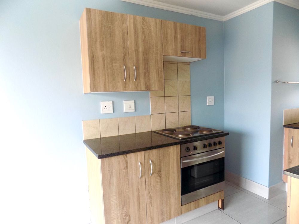 The stylish kitchen offers modern wood cupboards with melamine tops. Provision has been made for a single door fridge and one under counter appliance.
