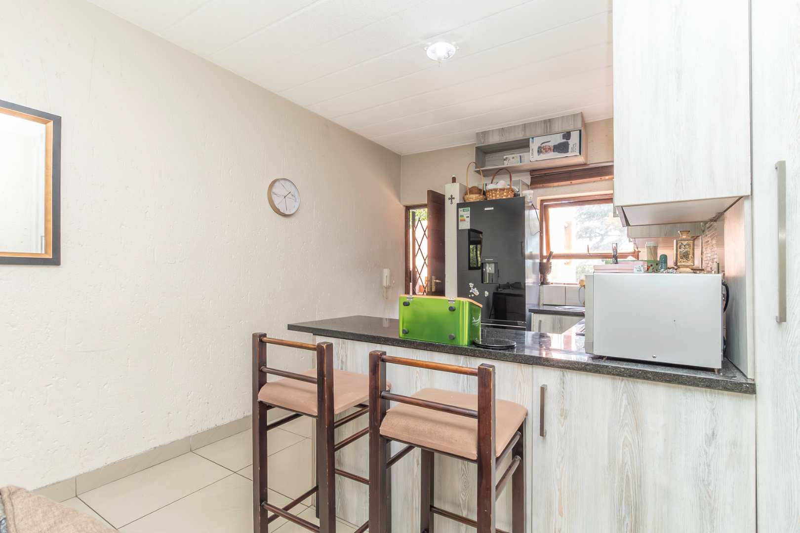 The living room is a highlight of this property, offering a large, tiled area perfect for entertaining guests or enjoying a quiet evening at home. Adjacent to the living room, the tiled kitchen is well-equipped and ideal for those who love to cook.