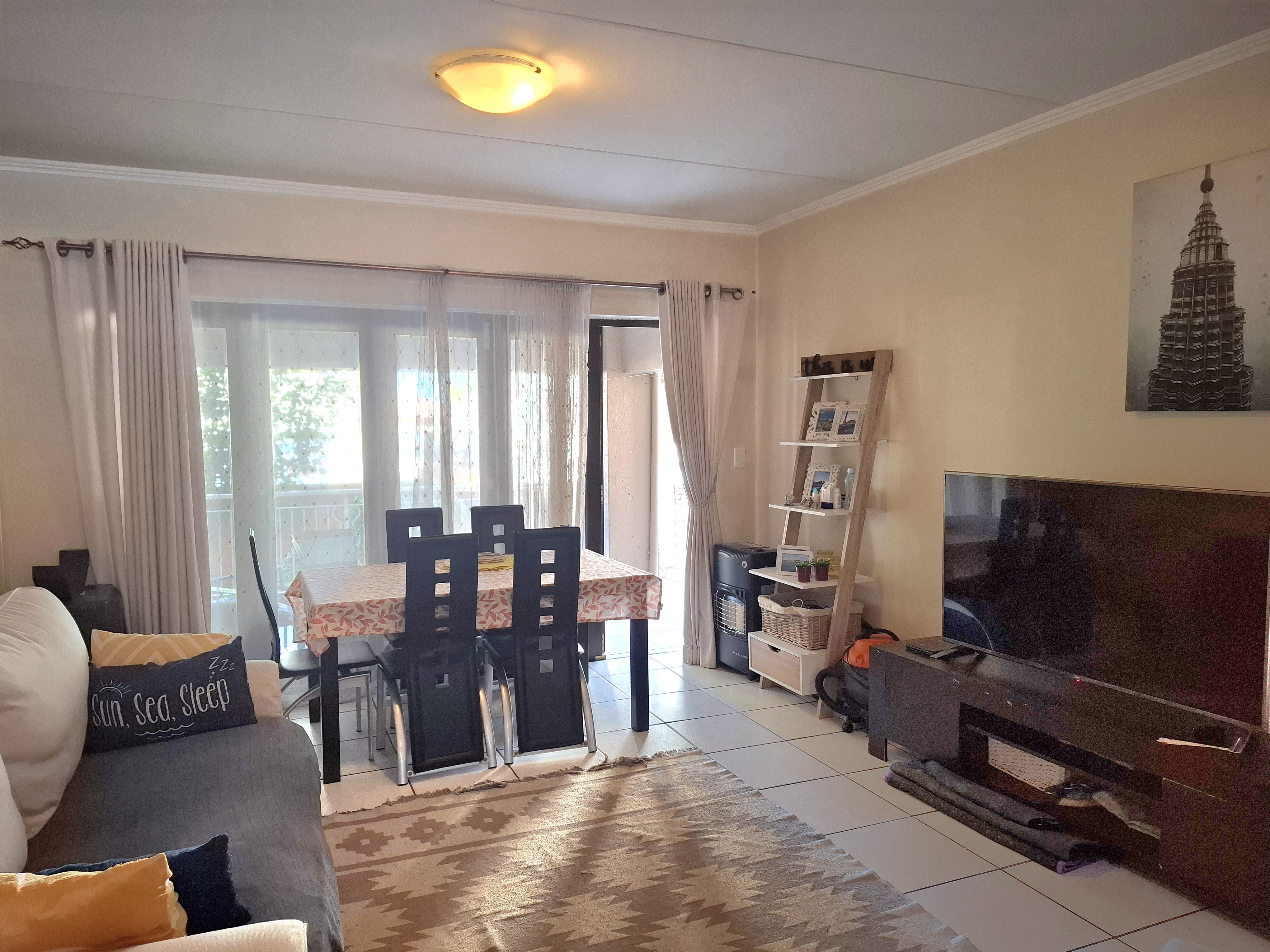2 bedrooms and 1 family bathroom for Sale. Come view, Let's Chat! 95 sq m Open plan kitchen with centre island with new electric stove and oven, Perfect for entertaining and mingling with family and friends. The large spacious living room / dining room steps out to a covered balcony. Stacking doors offer a indoor-outdoor living lifestyle. The apartment is tiled with warm laminate flooring in the bedrooms and extra storage in the passage. CSOS levy R31.96. Water and electricity is billed according to consumption.