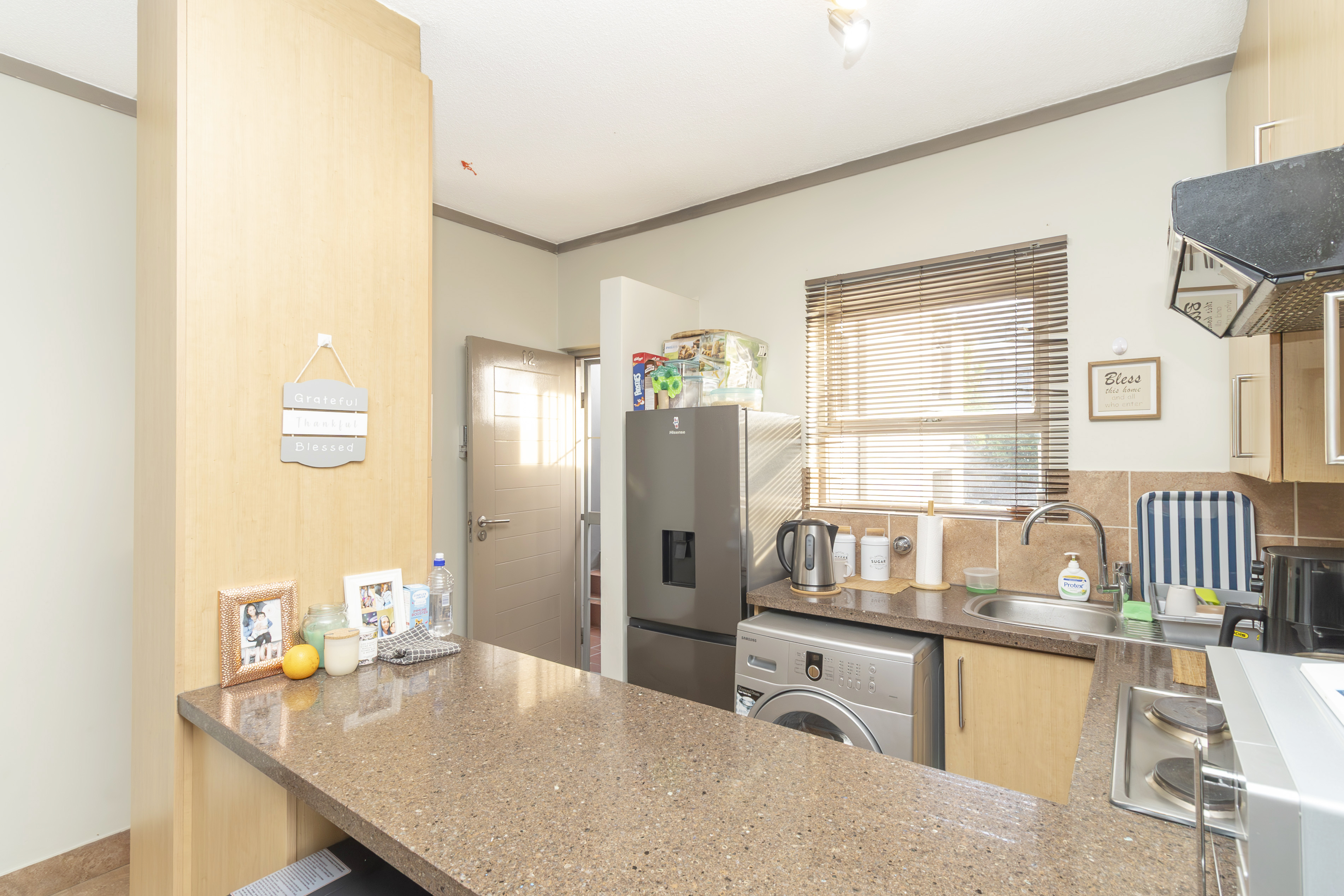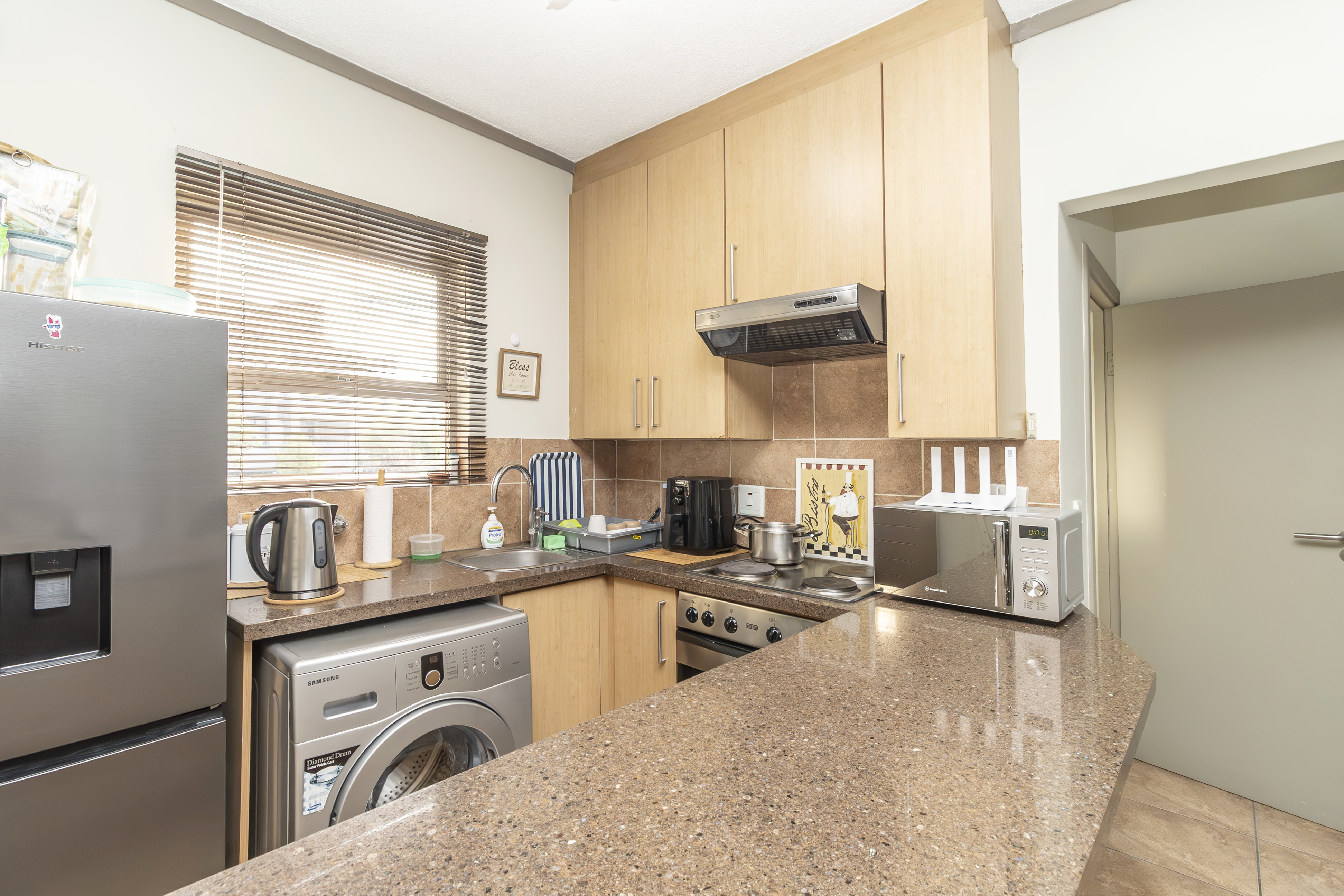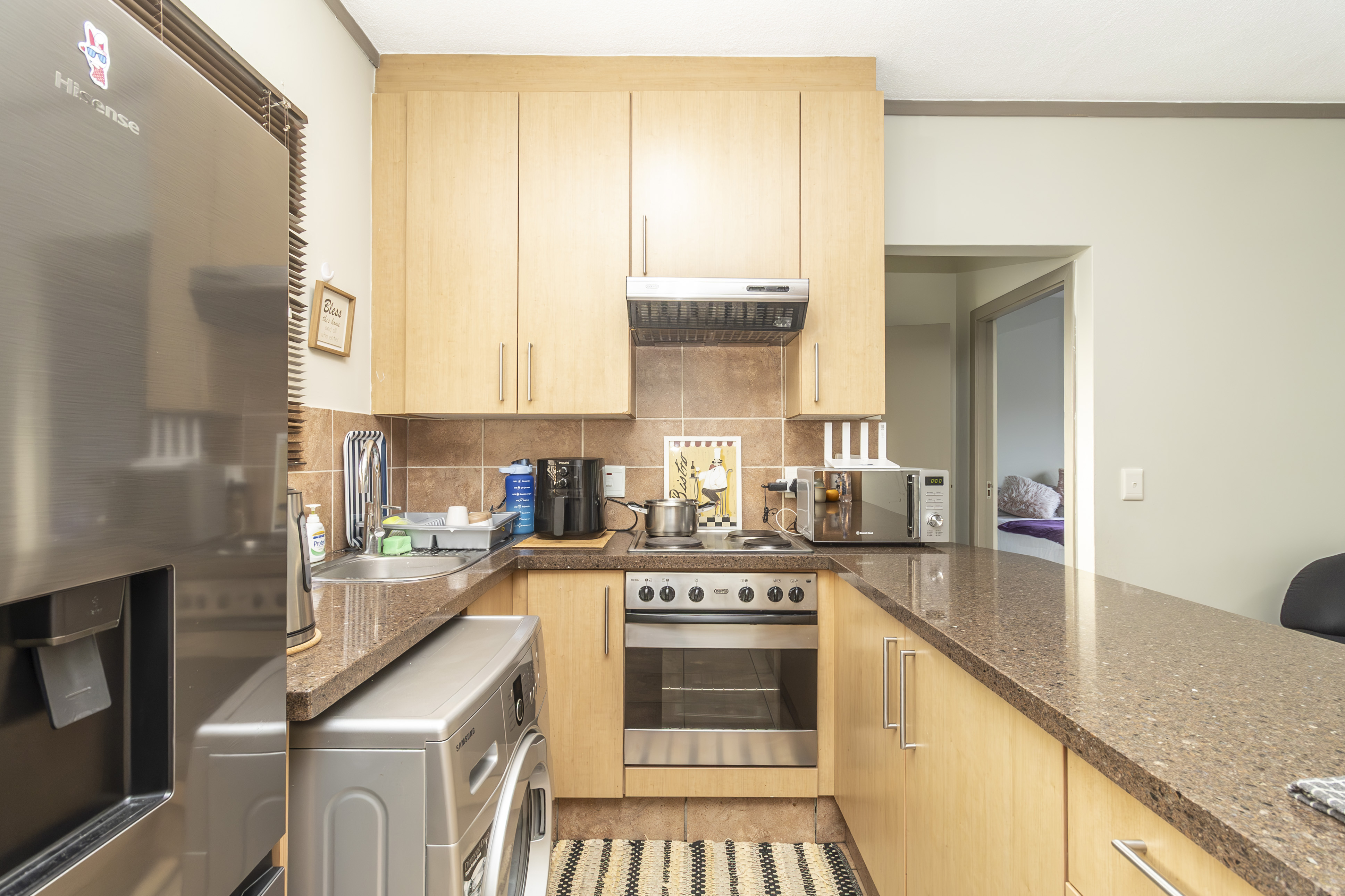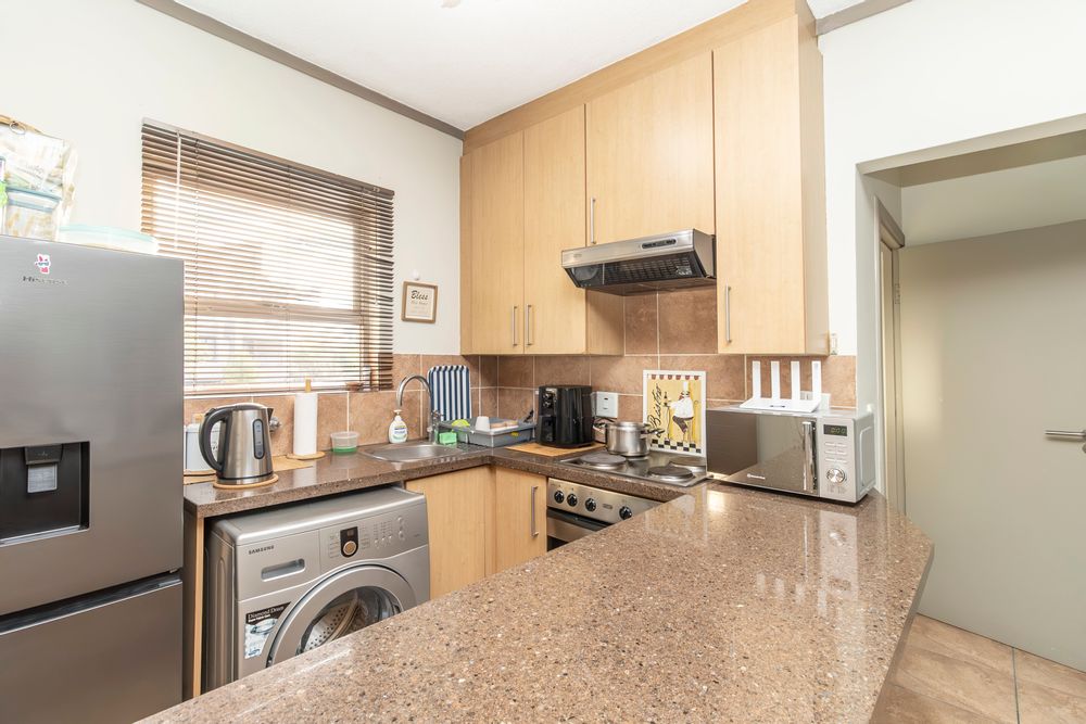 Open-plan kitchen that flows effortlessly into a cozy lounge and large private balcony with built in braai– just right for morning coffee or evening wine.