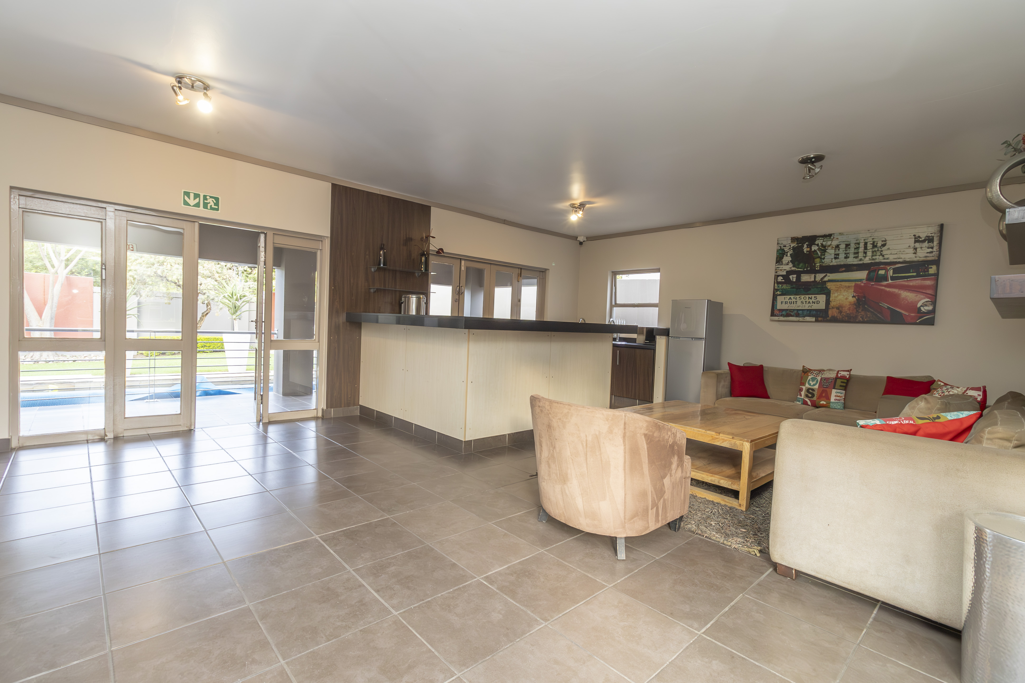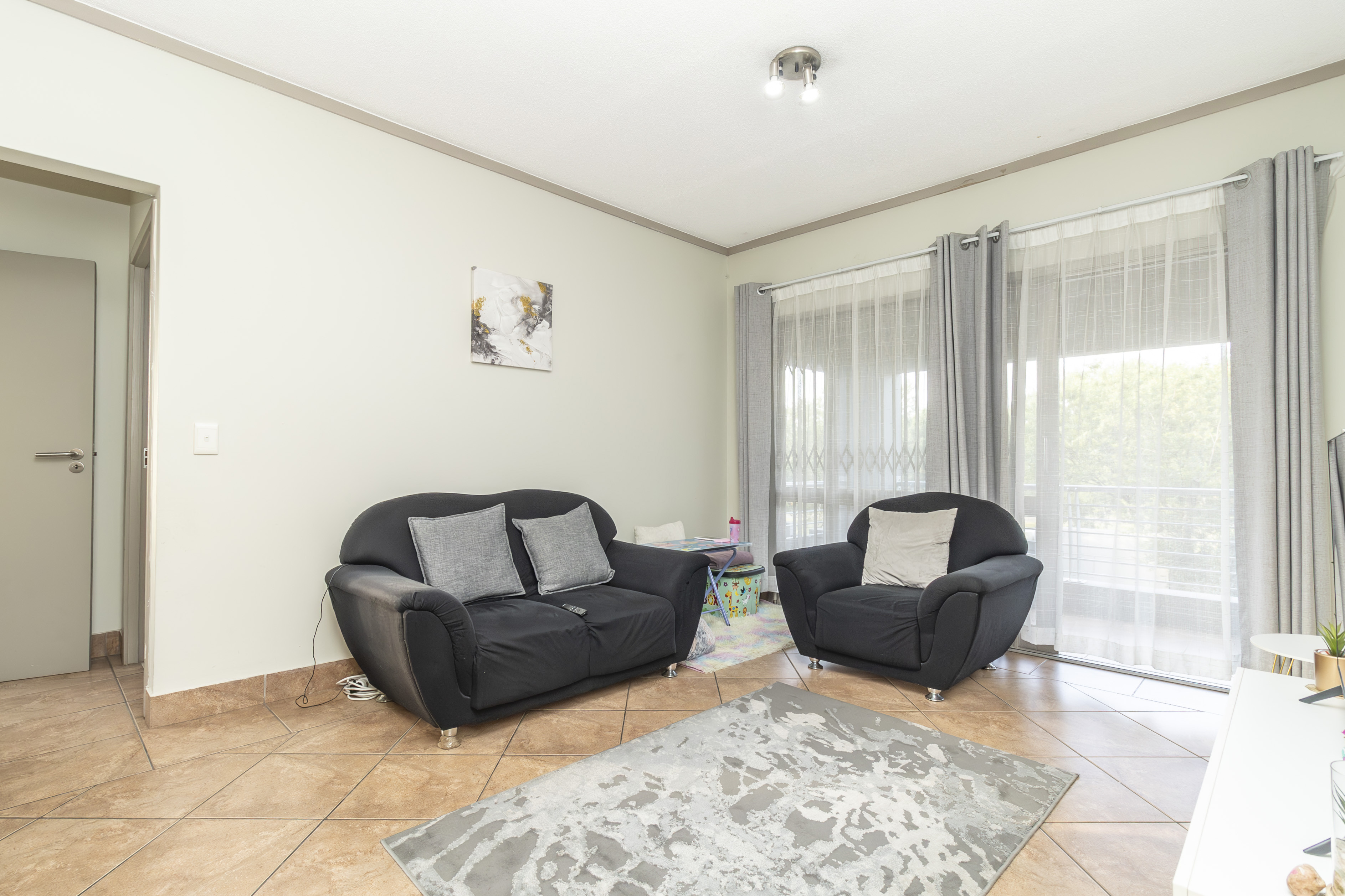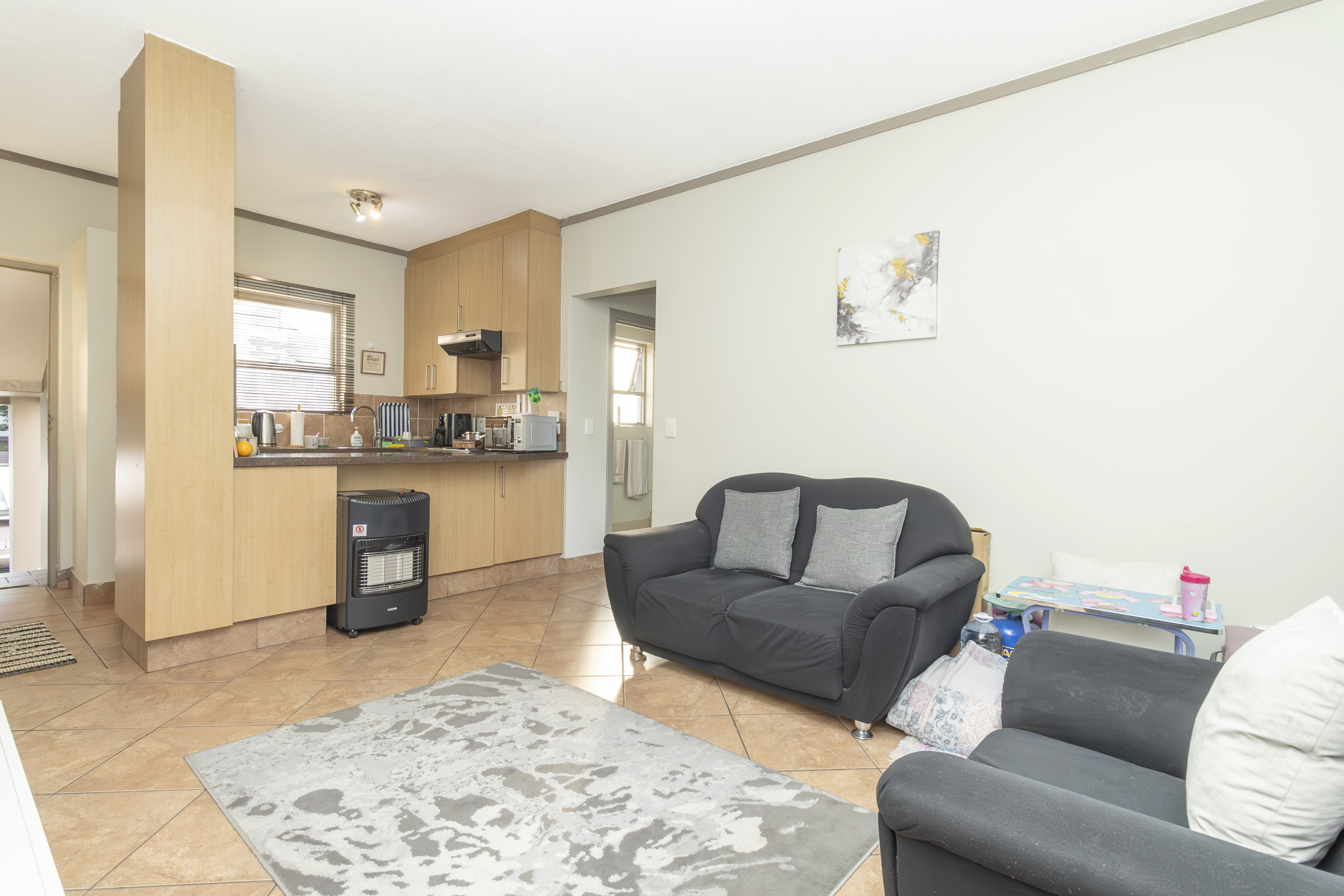 Open-plan kitchen that flows effortlessly into a cozy lounge and large private balcony with built in braai– just right for morning coffee or evening wine.