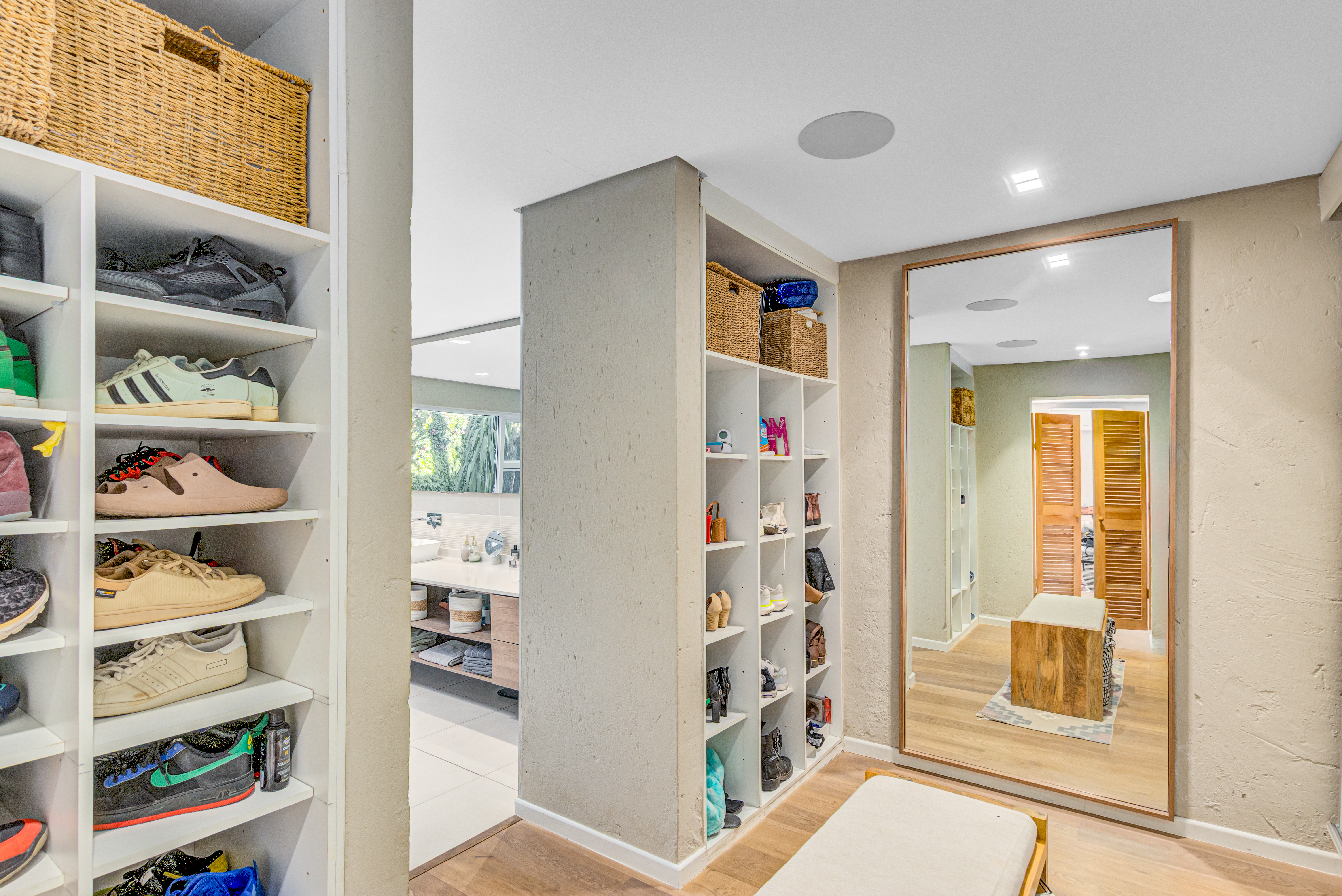 A walk-through closet, an elegant en-suite with twin showers, a double vanity, and a stunning freestanding tub