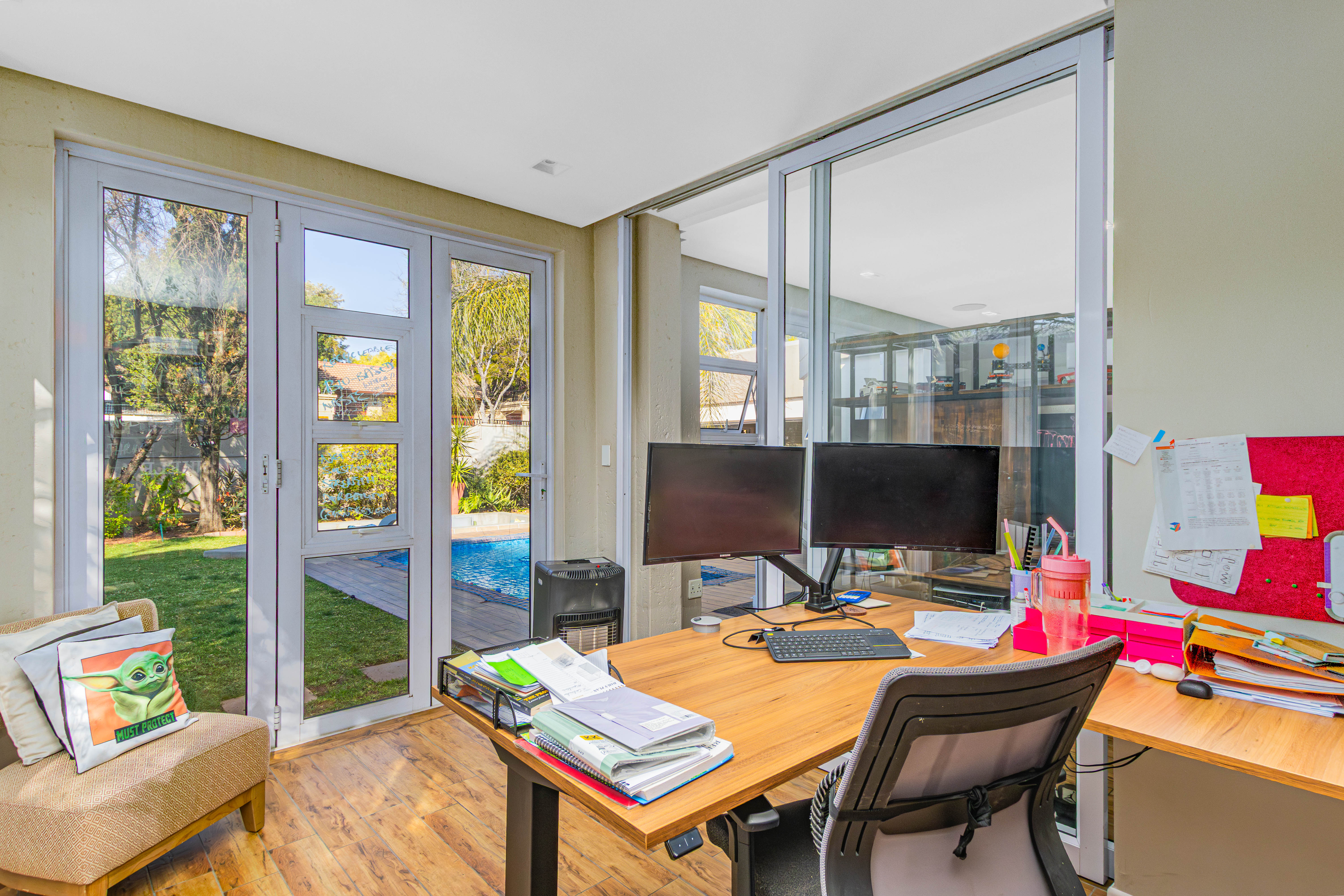 Flexible Living: Dining and lounge spaces are interchangeable, both allowing easy access to a sleek, glass-enclosed home office, perfect for work-from-home convenience.