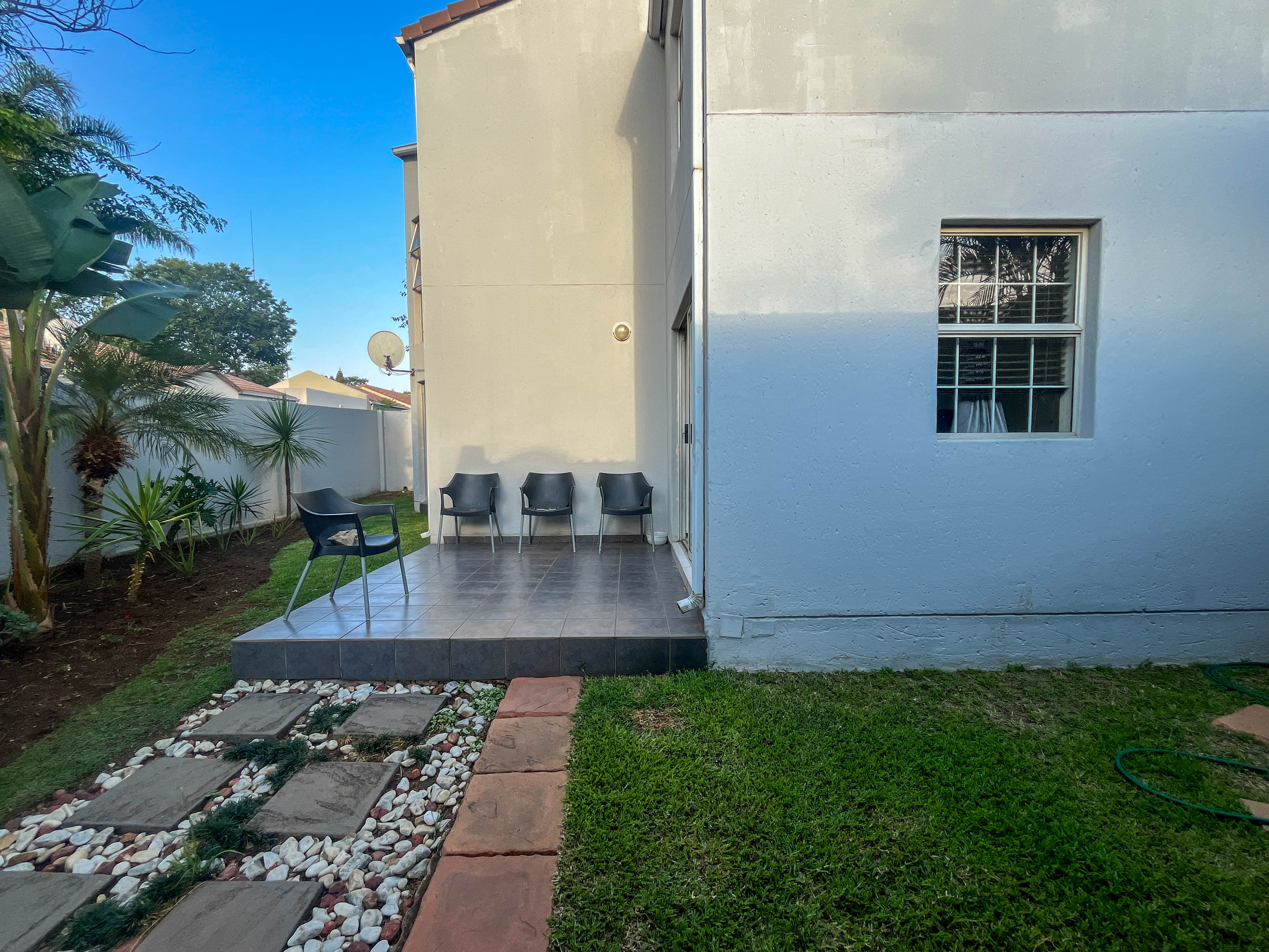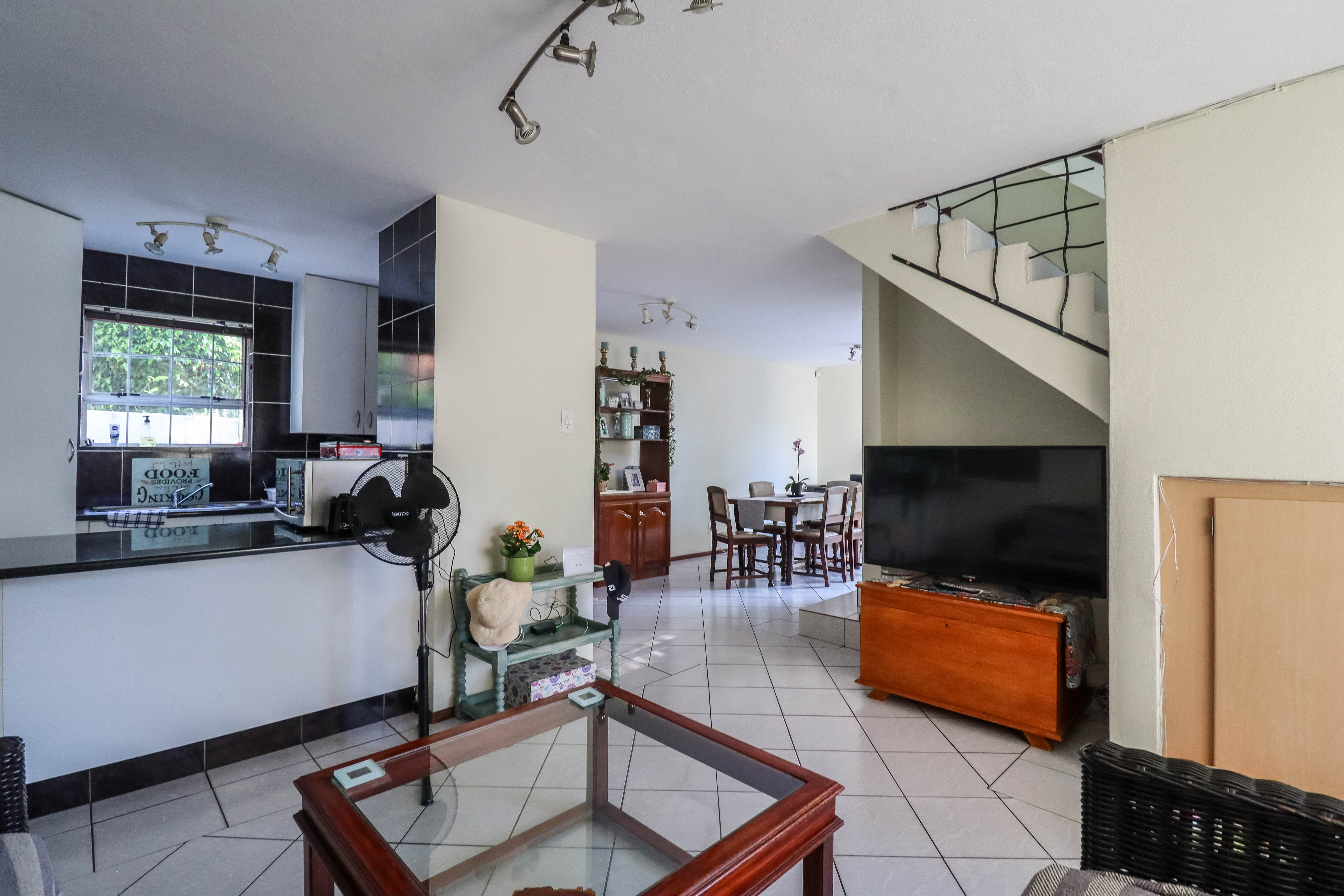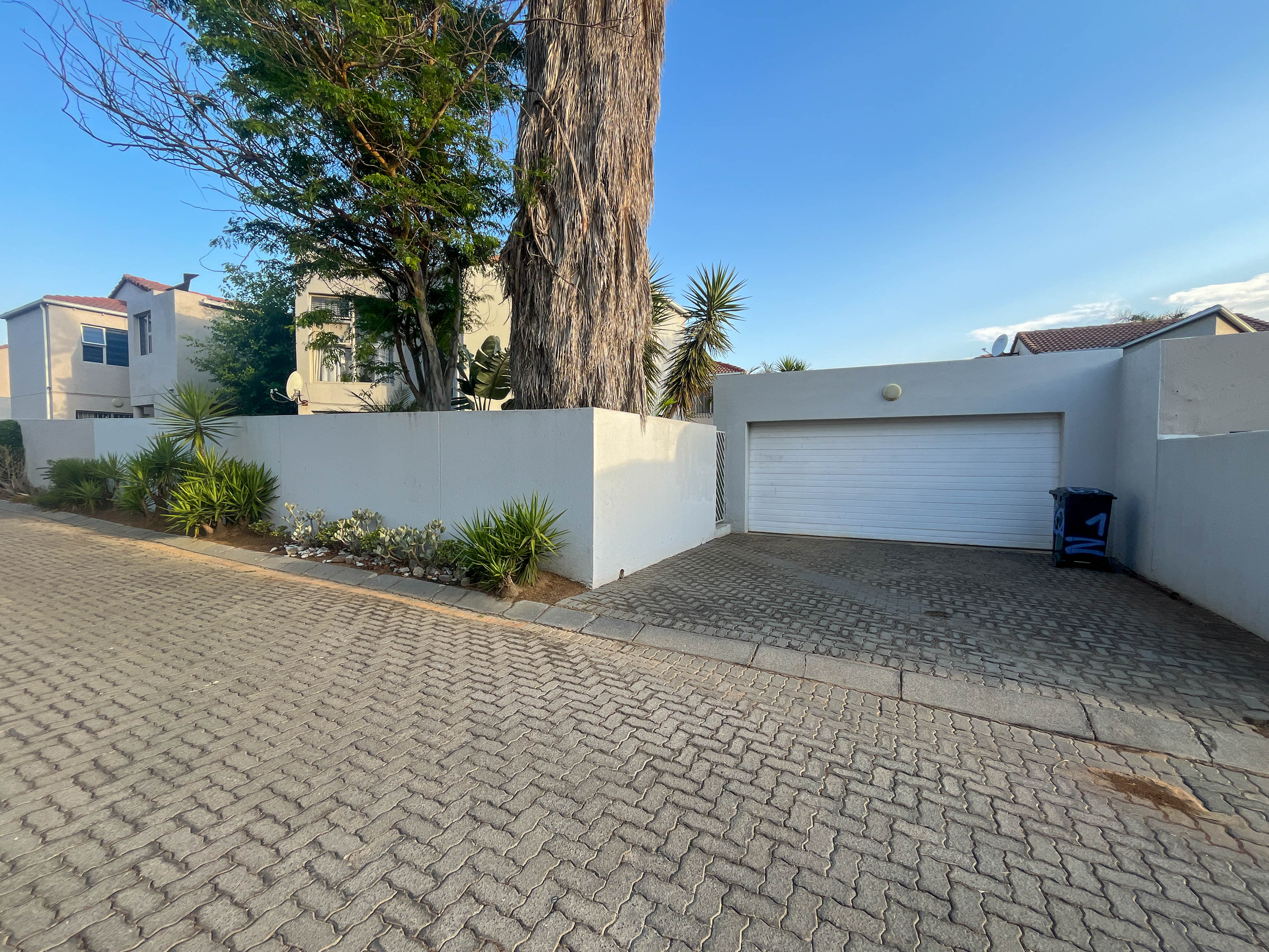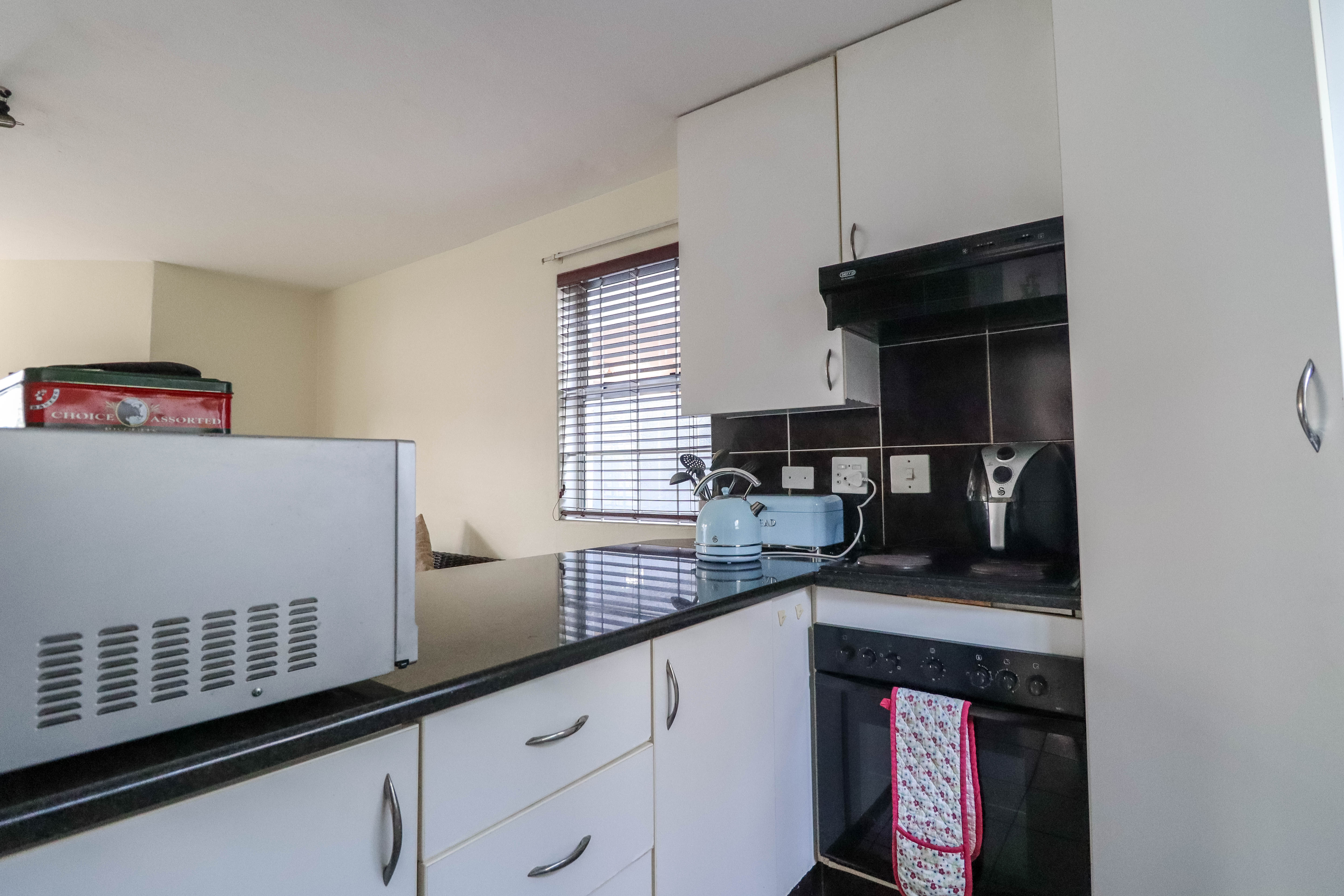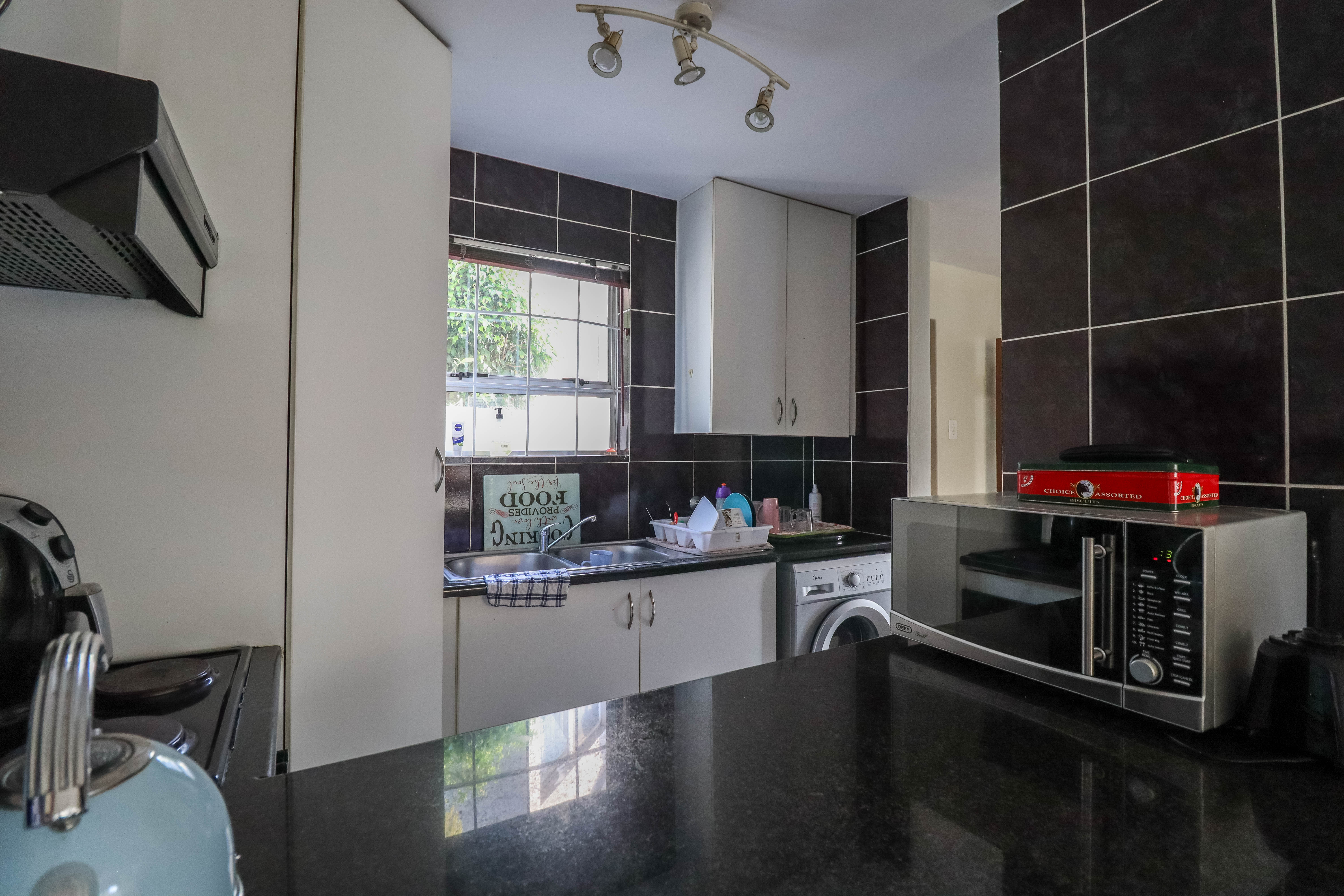 Beautiful two bedroomed cluster in a secure complex . Open plan tiled living and dining area, with sliders leading out to a private garden and open patio. Granite kitchen with built-in pantry cupboard and breakfast bar .Two bedrooms with ample built-in cupboards and two bathrooms (mes ) with oval tub and shower.