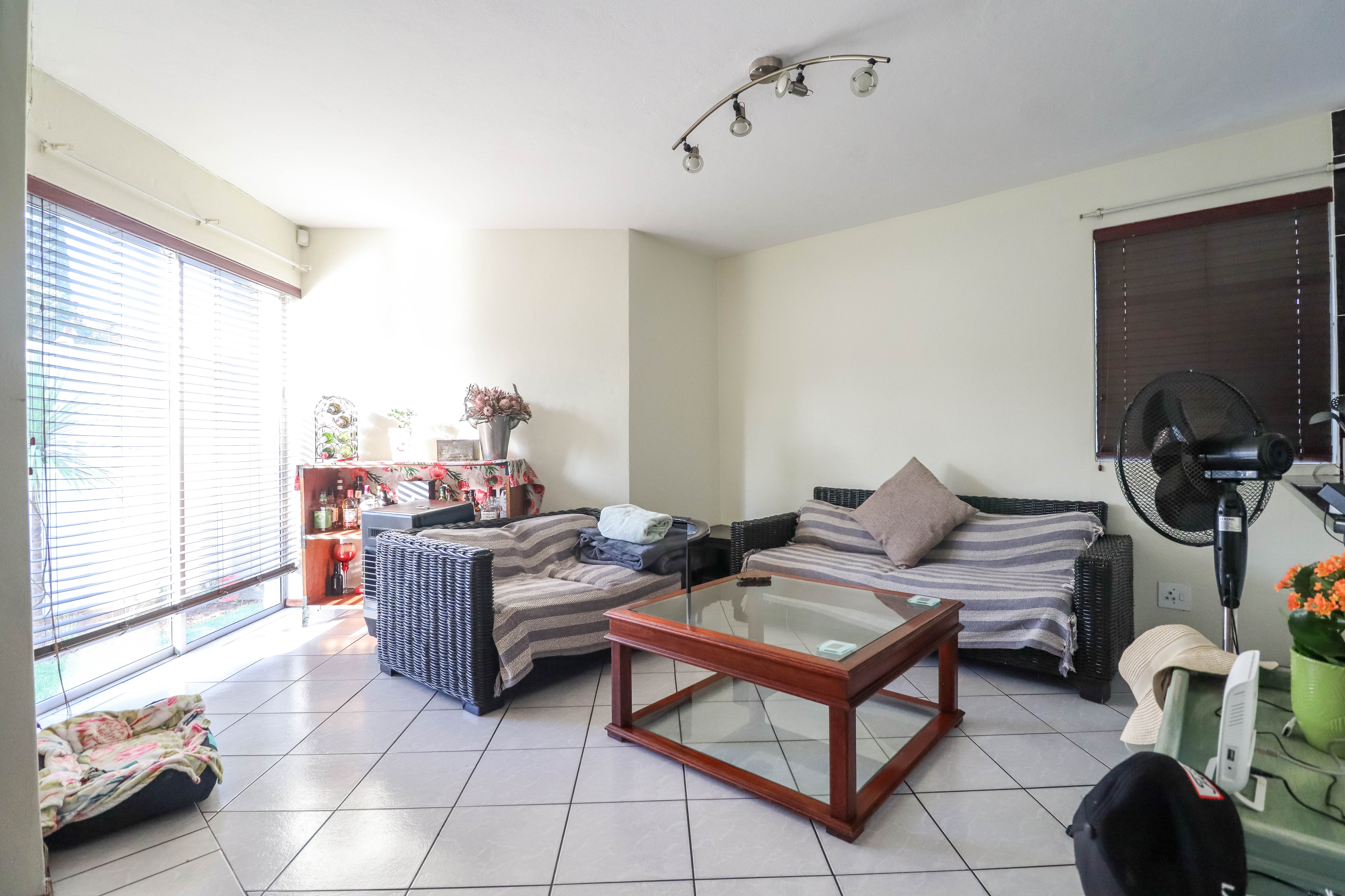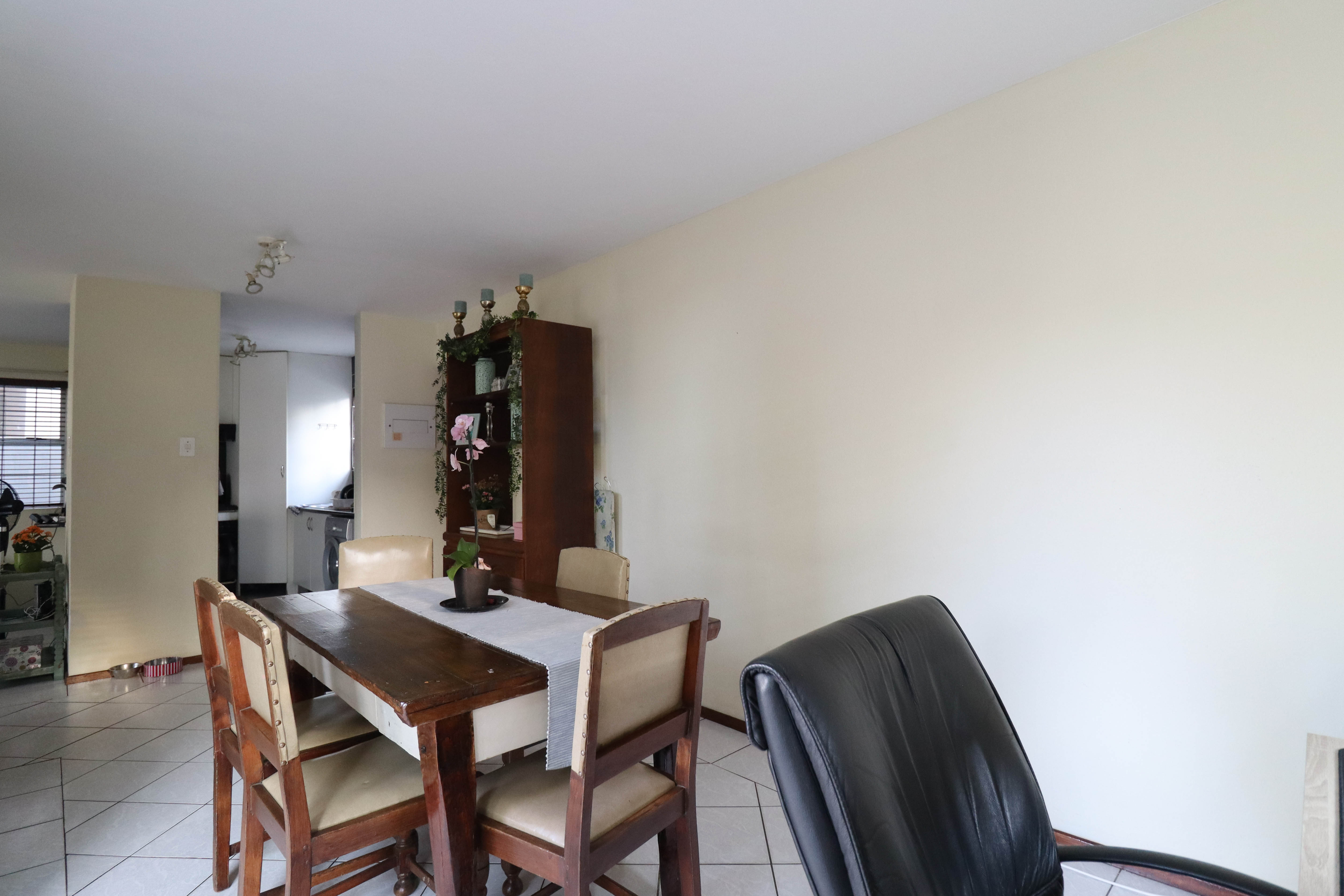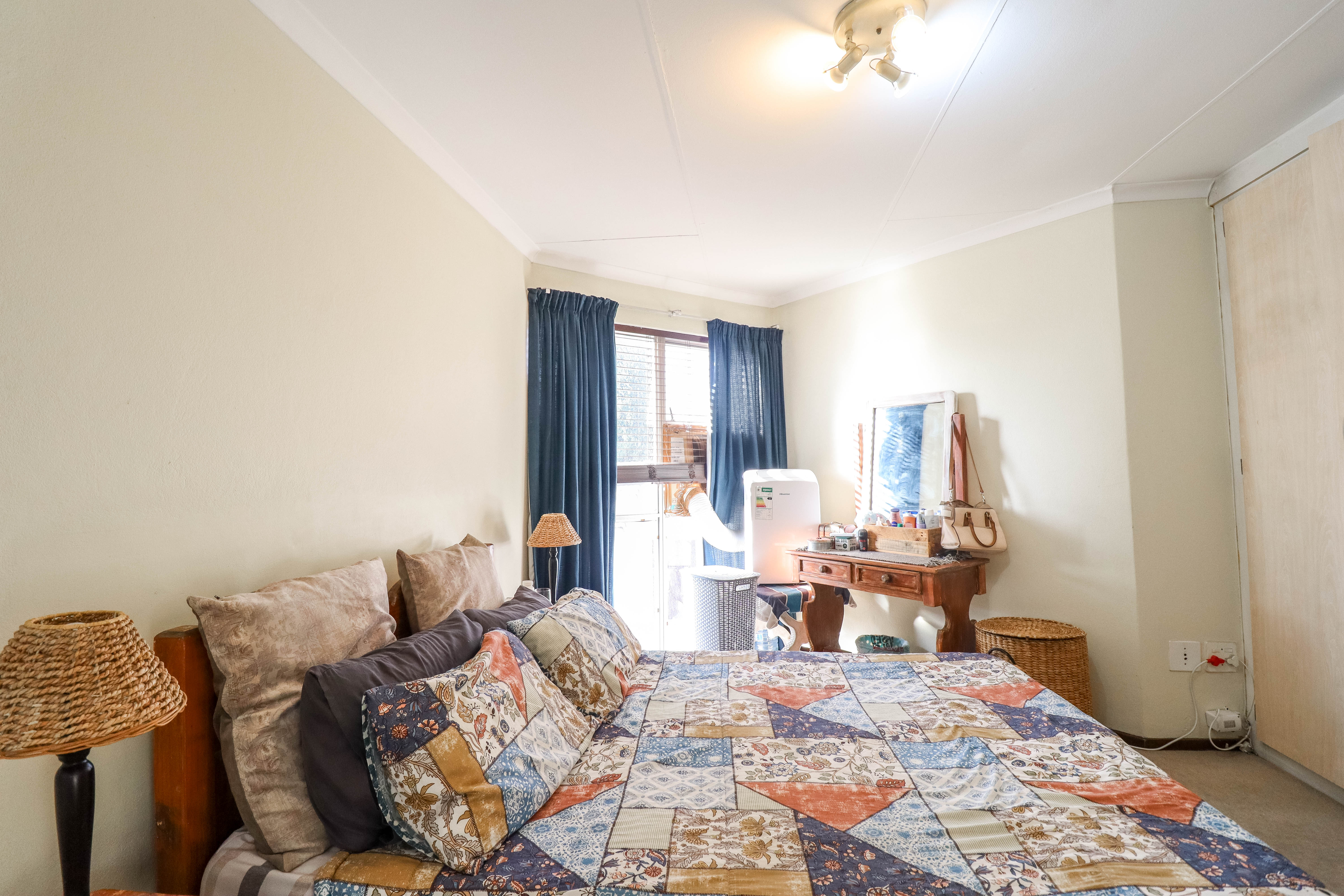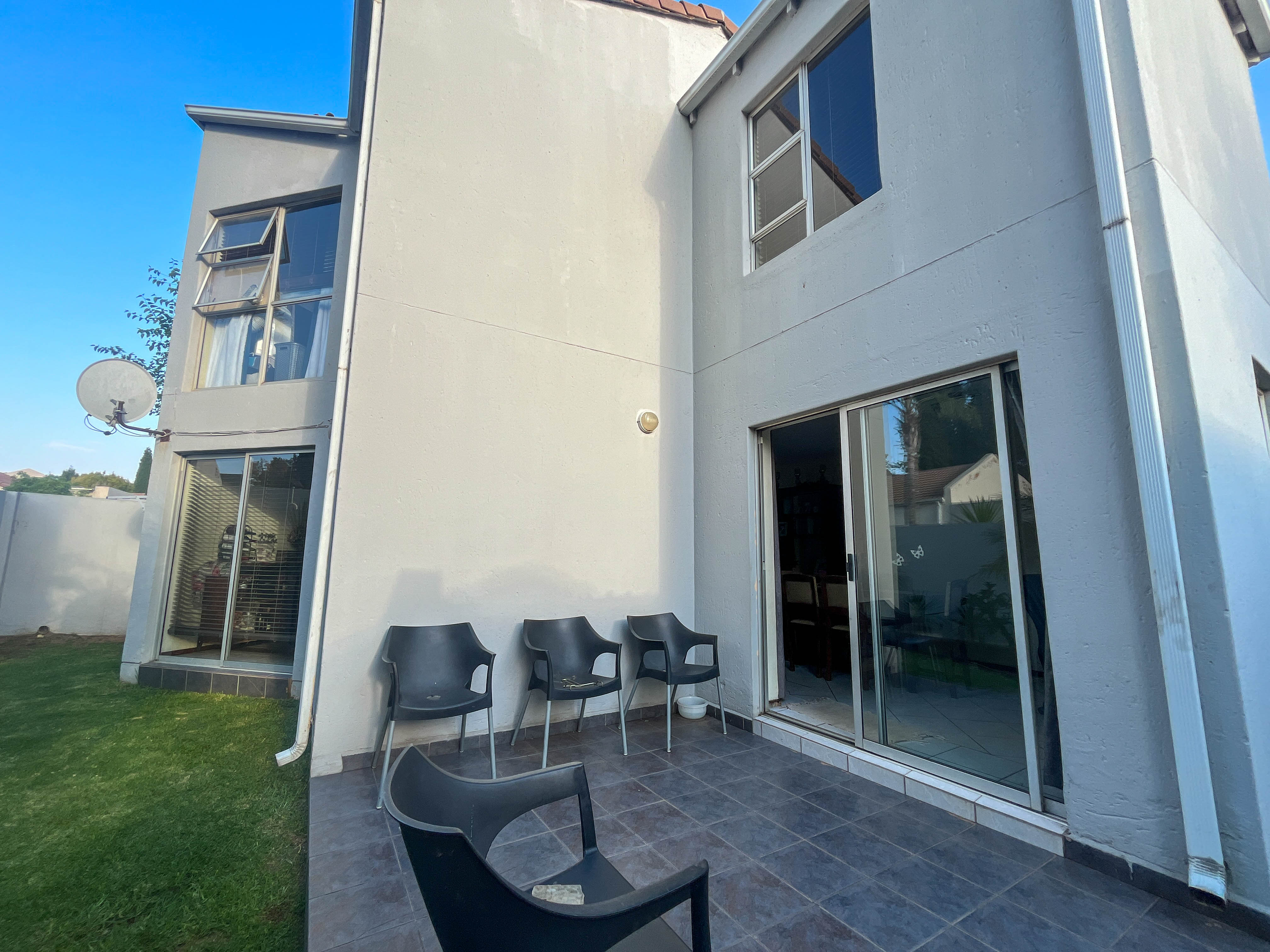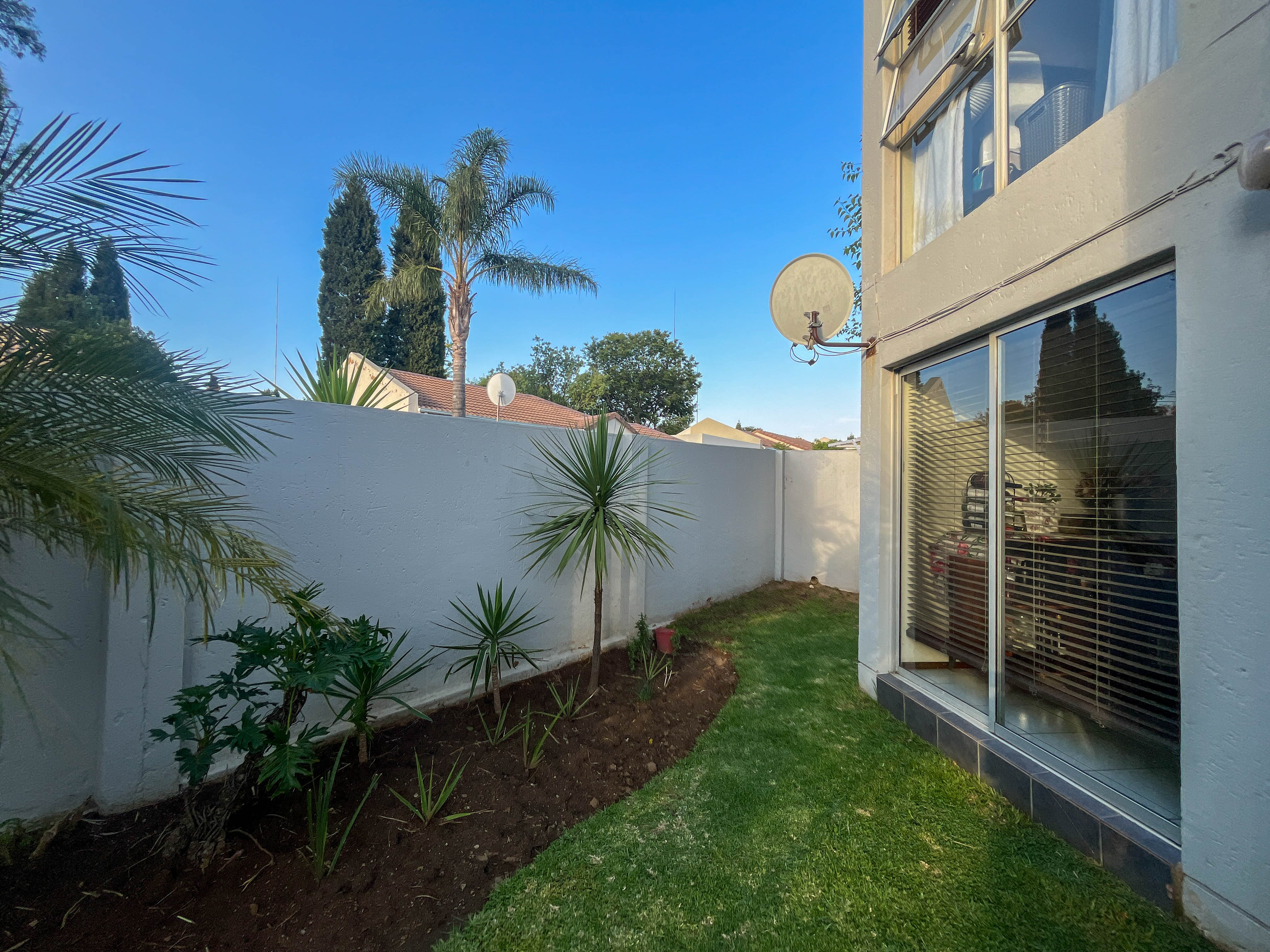 Beautiful two bedroomed cluster in a secure complex . Open plan tiled living and dining area, with sliders leading out to a private garden and open patio. Granite kitchen with built-in pantry cupboard and breakfast bar .Two bedrooms with ample built-in cupboards and two bathrooms (mes ) with oval tub and shower.