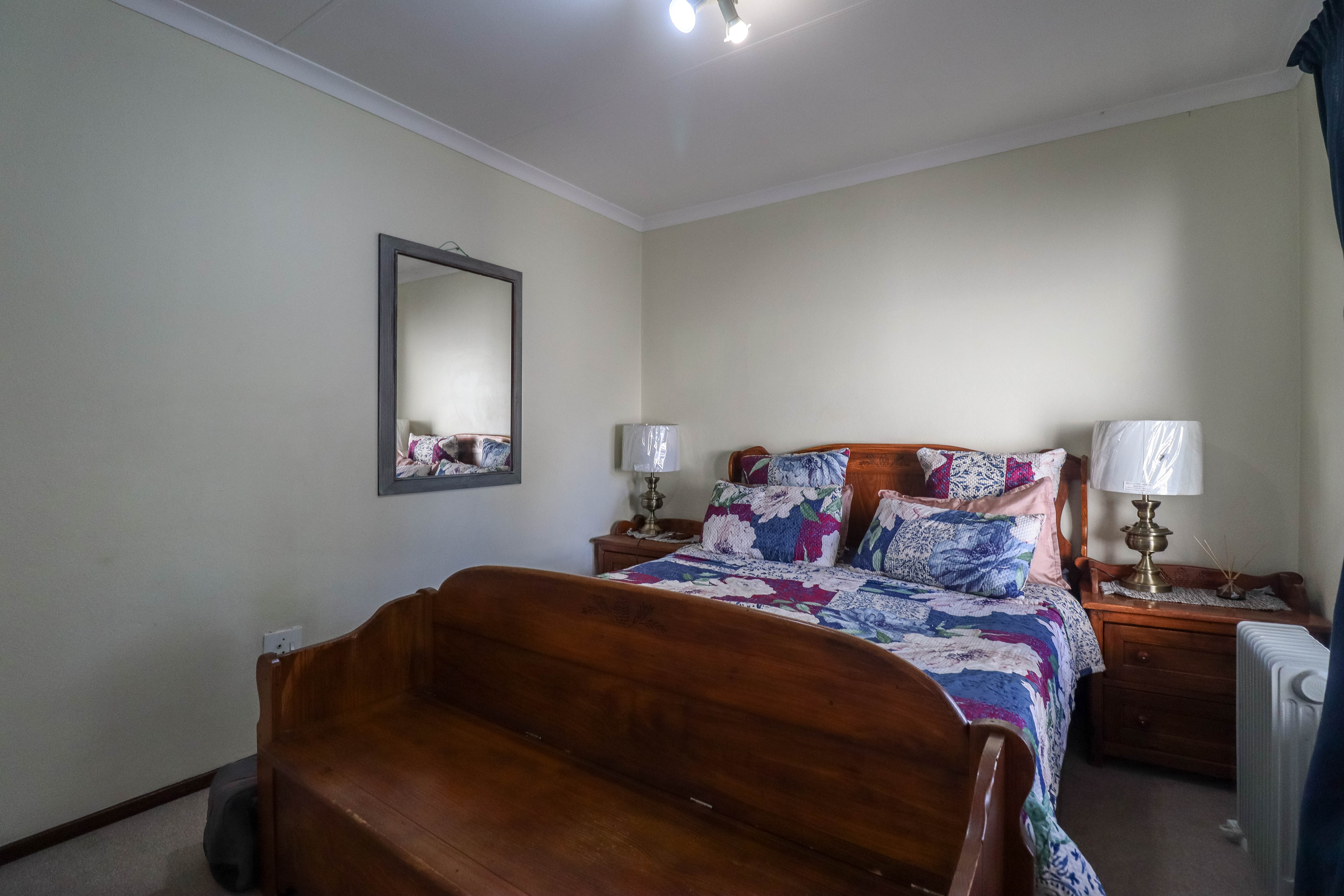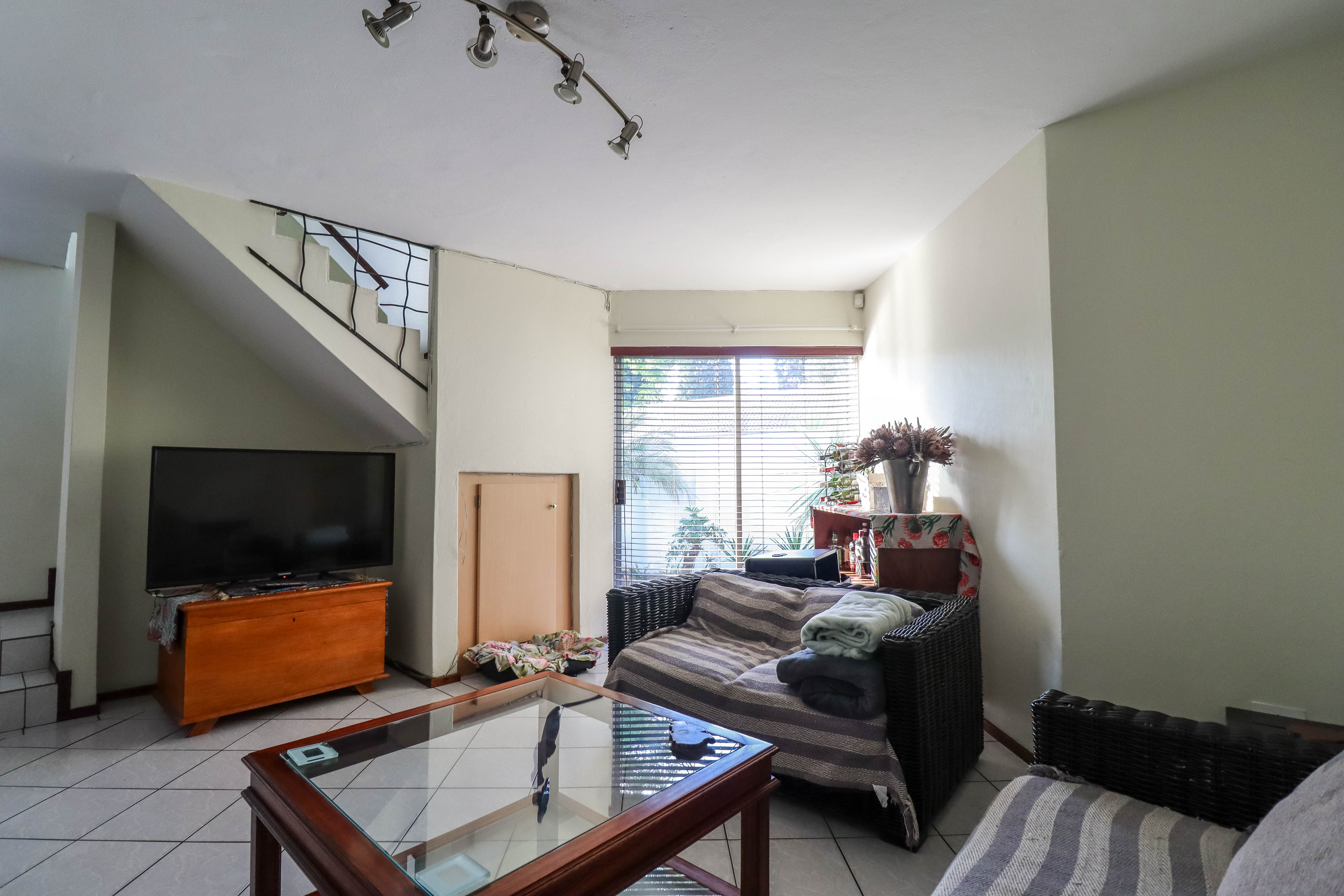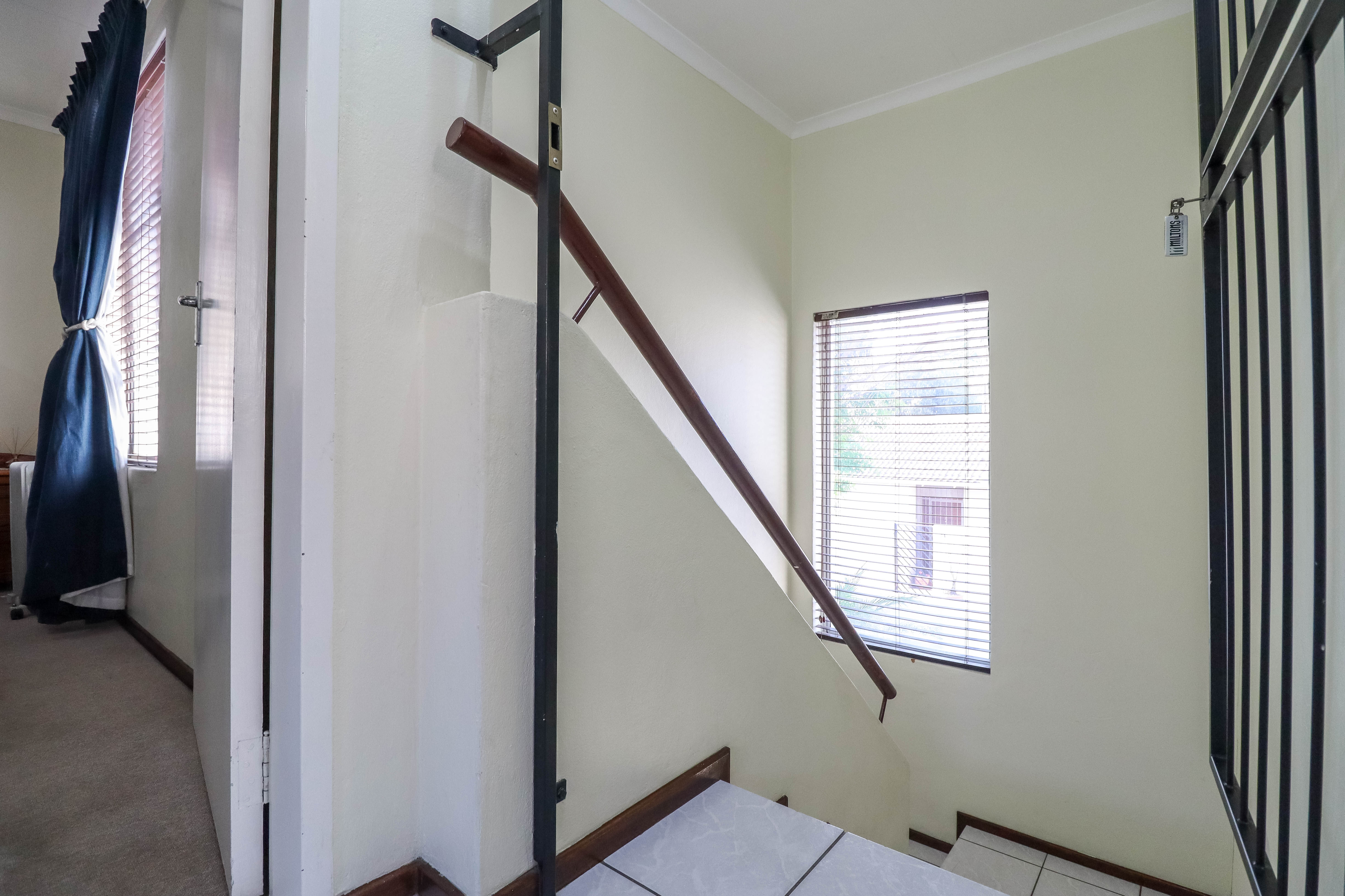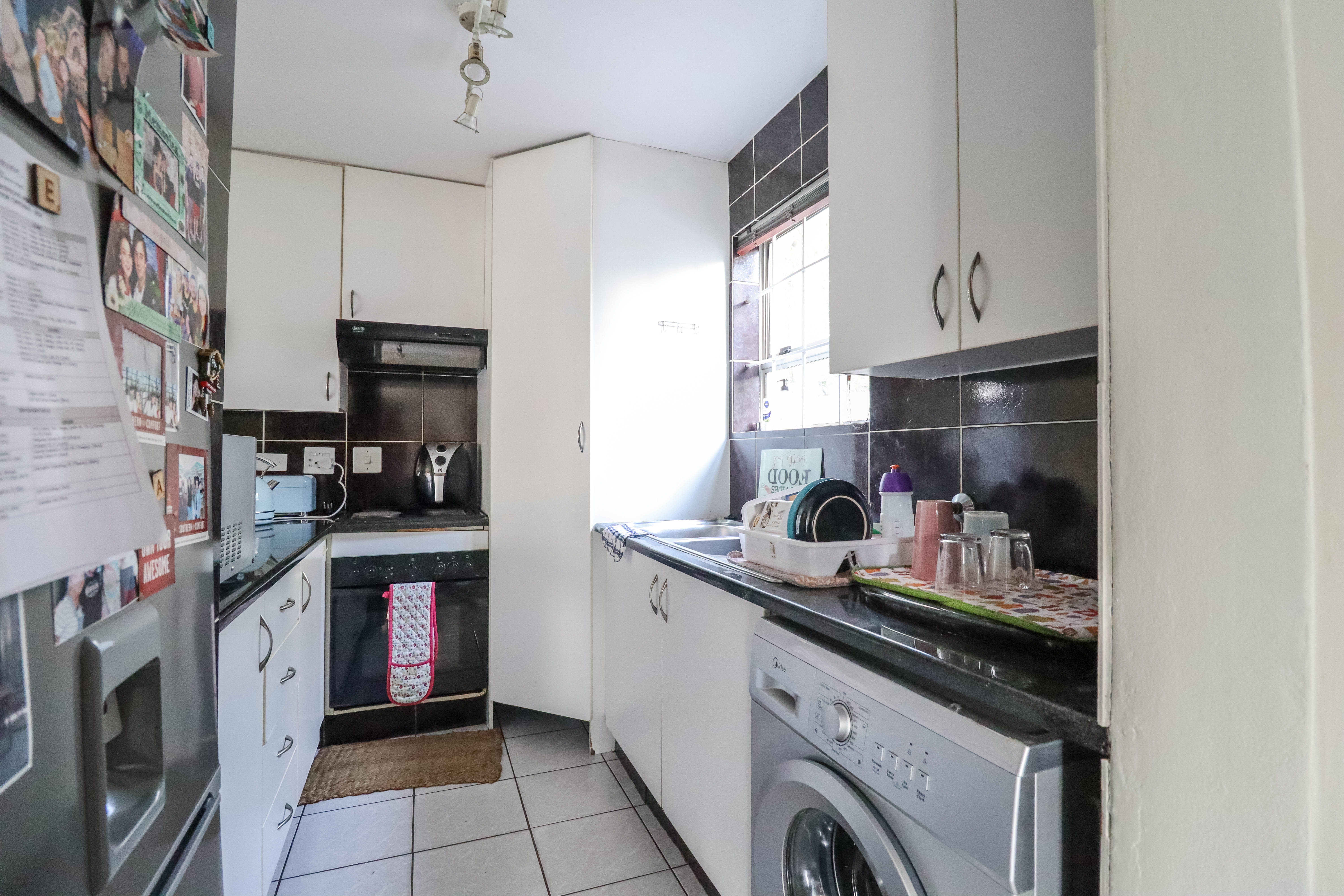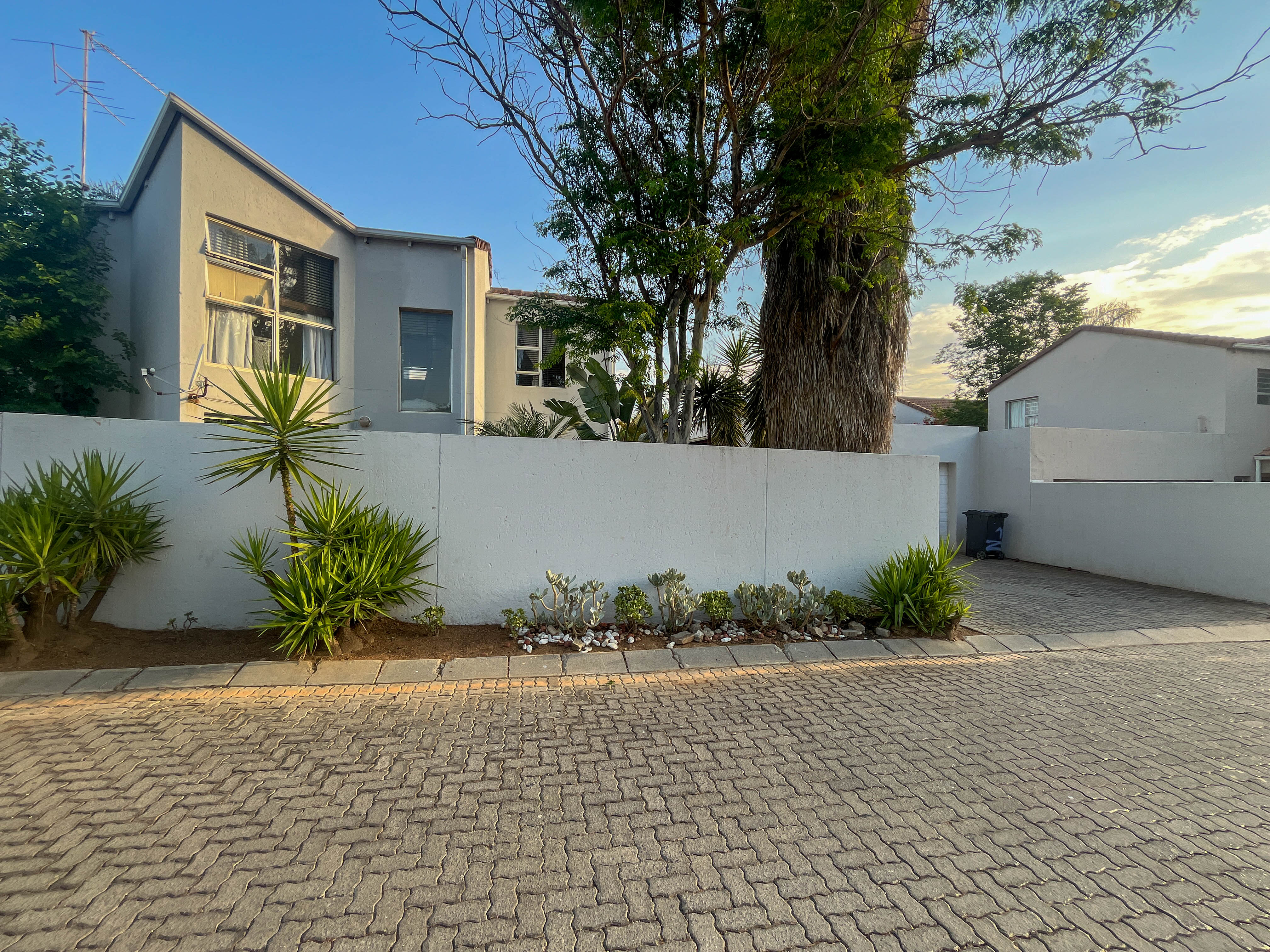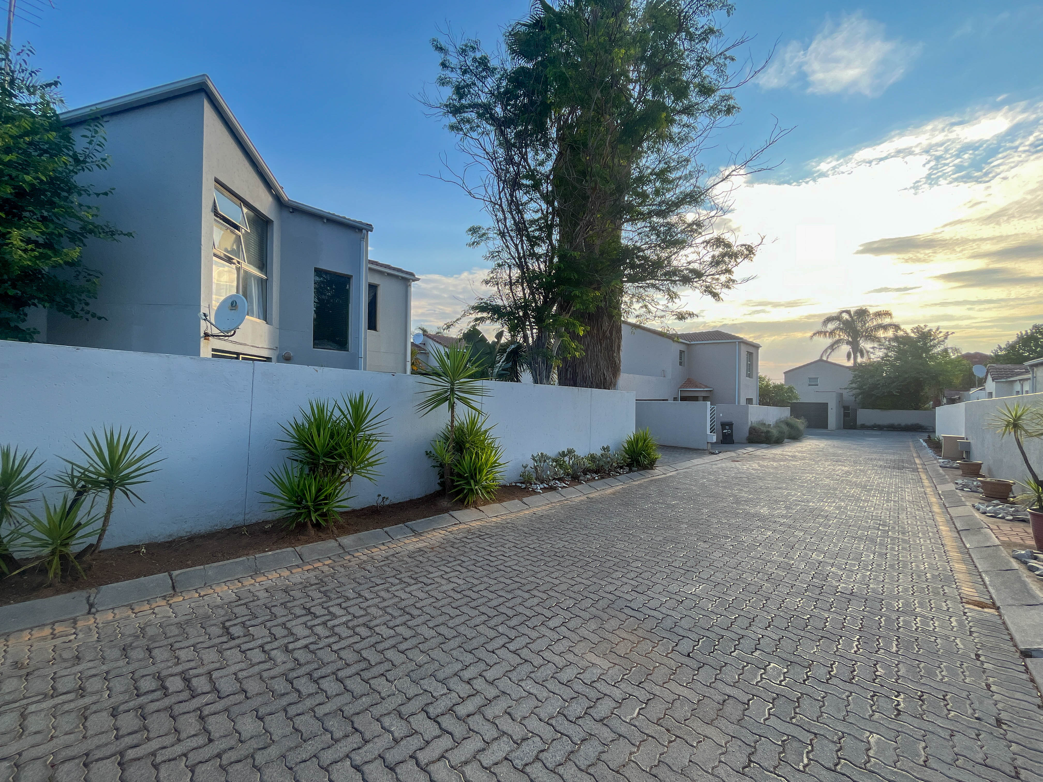 Beautiful two bedroomed cluster in a secure complex . Open plan tiled living and dining area, with sliders leading out to a private garden and open patio. Granite kitchen with built-in pantry cupboard and breakfast bar .Two bedrooms with ample built-in cupboards and two bathrooms (mes ) with oval tub and shower.