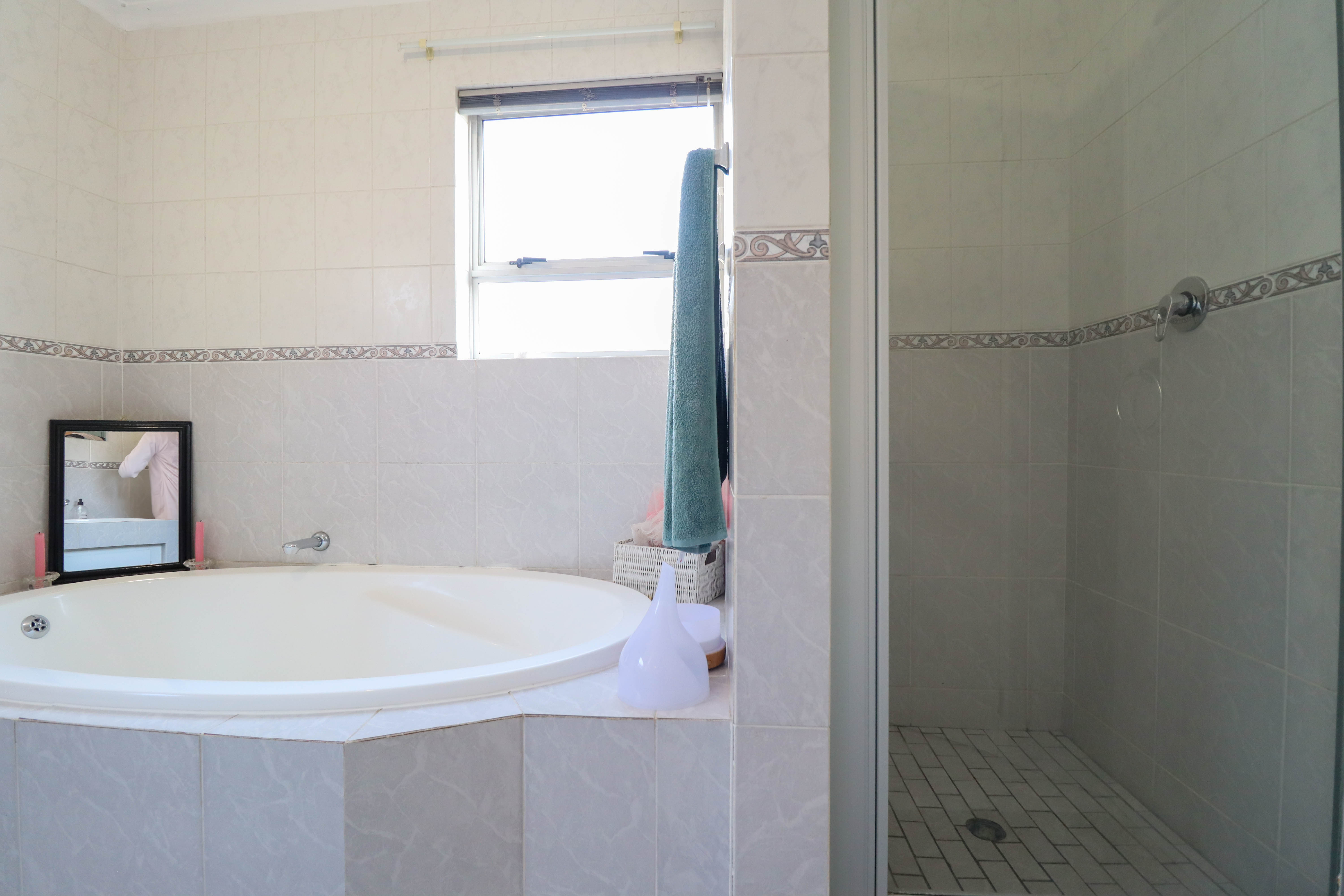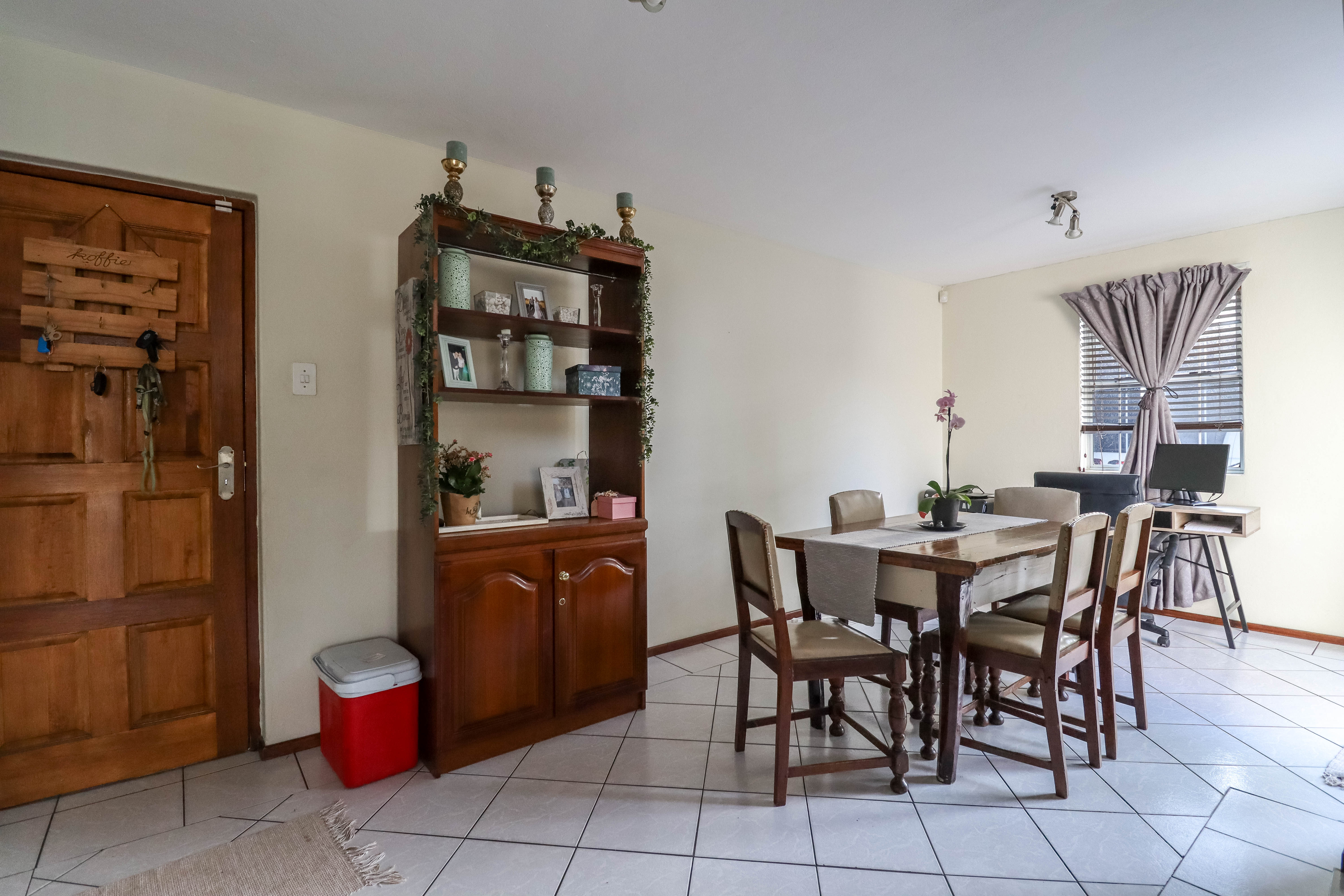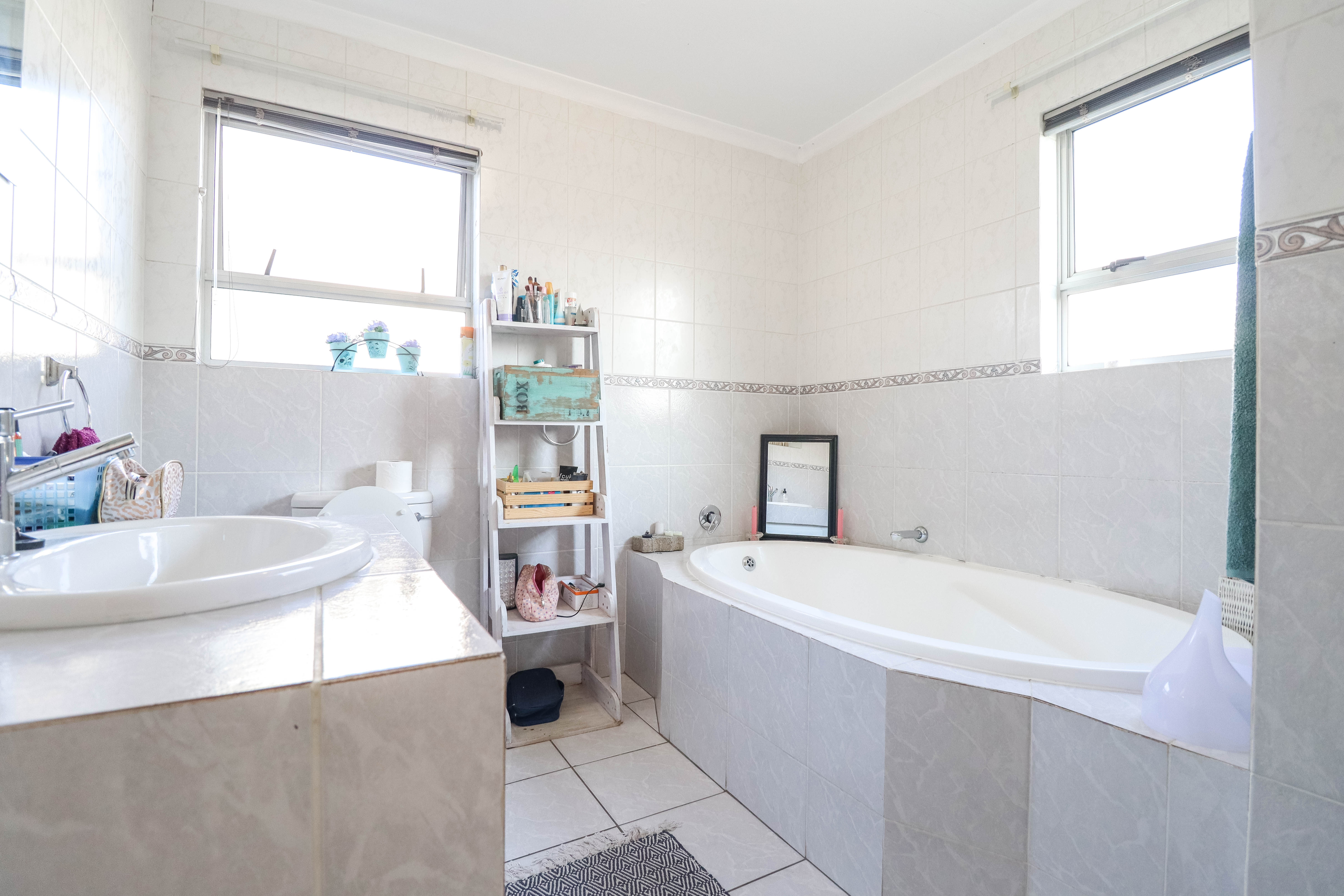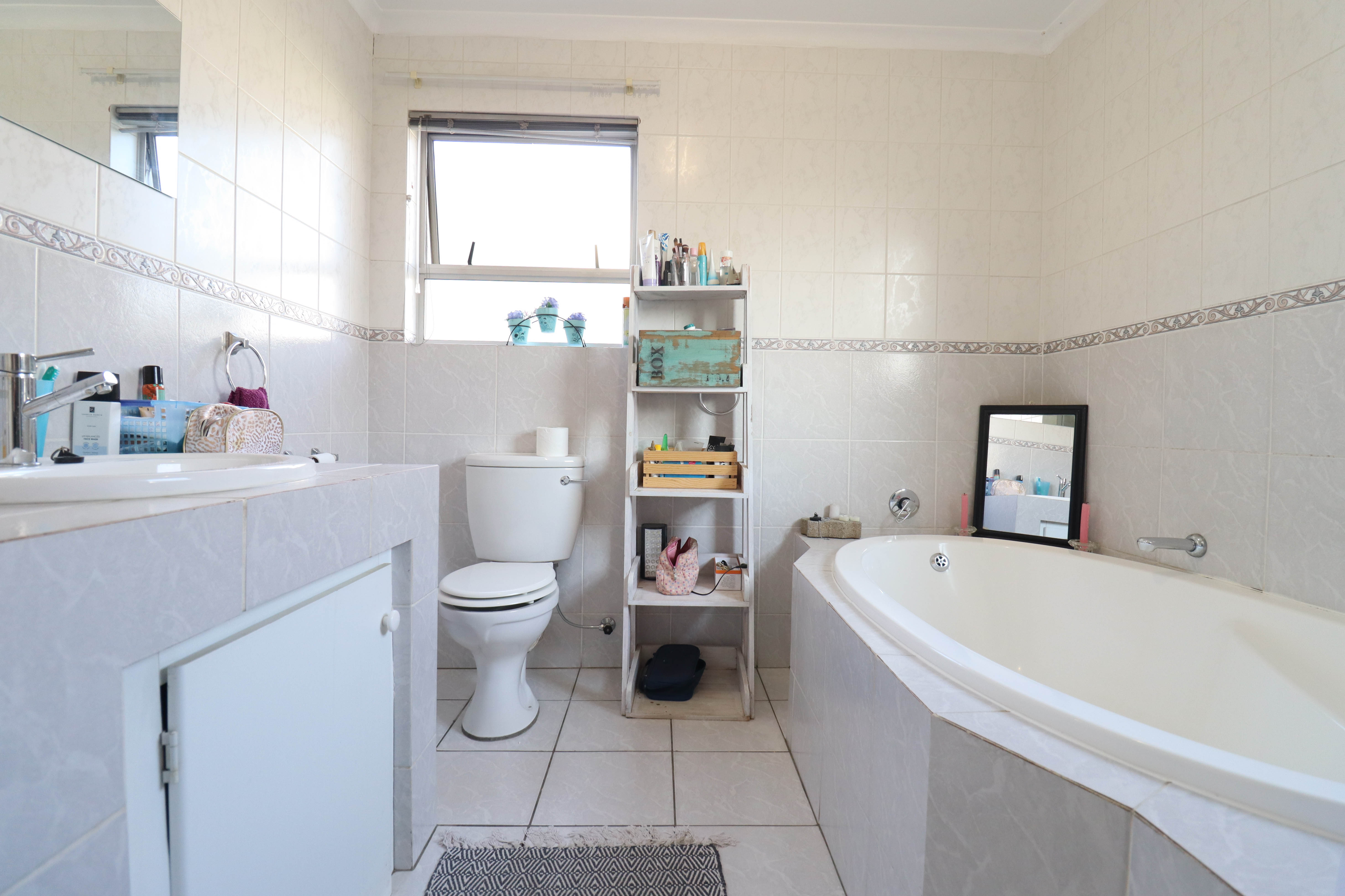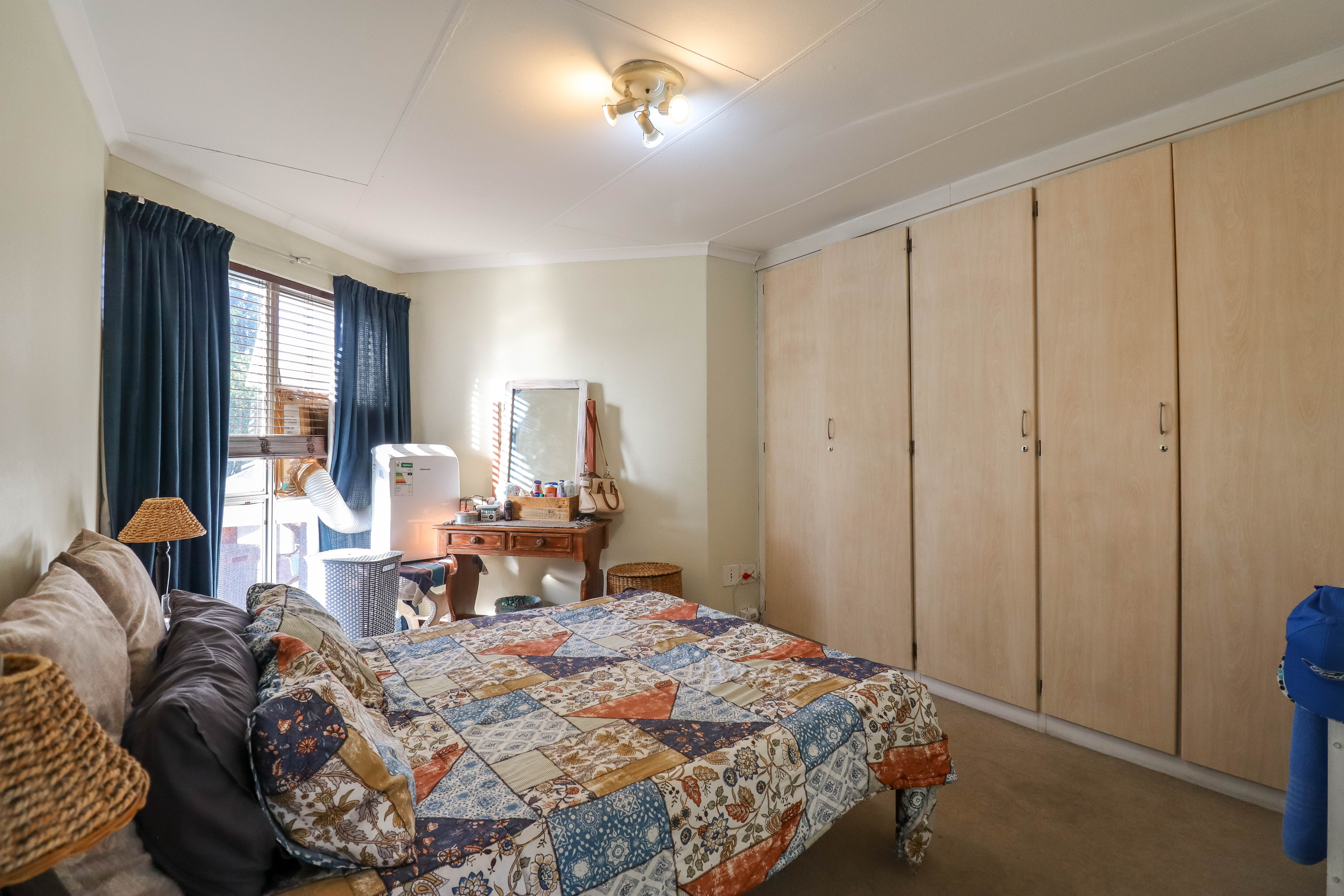 Beautiful two bedroomed cluster in a secure complex . Open plan tiled living and dining area, with sliders leading out to a private garden and open patio. Granite kitchen with built-in pantry cupboard and breakfast bar .Two bedrooms with ample built-in cupboards and two bathrooms (mes ) with oval tub and shower.