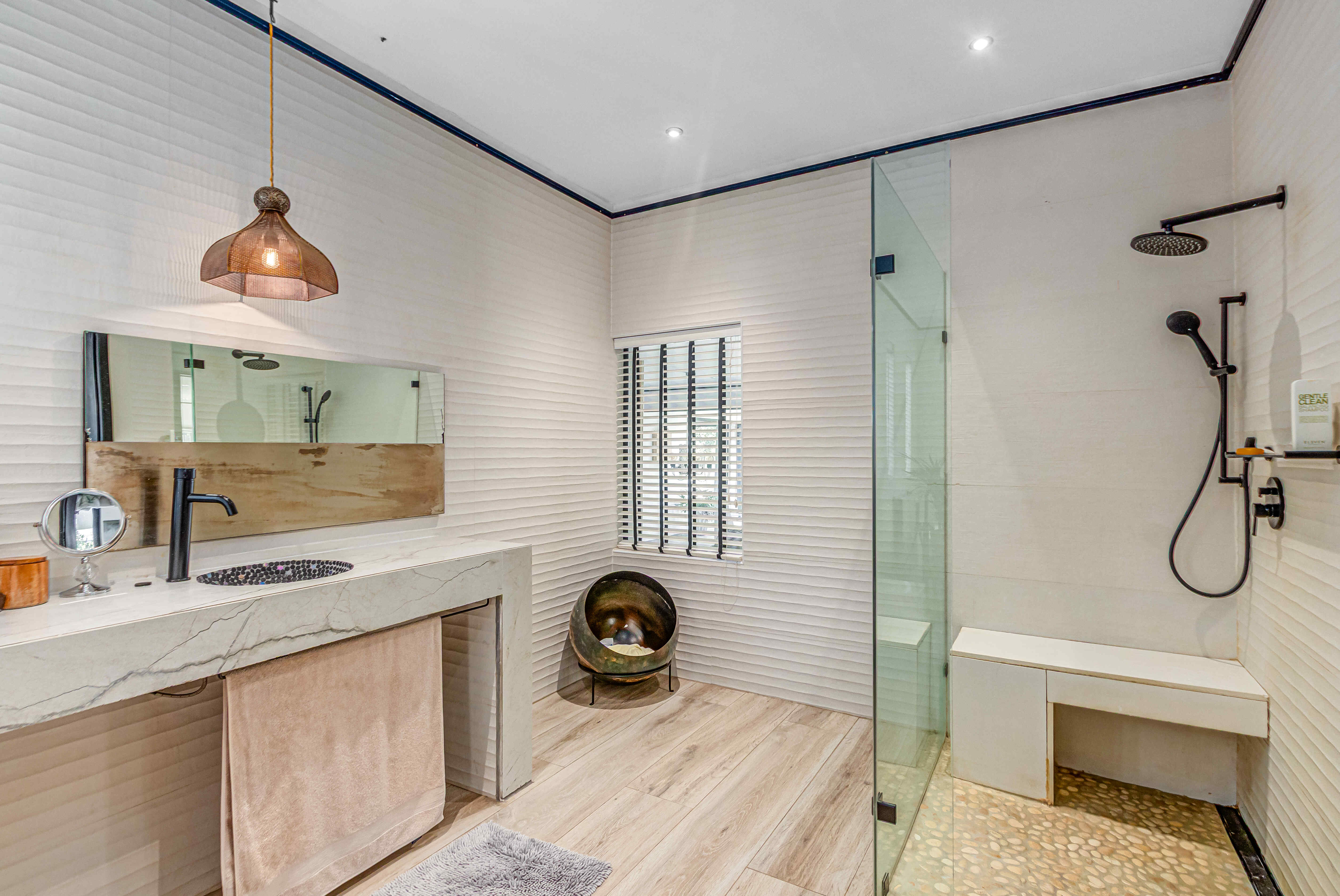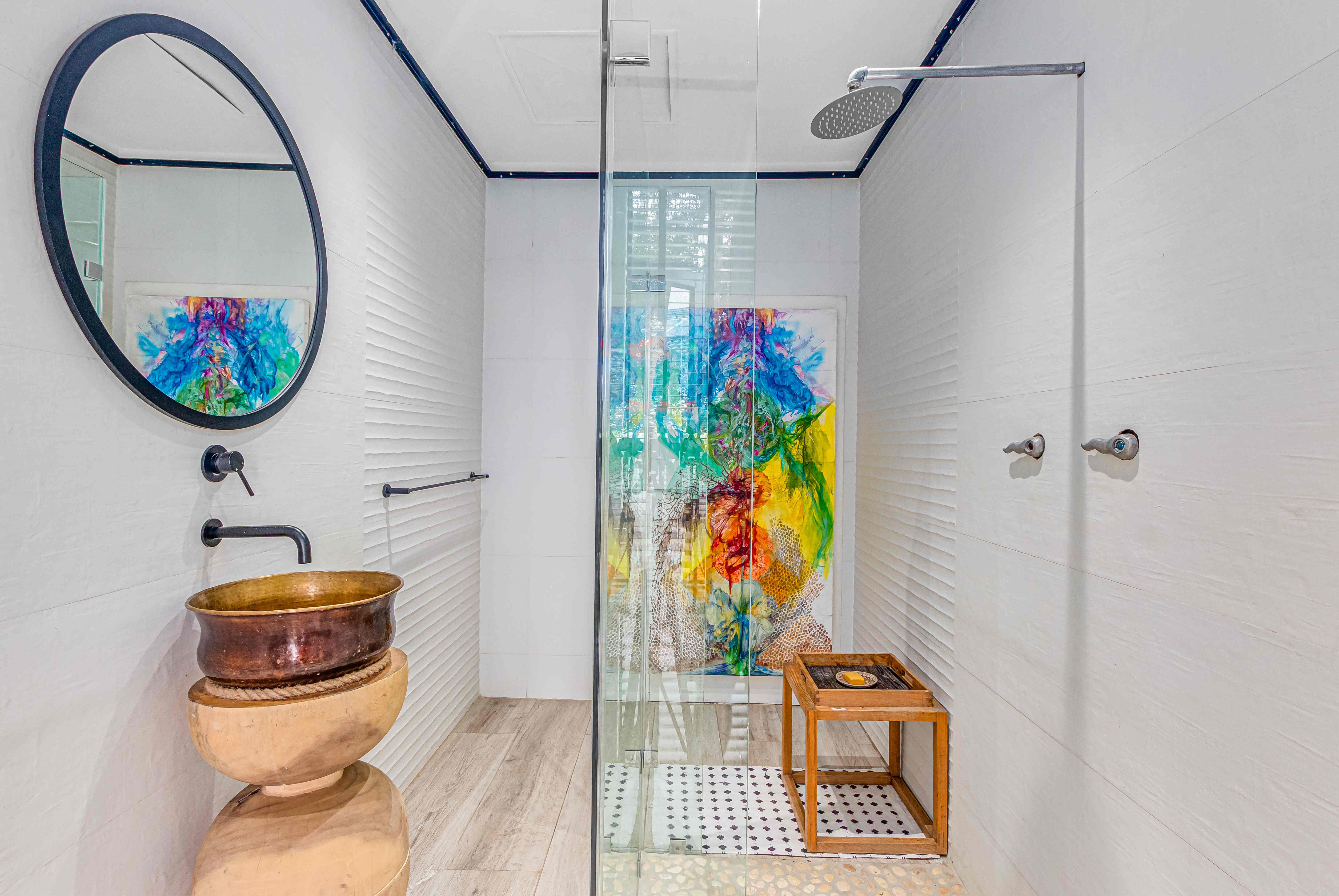 Currently configured as two expansive bedrooms, the layout can easily be reimagined to restore the original four-bedroom design. These rooms open directly onto the stunning infinity pool, seamlessly blending indoor comfort with outdoor tranquility