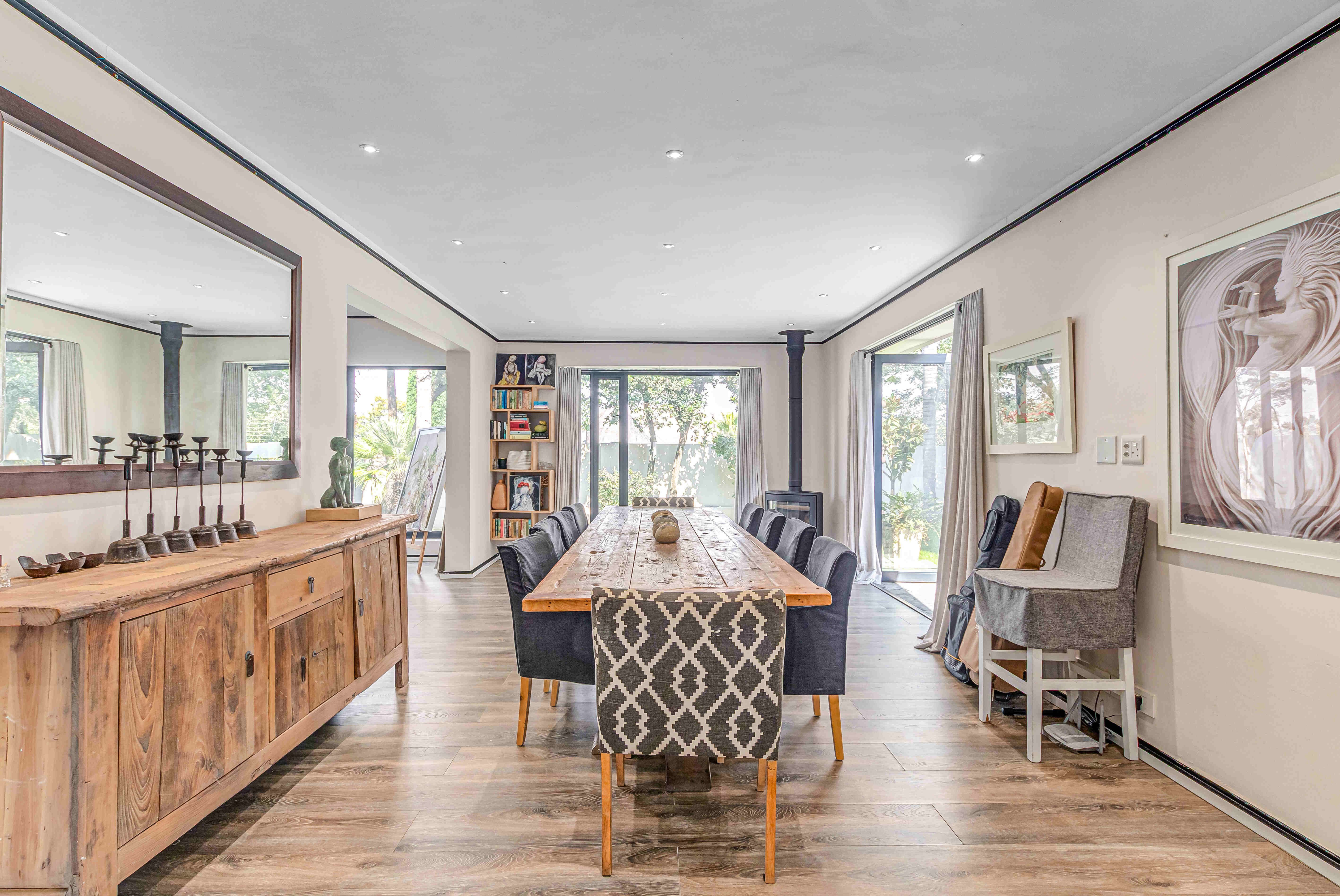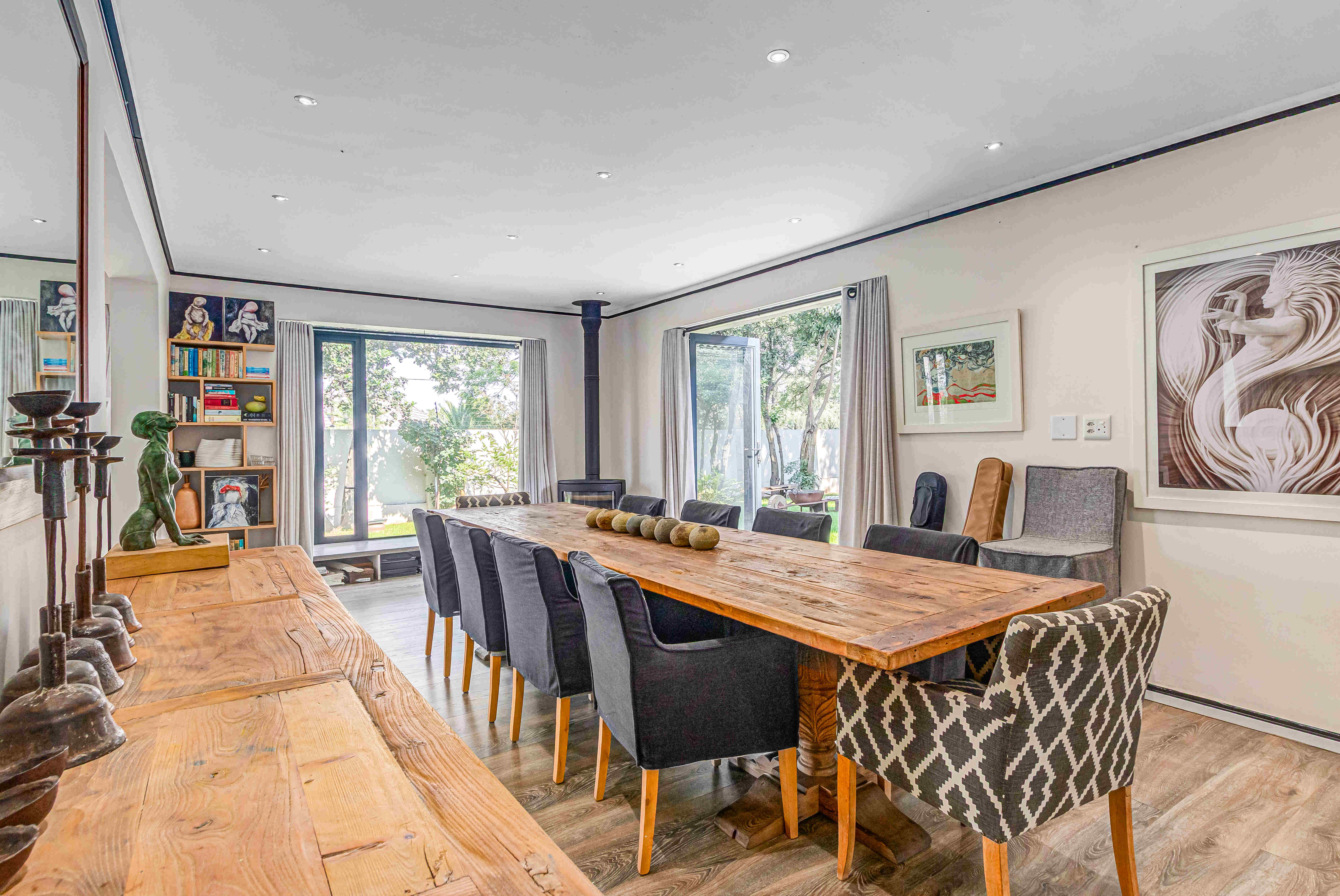 Dining Room: Bathed in natural light from an expansive bay window and complemented by a charming wood-burning fireplace, this space offers an inviting ambiance perfect for intimate dinners and lively gatherings alike.