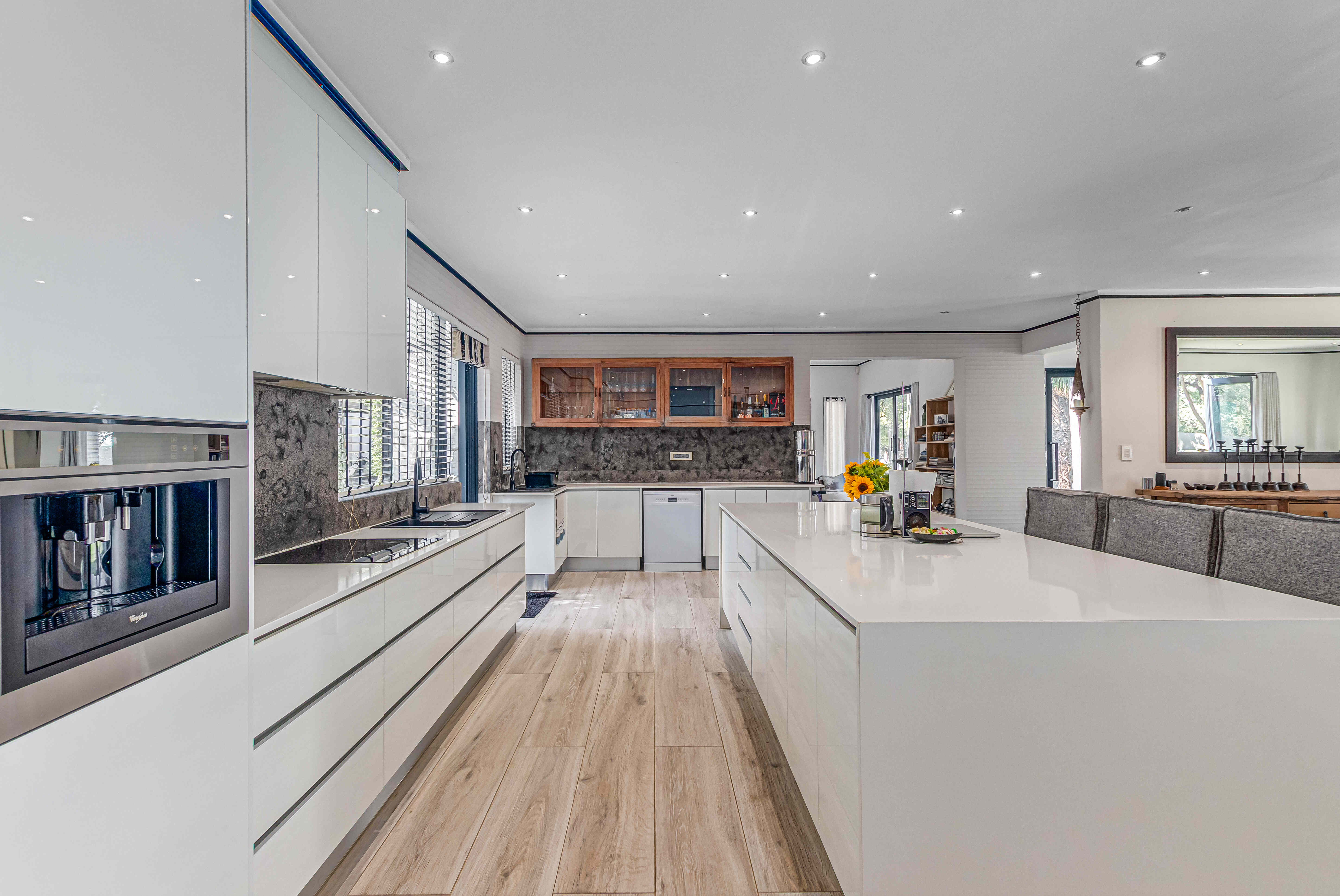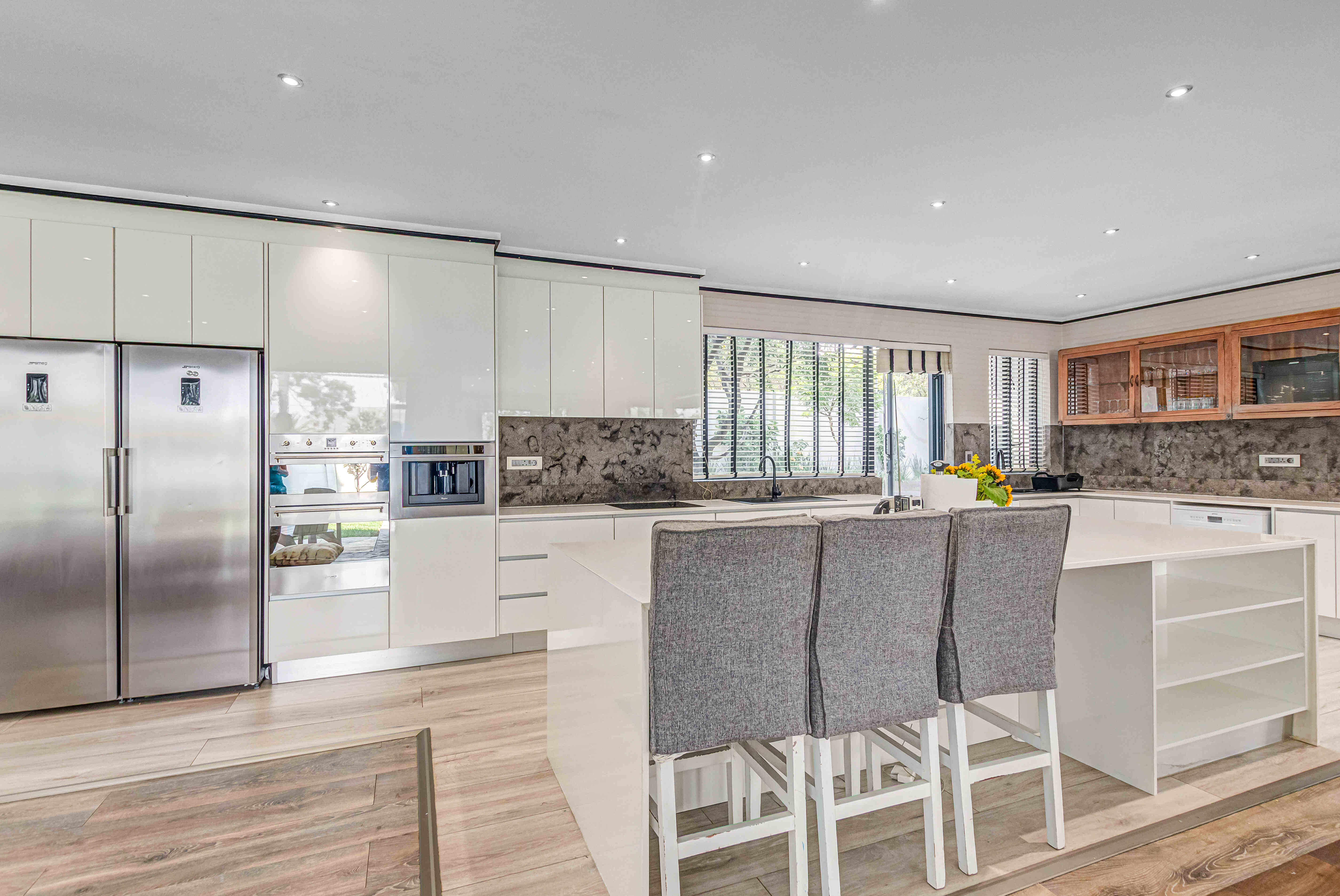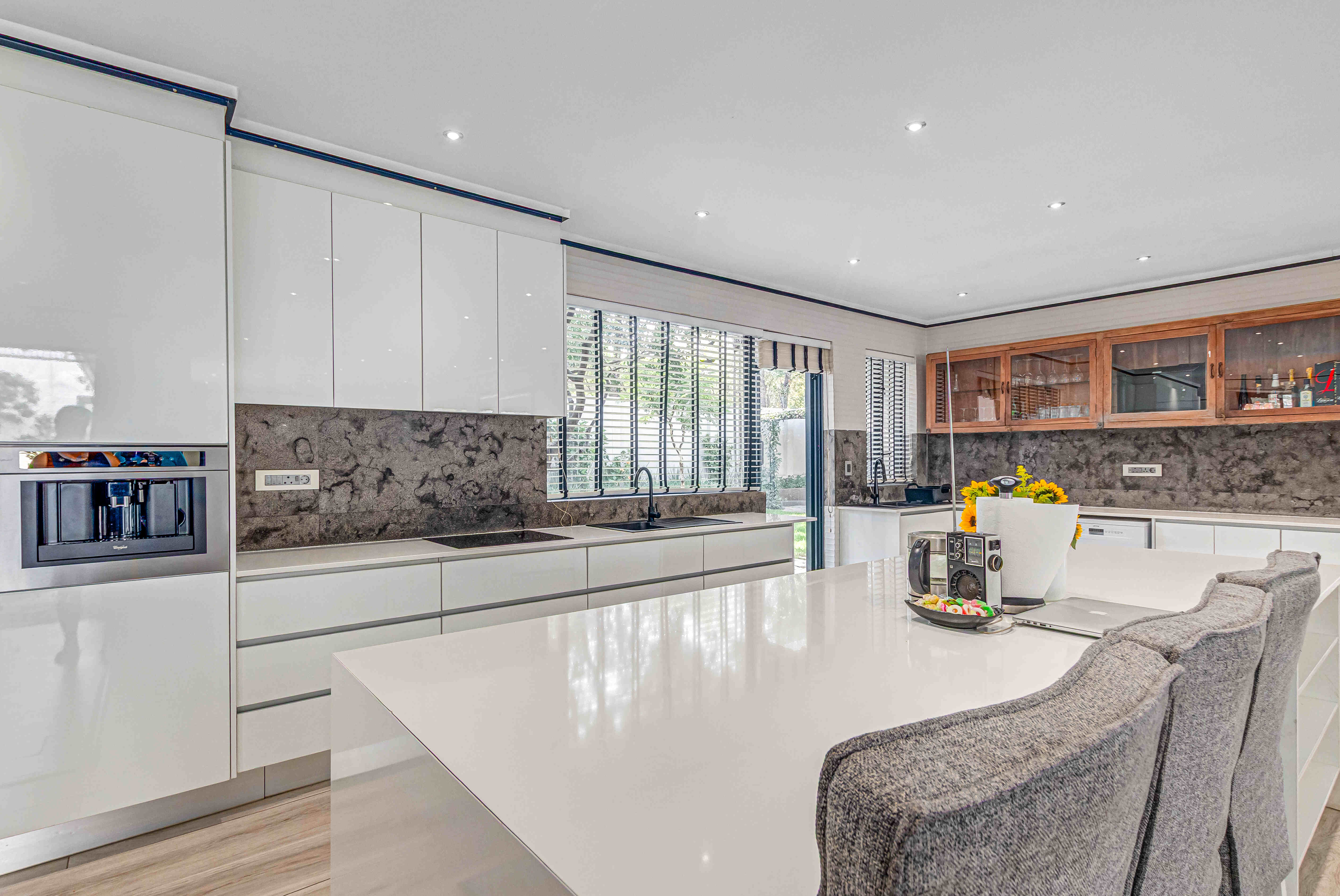 Gourmet Kitchen: A chef’s dream featuring a built-in coffee machine, SMEG electric stove, soft-touch cabinetry, abundant storage, and space for a double fridge. The adjacent lounge area invites guests to relax and engage with the host during meal preparations