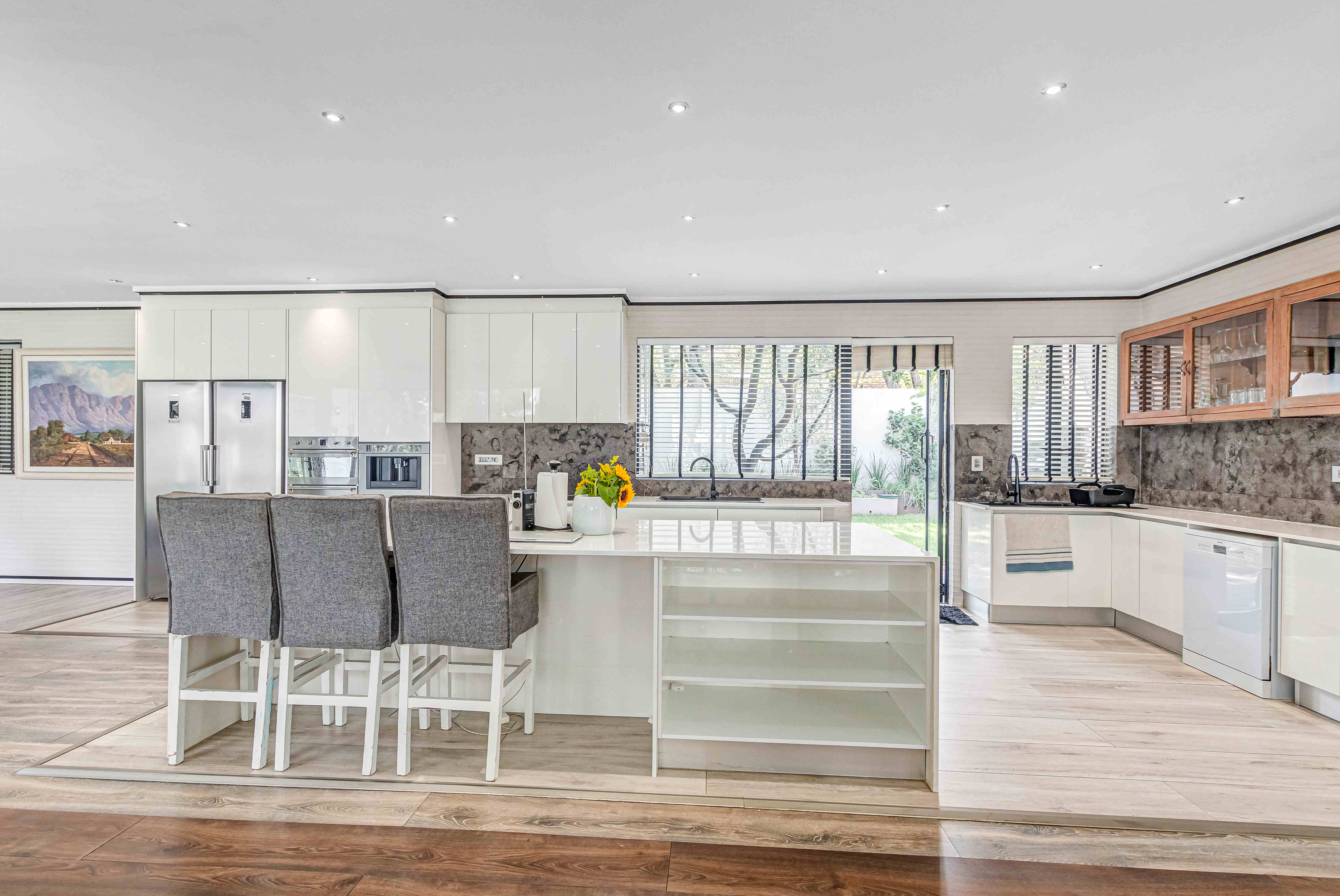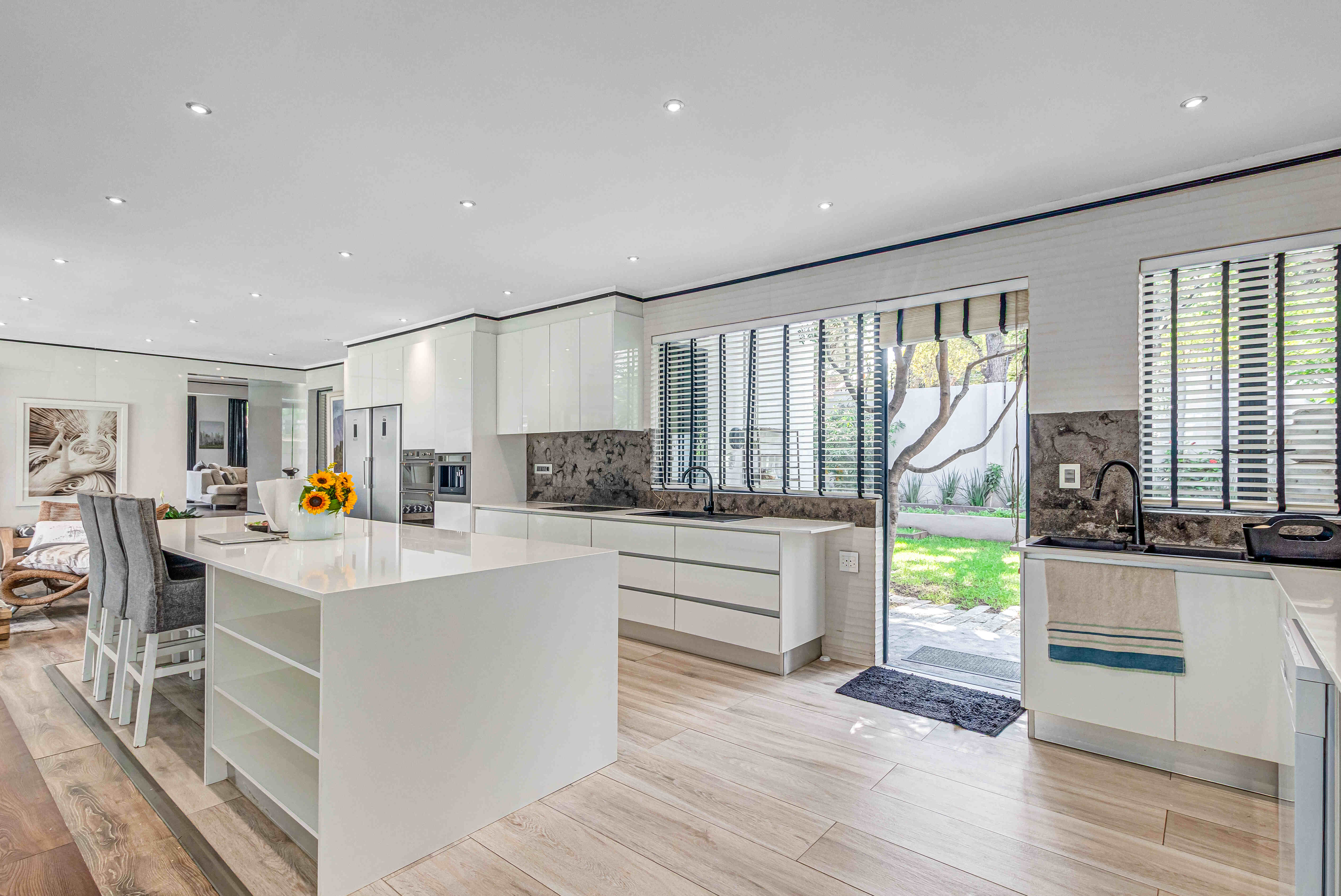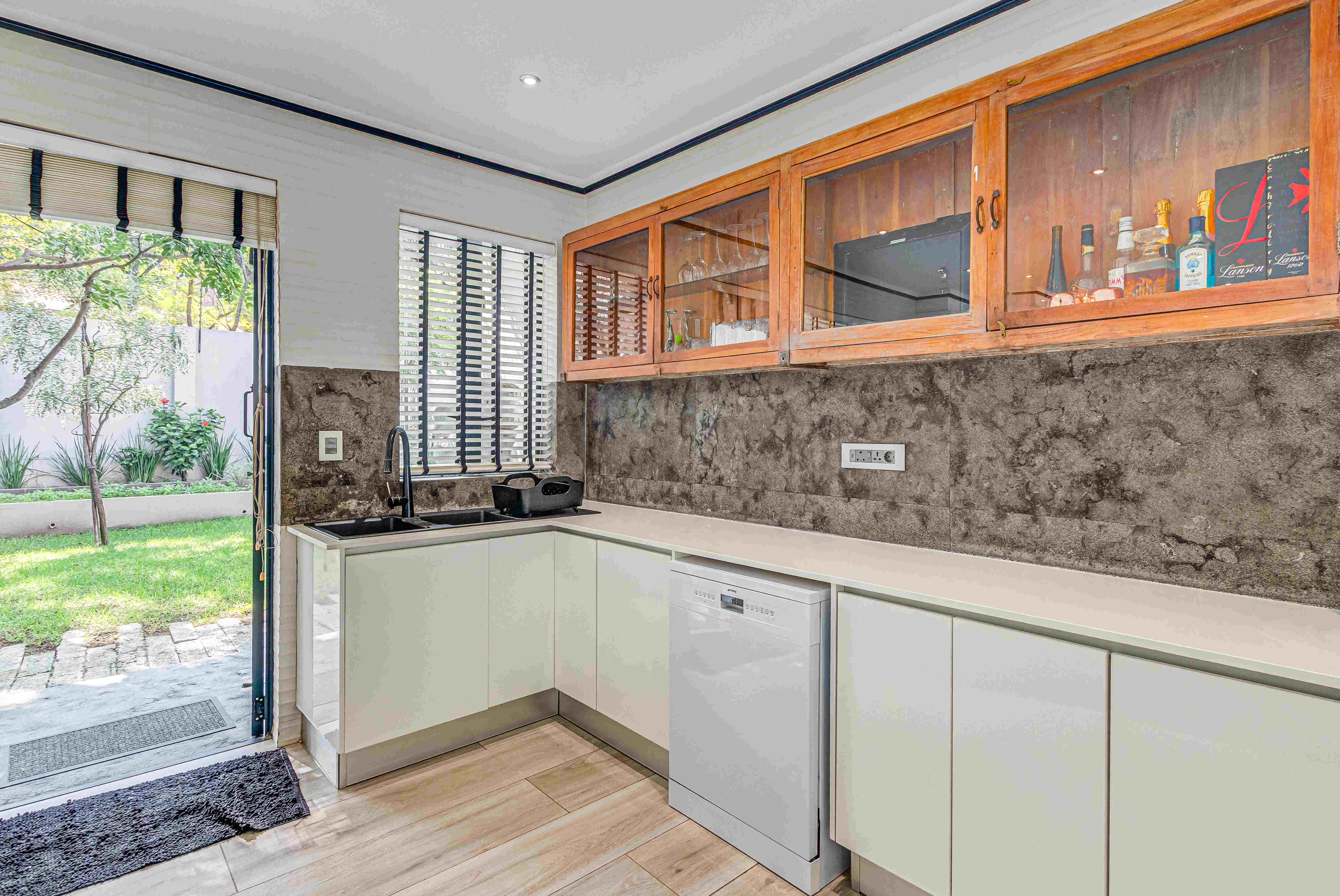 Gourmet Kitchen: A chef’s dream featuring a built-in coffee machine, SMEG electric stove, soft-touch cabinetry, abundant storage, and space for a double fridge. The adjacent lounge area invites guests to relax and engage with the host during meal preparations