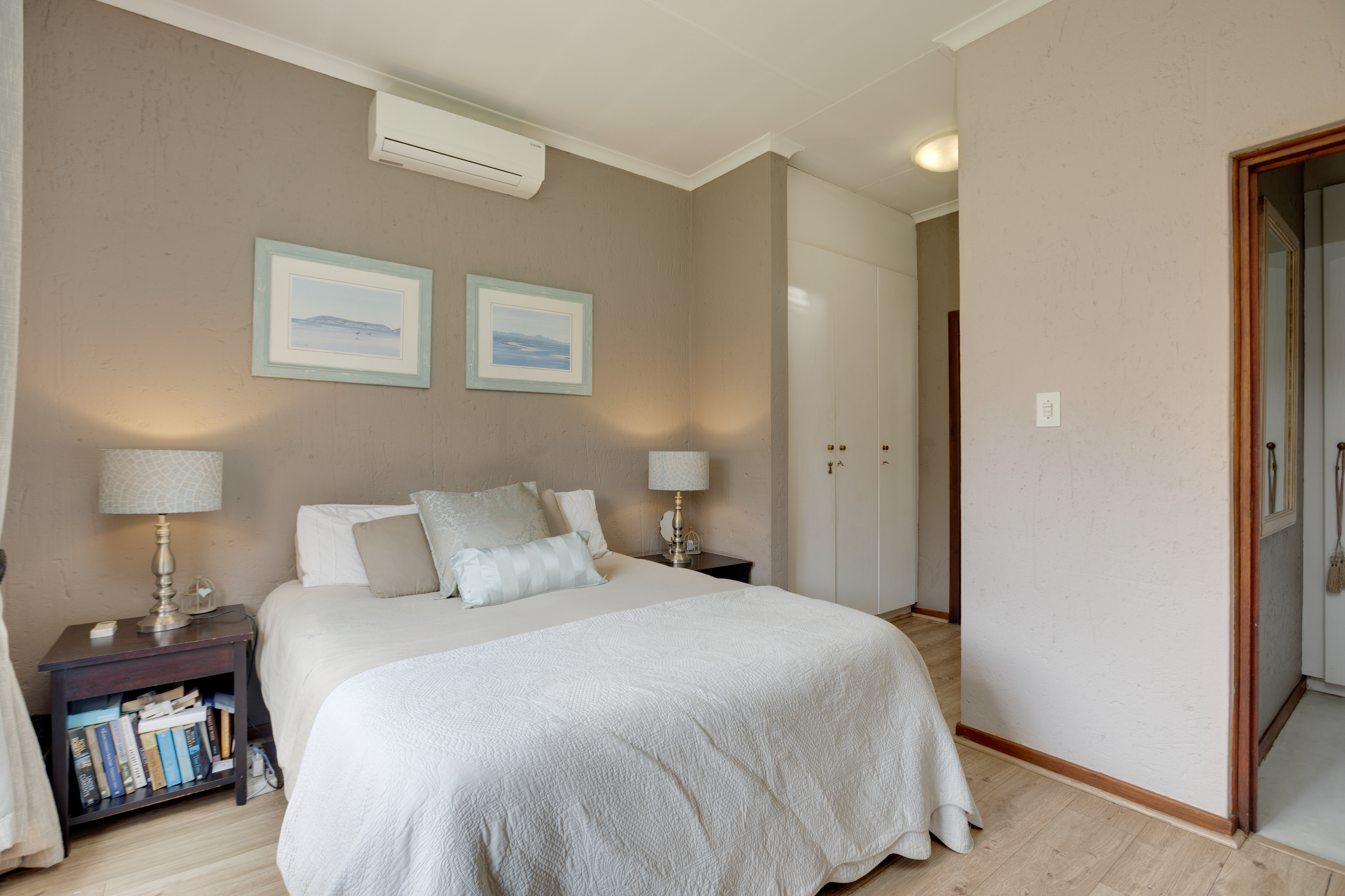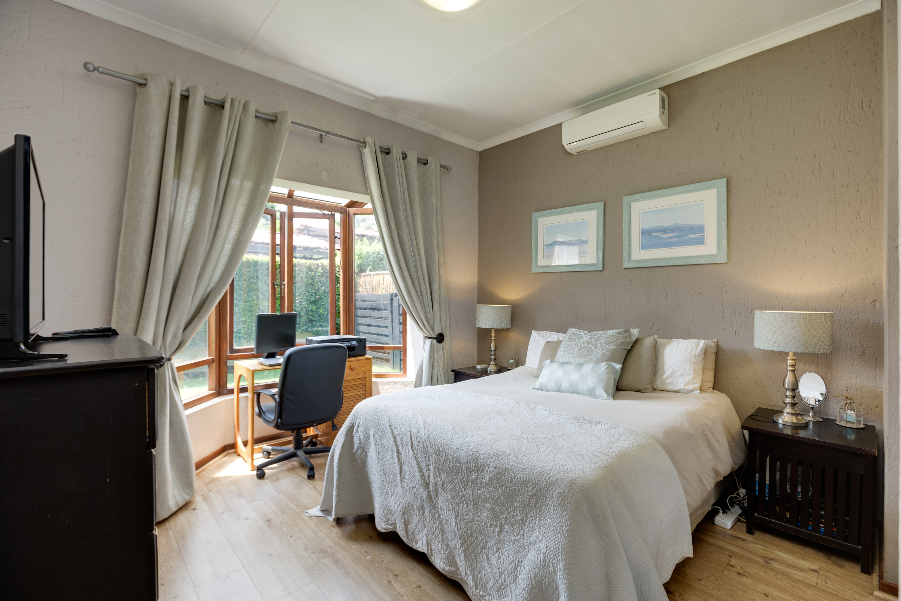The main bedroom offers laminated flooring, built-in wardrobes, air conditioning, and a luxurious full en-suite bathroom complete with his and hers basins and stylish window blinds.