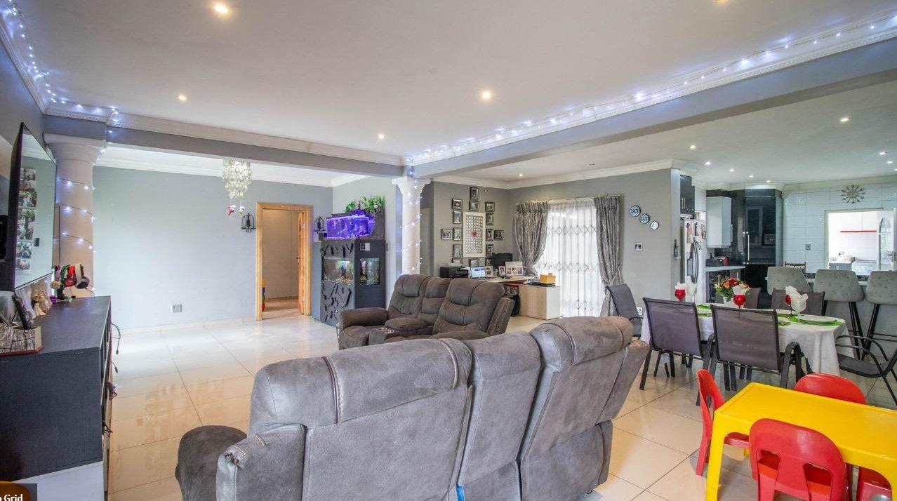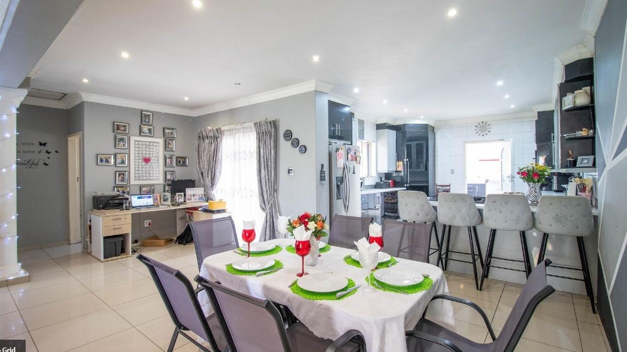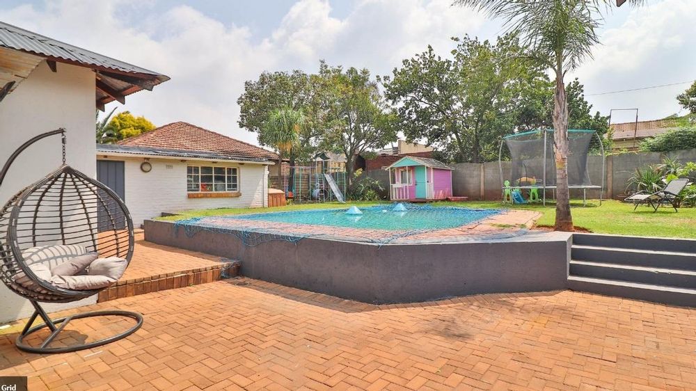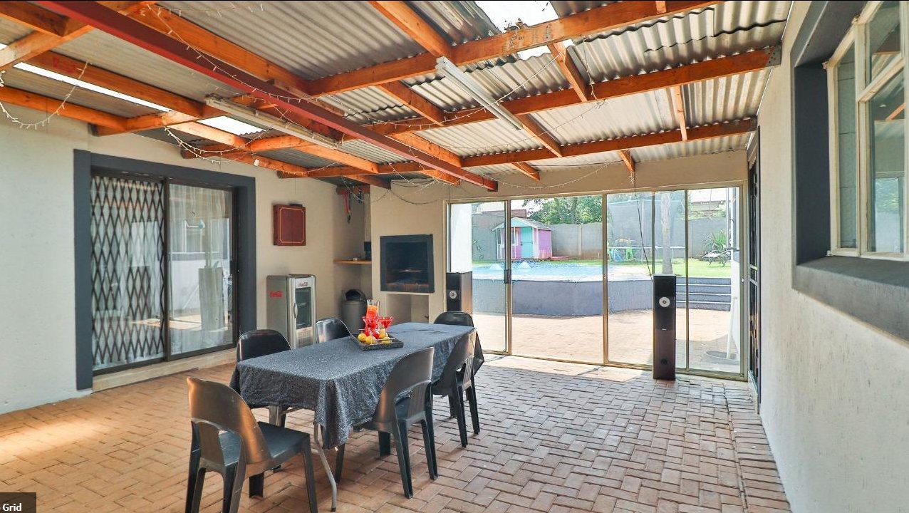 The backyard features a covered entertainment area with a built-in Braai, perfect for indoor gatherings. Outdoors, you'll find a spacious garden with a large swimming pool, offering plenty of room for children to explore. The property includes a double tandem garage and a double carport plus additional open parking space.