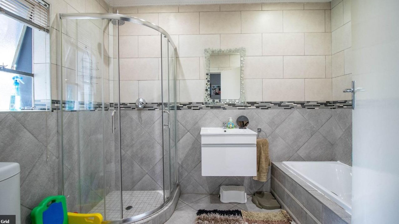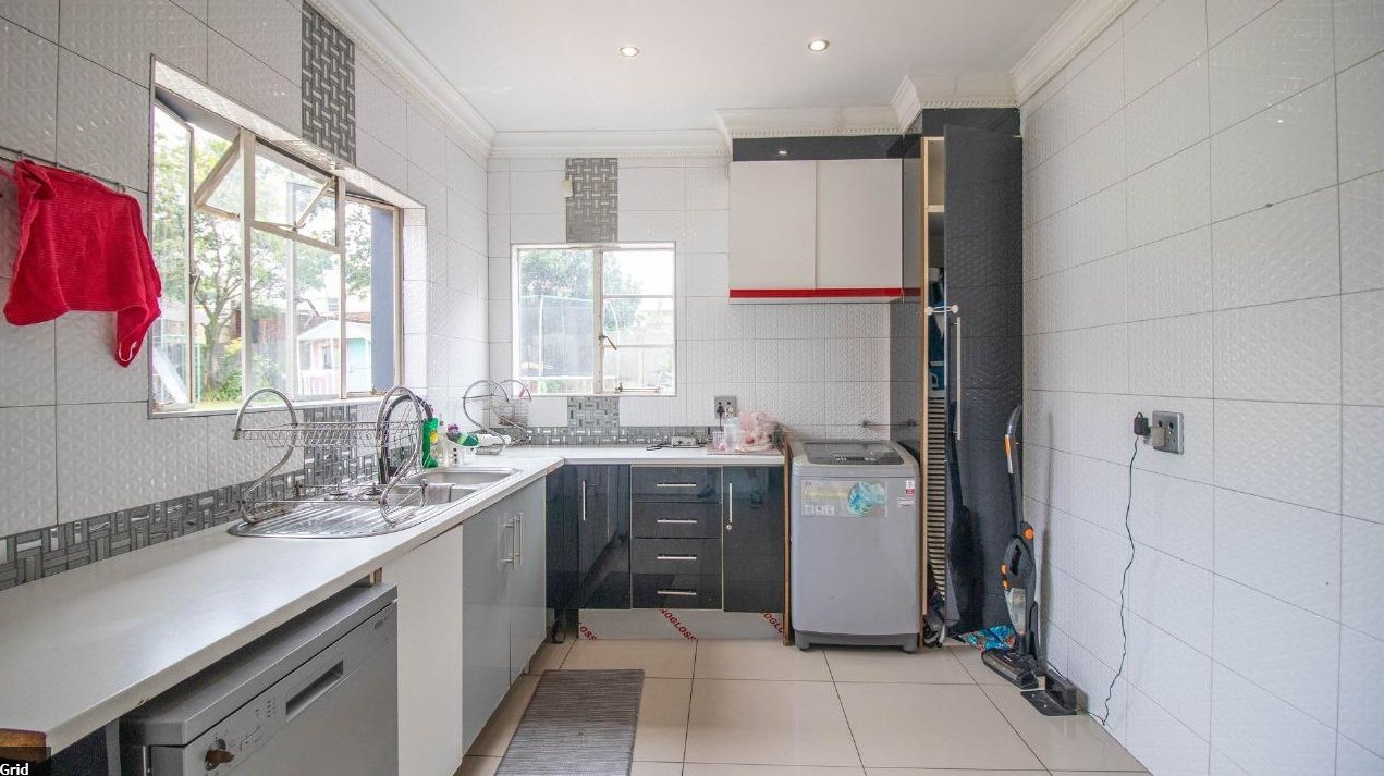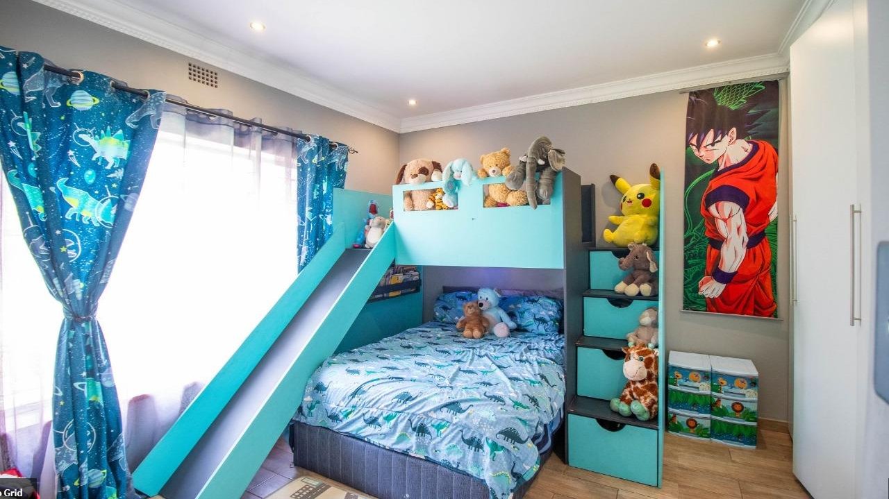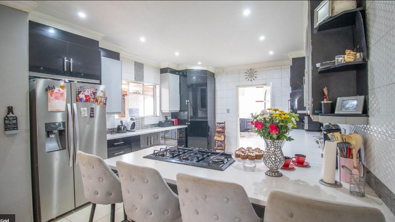 The backyard features a covered entertainment area with a built-in Braai, perfect for indoor gatherings. Outdoors, you'll find a spacious garden with a large swimming pool, offering plenty of room for children to explore. The property includes a double tandem garage and a double carport plus additional open parking space.