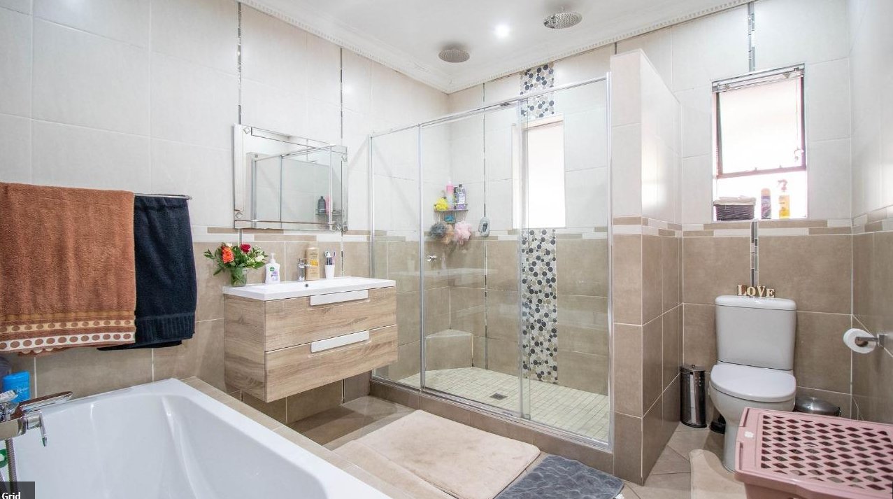 To the left of the reception area, you'll find a hallway with built-in cupboards offering plenty of additional storage space, along with access to the 3 bedrooms. Each bedroom is equipped with built-in cupboards, and there are 2 renovated bathrooms, each featuring both a bath and a shower. The main bedroom’s bathroom is en-suite and has a double shower.
