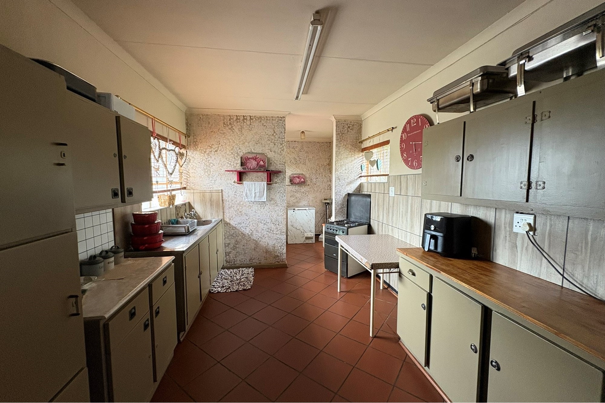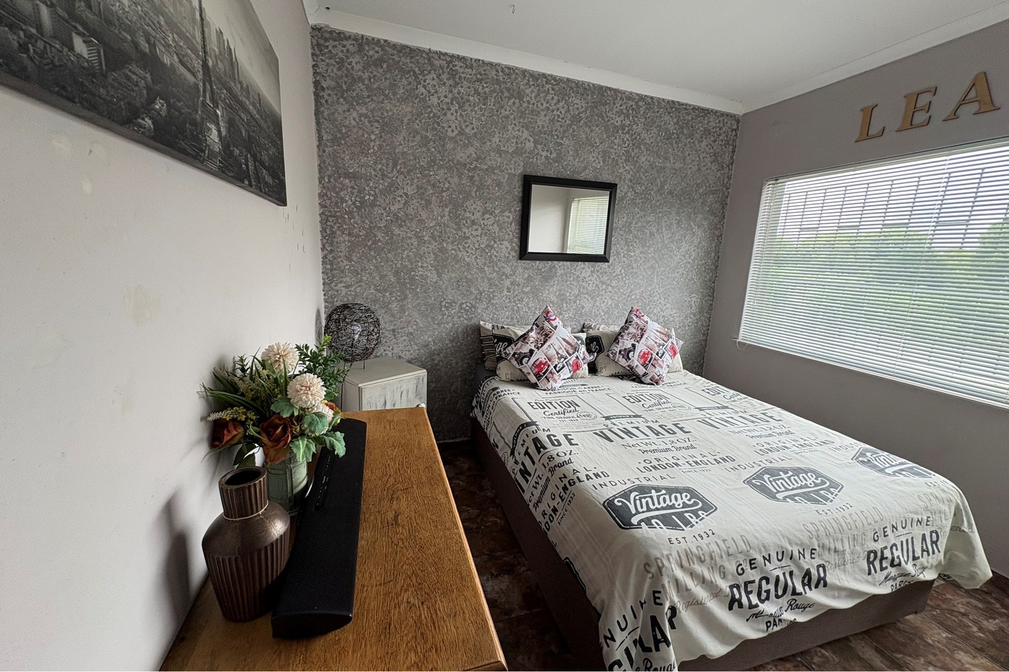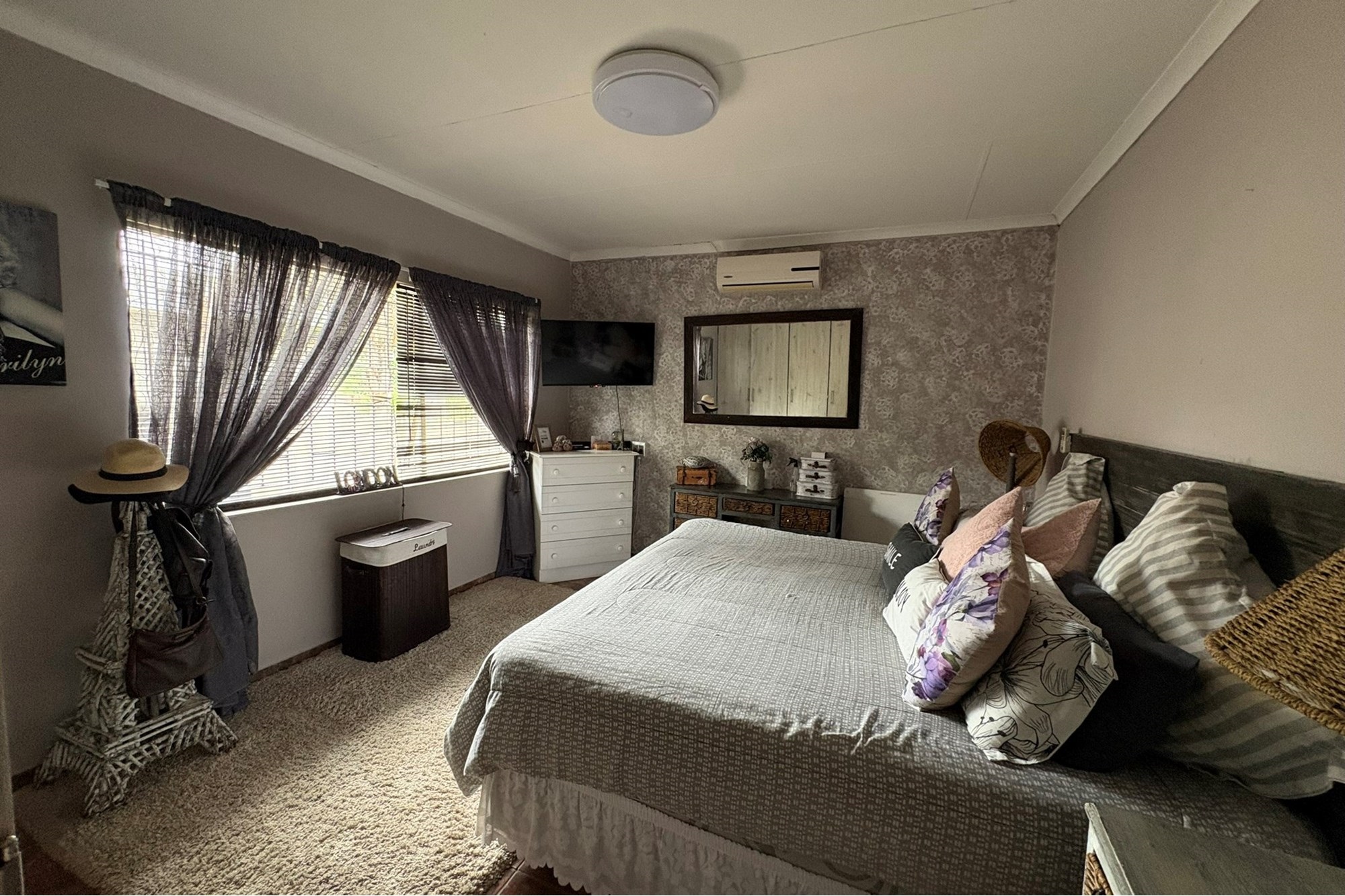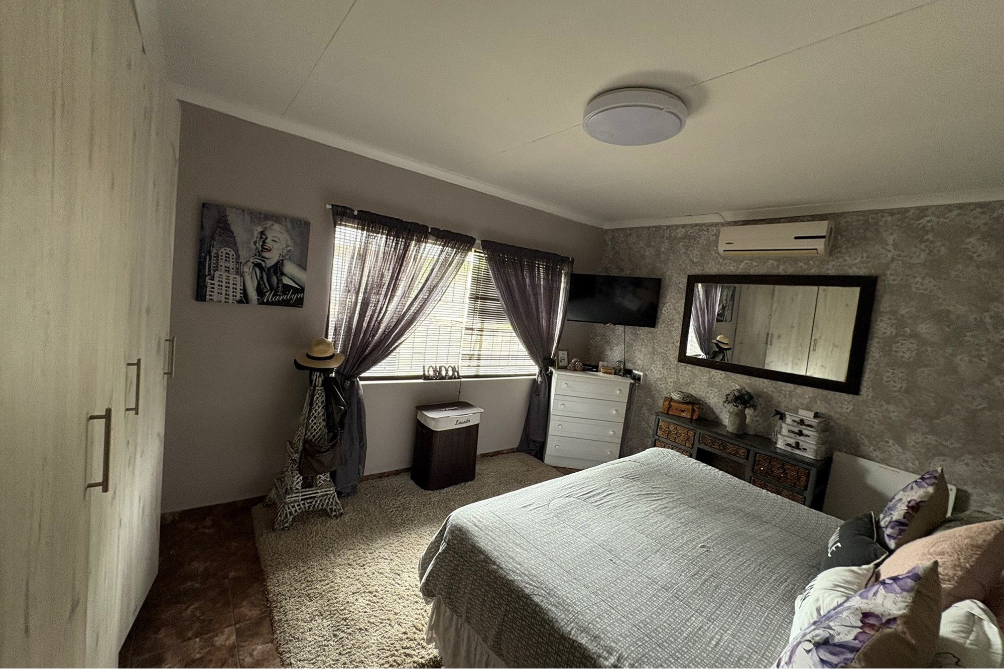 Inside, you`ll find elegant laminated flooring in the spacious dining room and lounge, enhanced by a ceiling fan for comfort. The bedrooms and corridor are tastefully tiled, with the main bedroom boasting air conditioning and the other two bedrooms equipped with ceiling fans. The bathroom has been updated with chic vinyl flooring and a modern ball-and-glow basin, combining sophistication with functionality.