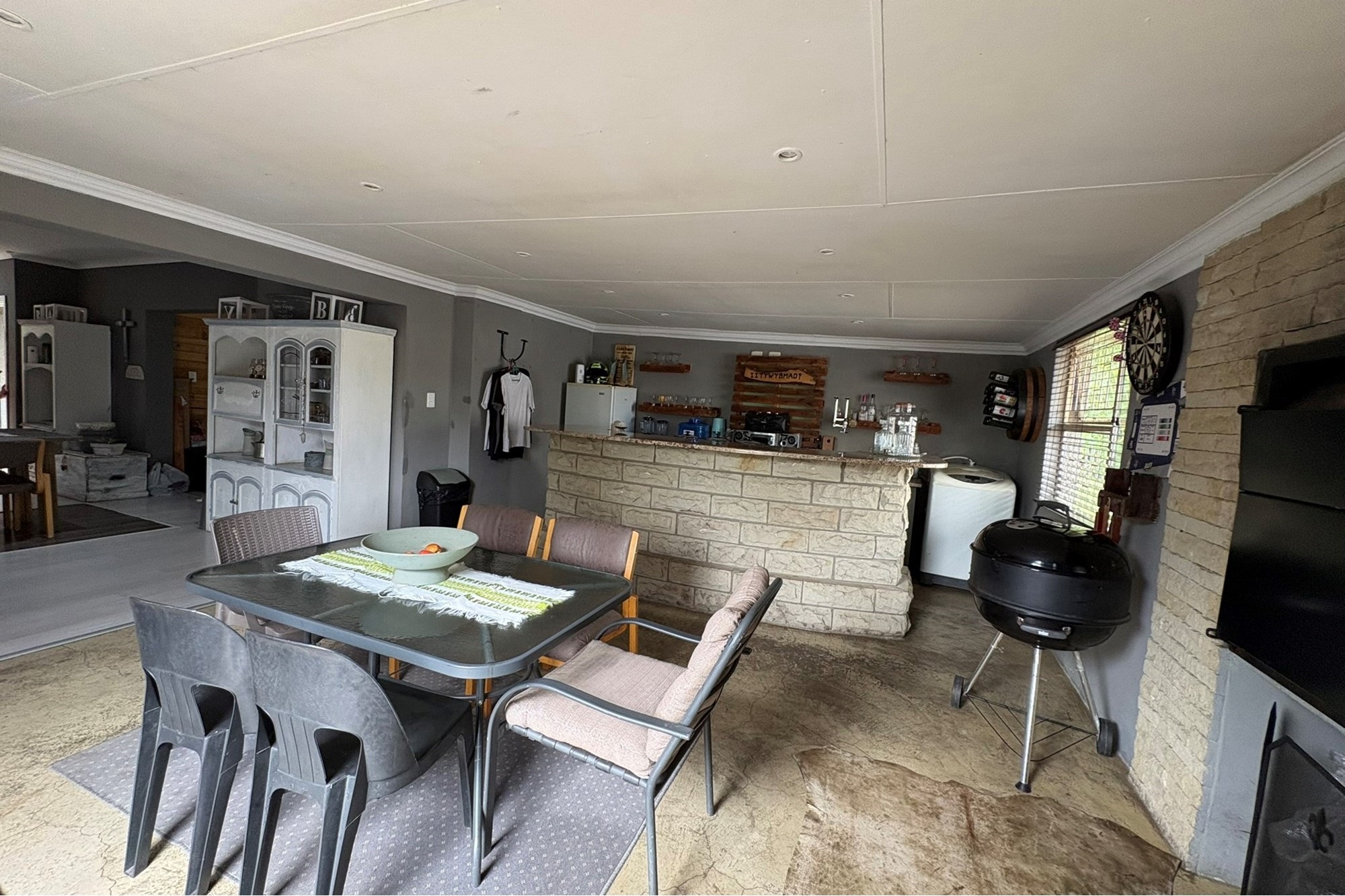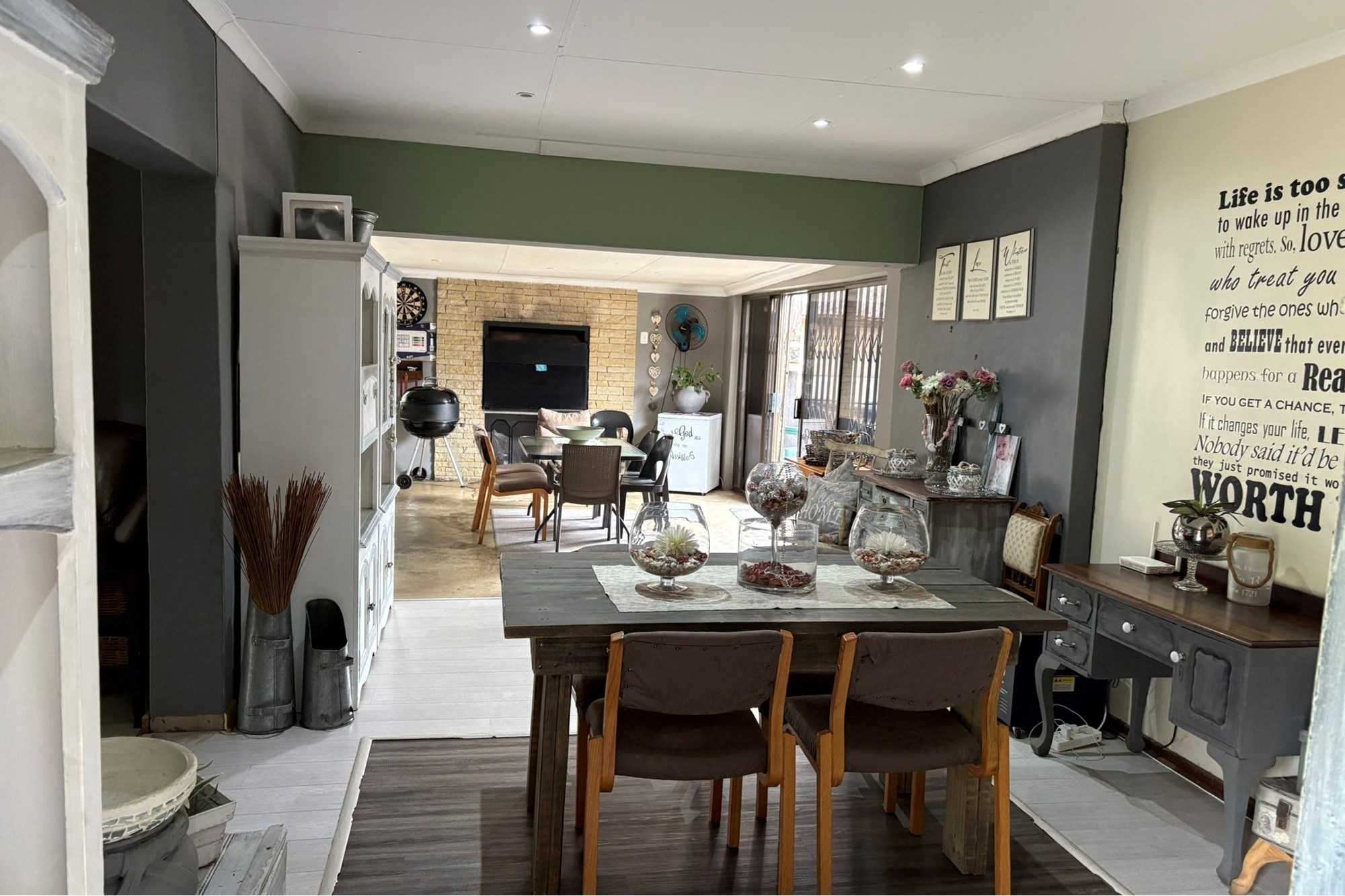 Natural light floods the lounge through large windows, creating a bright and welcoming ambiance, while custom-painted walls add a unique artistic touch throughout the home. For entertaining, the indoor braai and bar area is perfect for hosting family and friends.