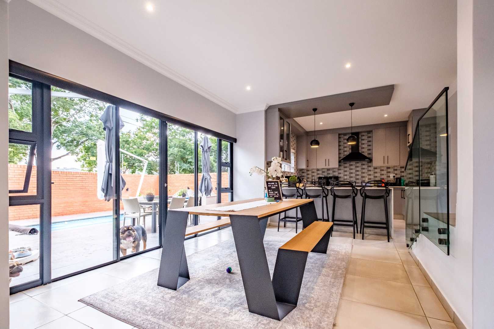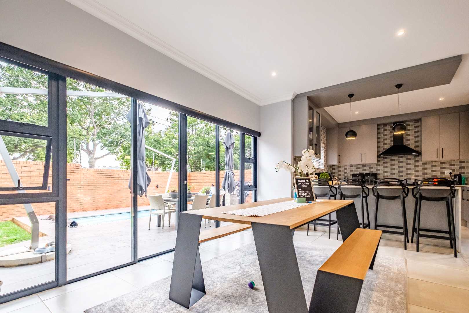 Entertain with ease in the spacious, tiled lounge area that includes a chic bar and entertainment space, seamlessly flowing into the lush garden and inviting pool. The dining room area is thoughtfully designed with stacker doors that open directly onto the pool area, perfect for indoor-outdoor living and entertaining.