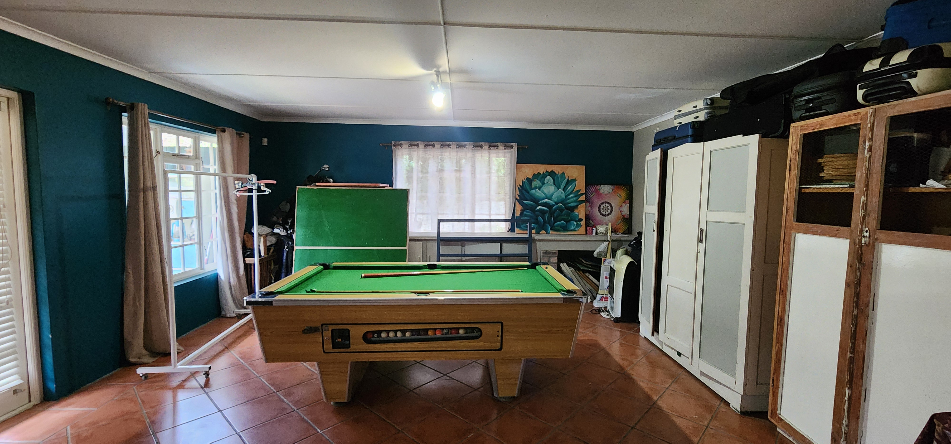 The home includes 4 spacious bedrooms and 3 bathrooms, along with two inviting lounges and a small office space—ideal for working from home. The country-style kitchen is the heart of the house, complete with a traditional Dover stove. A generous entertainment area is currently used as a pool room, creating the perfect space for gatherings.