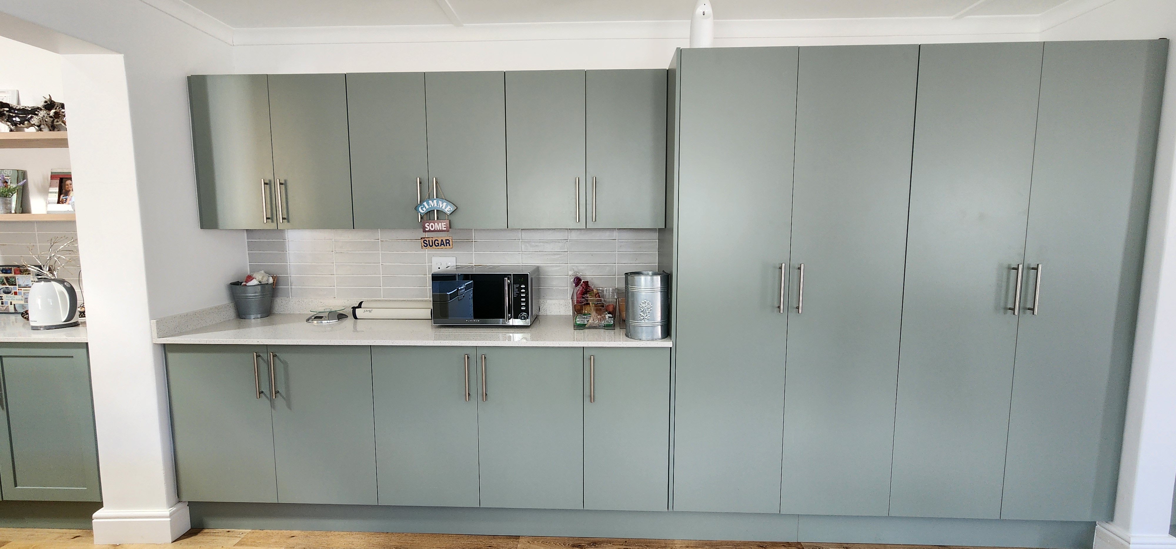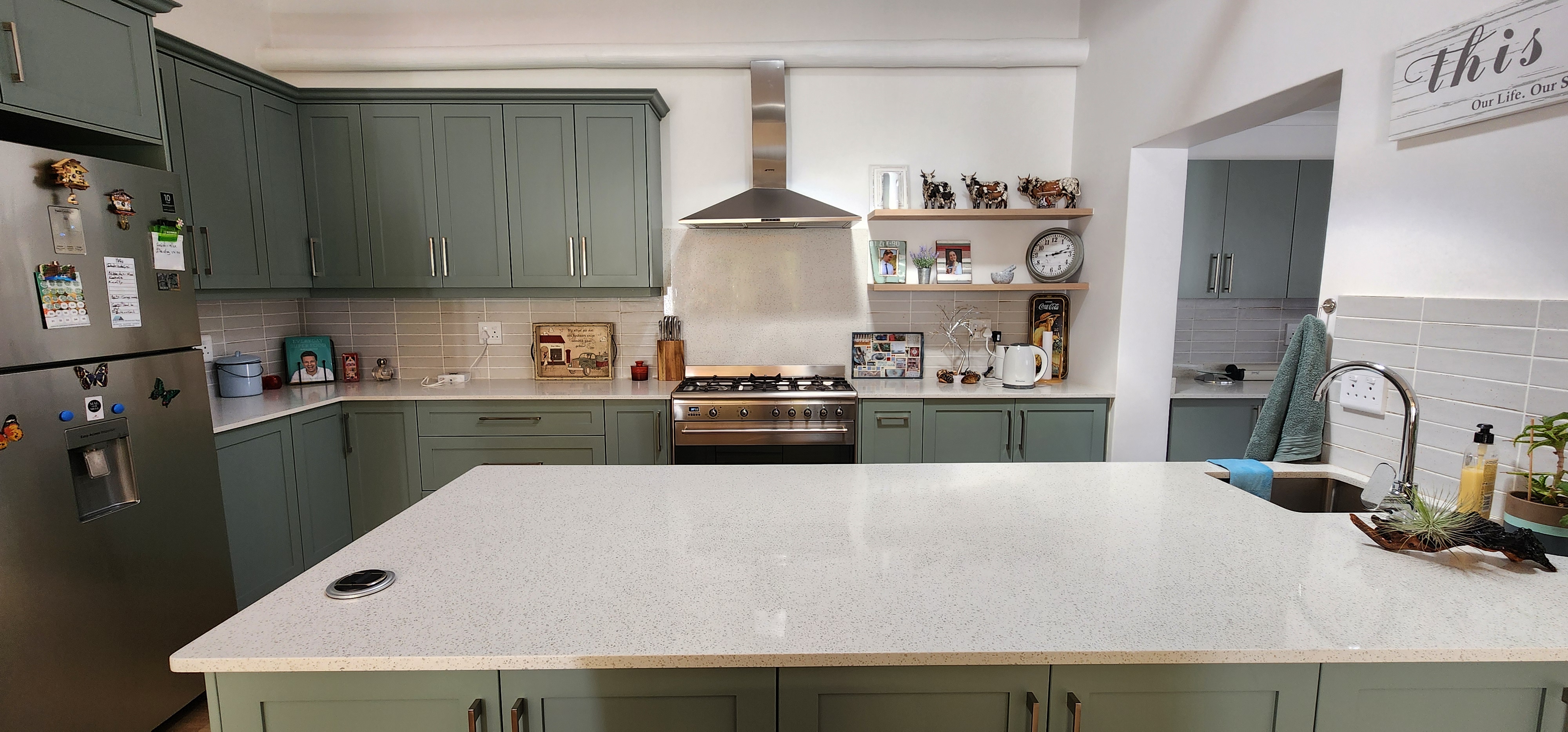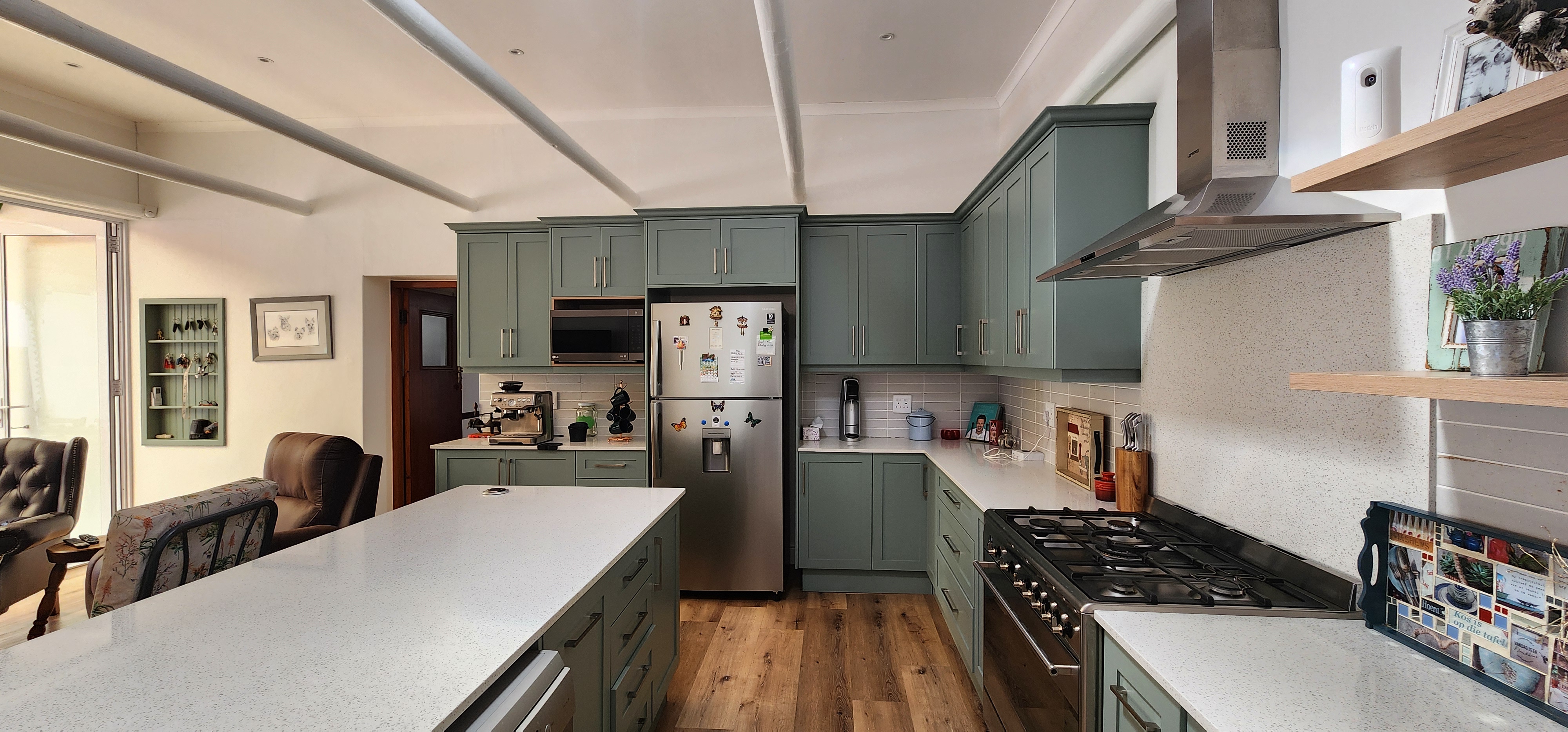 The kitchen is a chef’s dream, boasting abundant workspace, a centre island for family gatherings, a gas hob, breakfast counter, pantry, and separate laundry room.