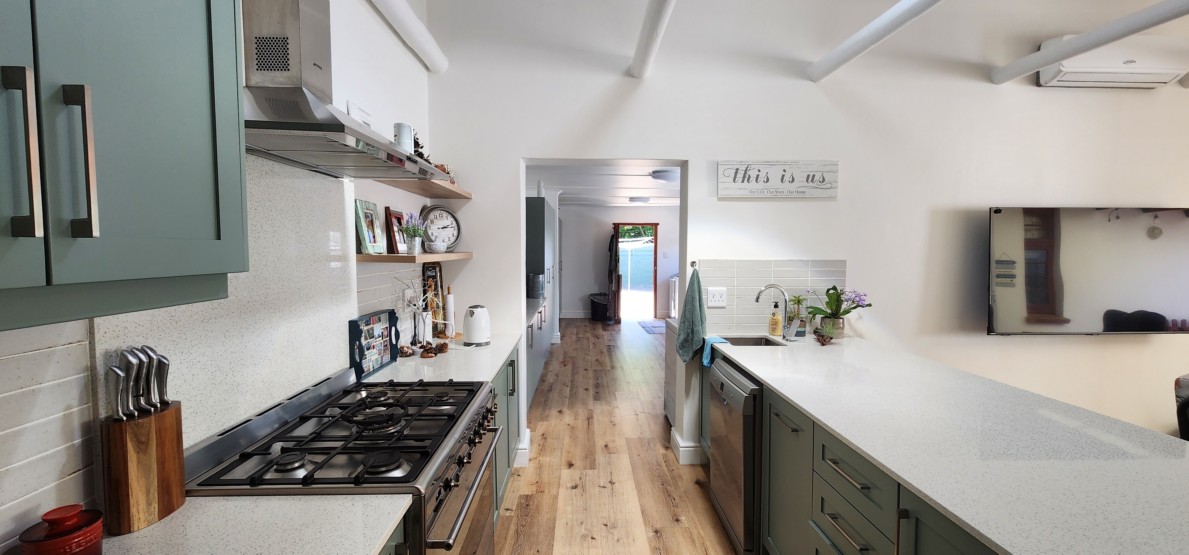 With beautiful wooden floors throughout, this elevated 3-bedroom, 2-bathroom home offers relaxed family living in absolute style. The layout maximizes natural light, mountain views, and the lush, landscaped garden.